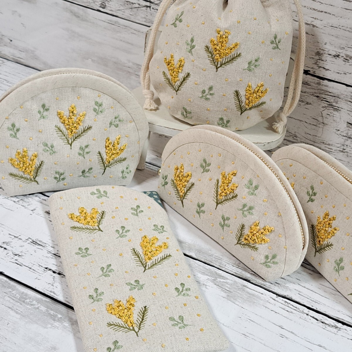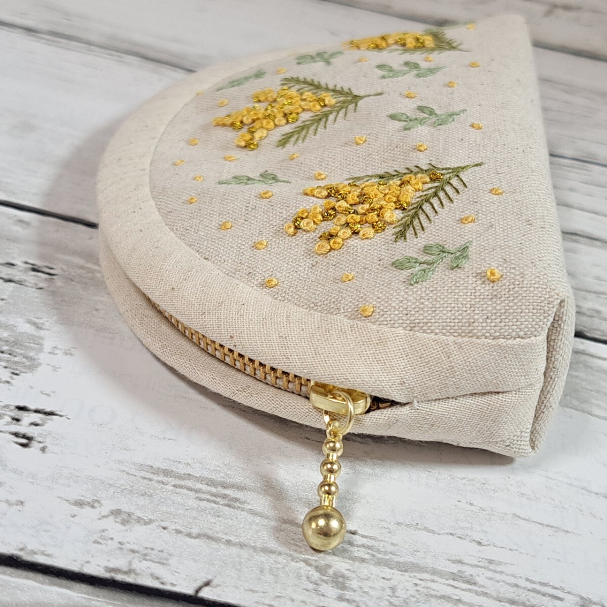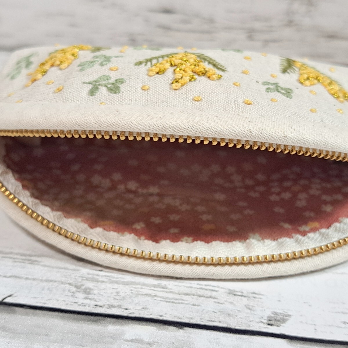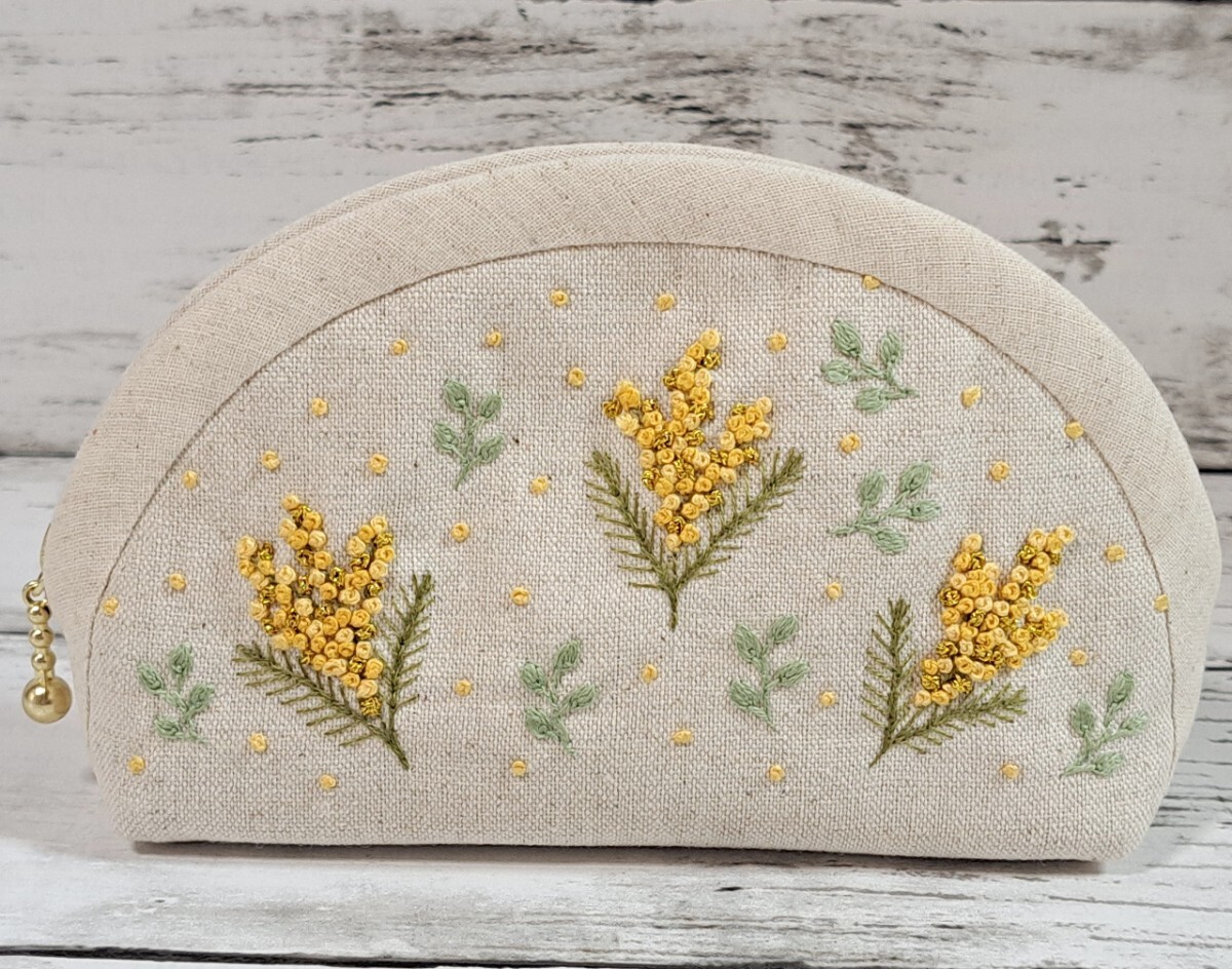 ミモザの手刺繍入り、ファスナーポーチの出品です。