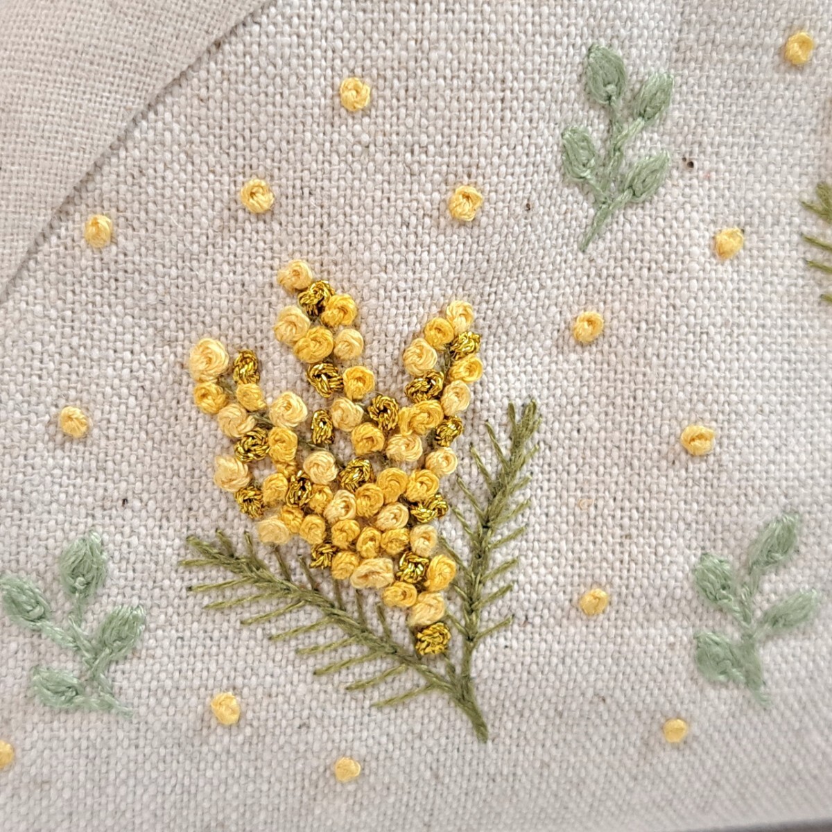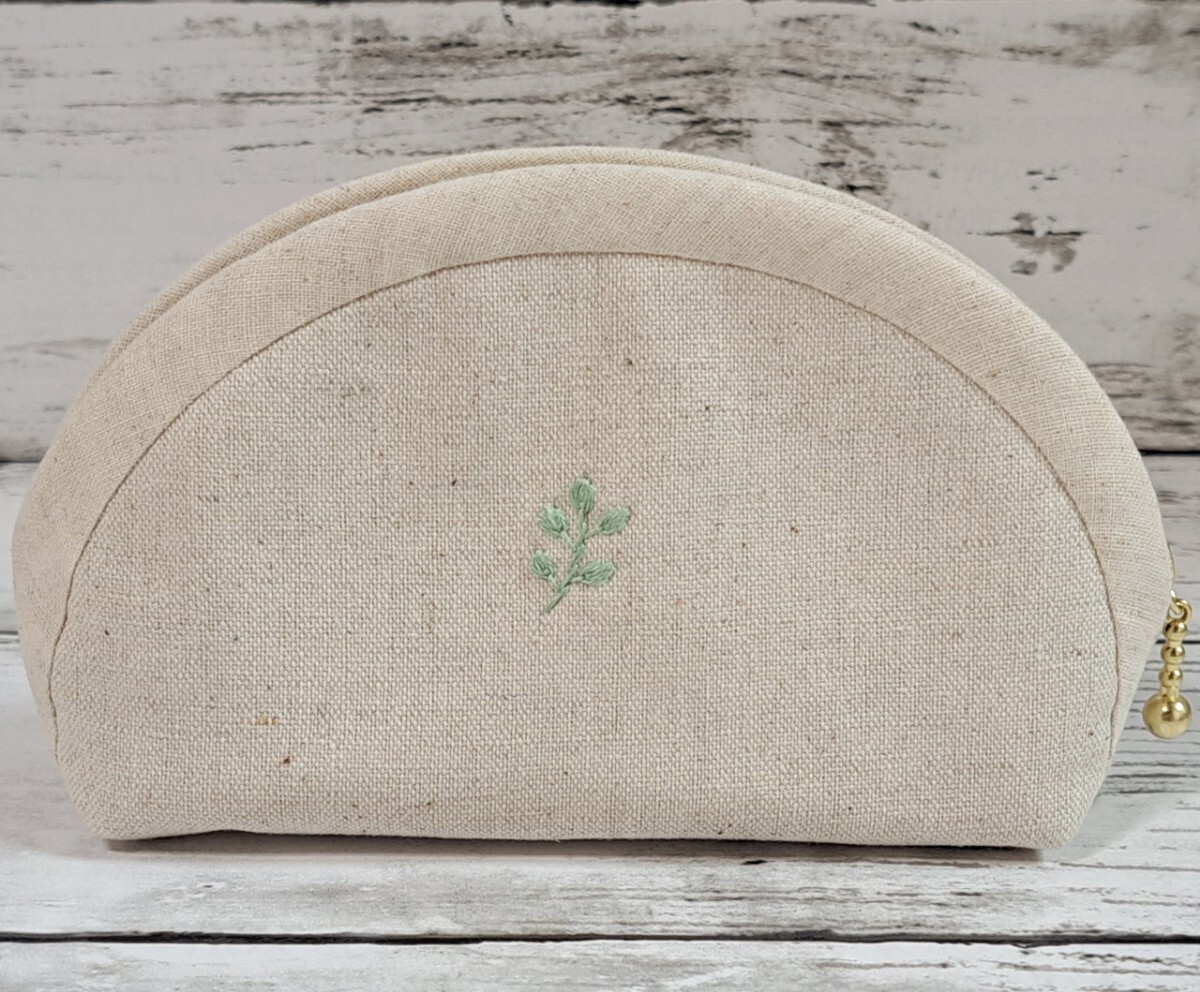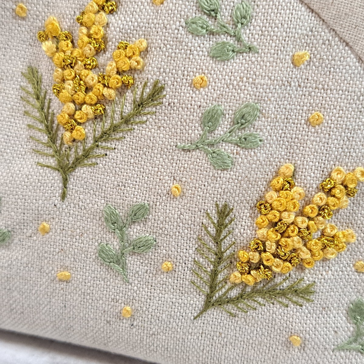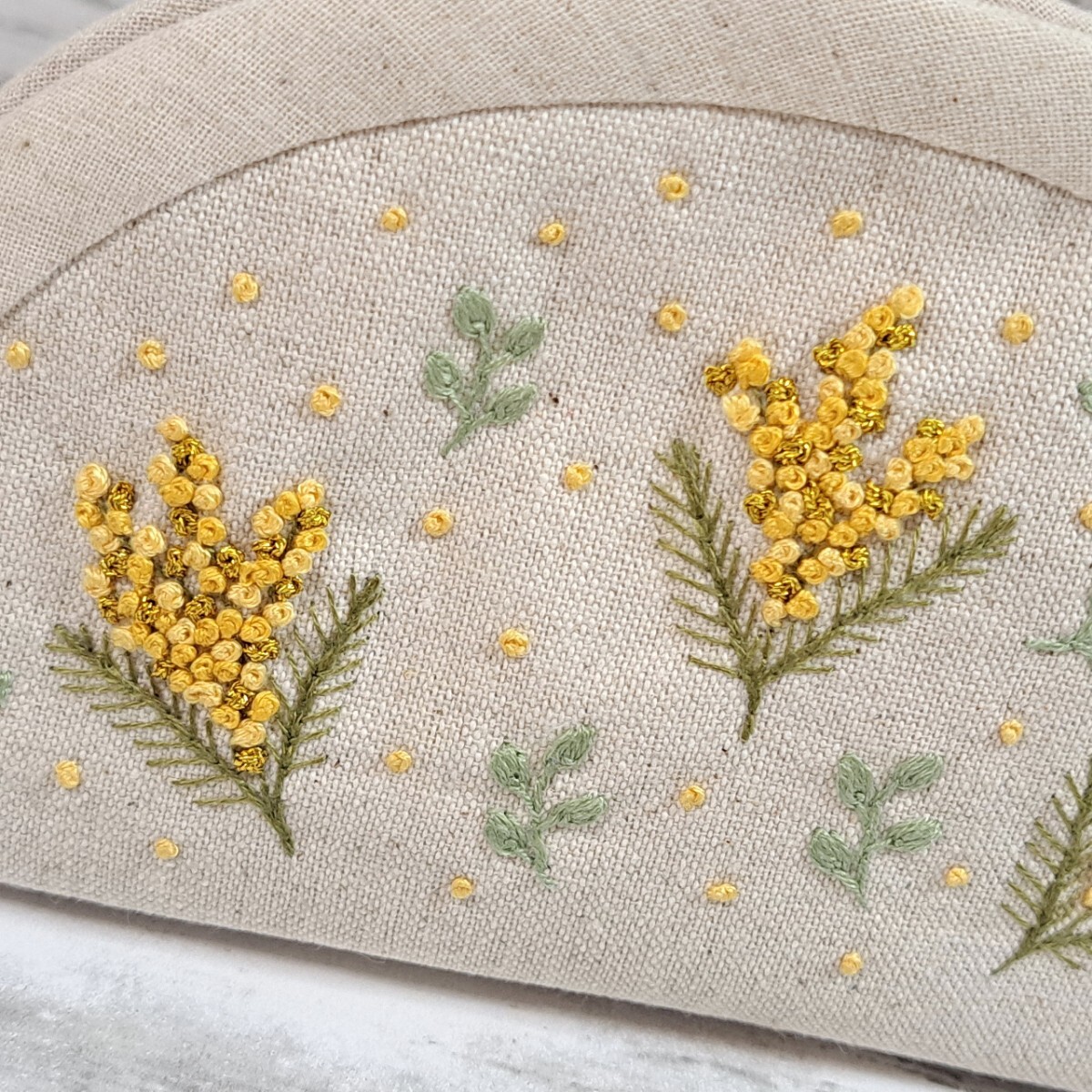ミモザの手刺繍入り、ファスナーポーチの出品です。