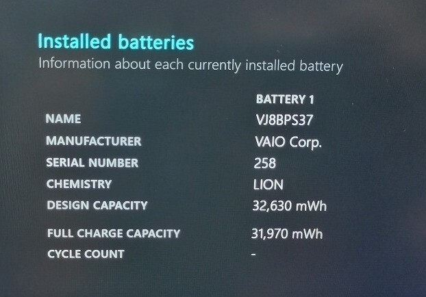 | 状態 | VJ8BPS37 7.5V 4125mAH 31Wh VJS131C11NにてWin11 輝度中で簡易確認しました 表示はその際の時間で、使用環境によって異なると思います Battery Reportで31970 / 32630mWh表示です |