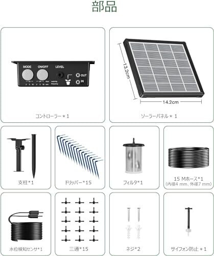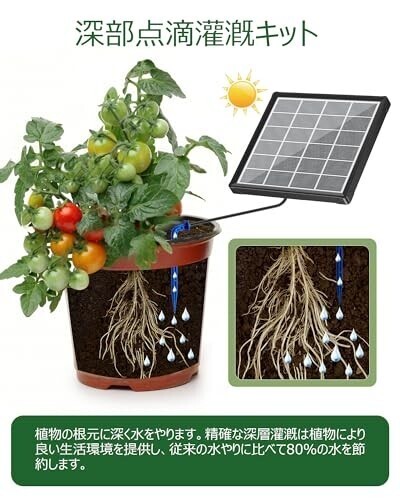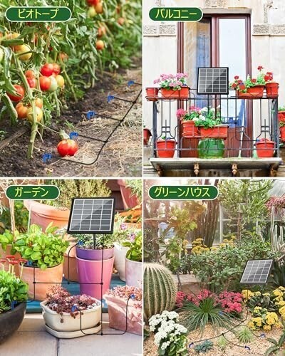 太陽光で動くポンプが水タンク(別売り)からチューブを通して複数のノズルに自動配水目的と規模に応じた水やりを実現出来します。