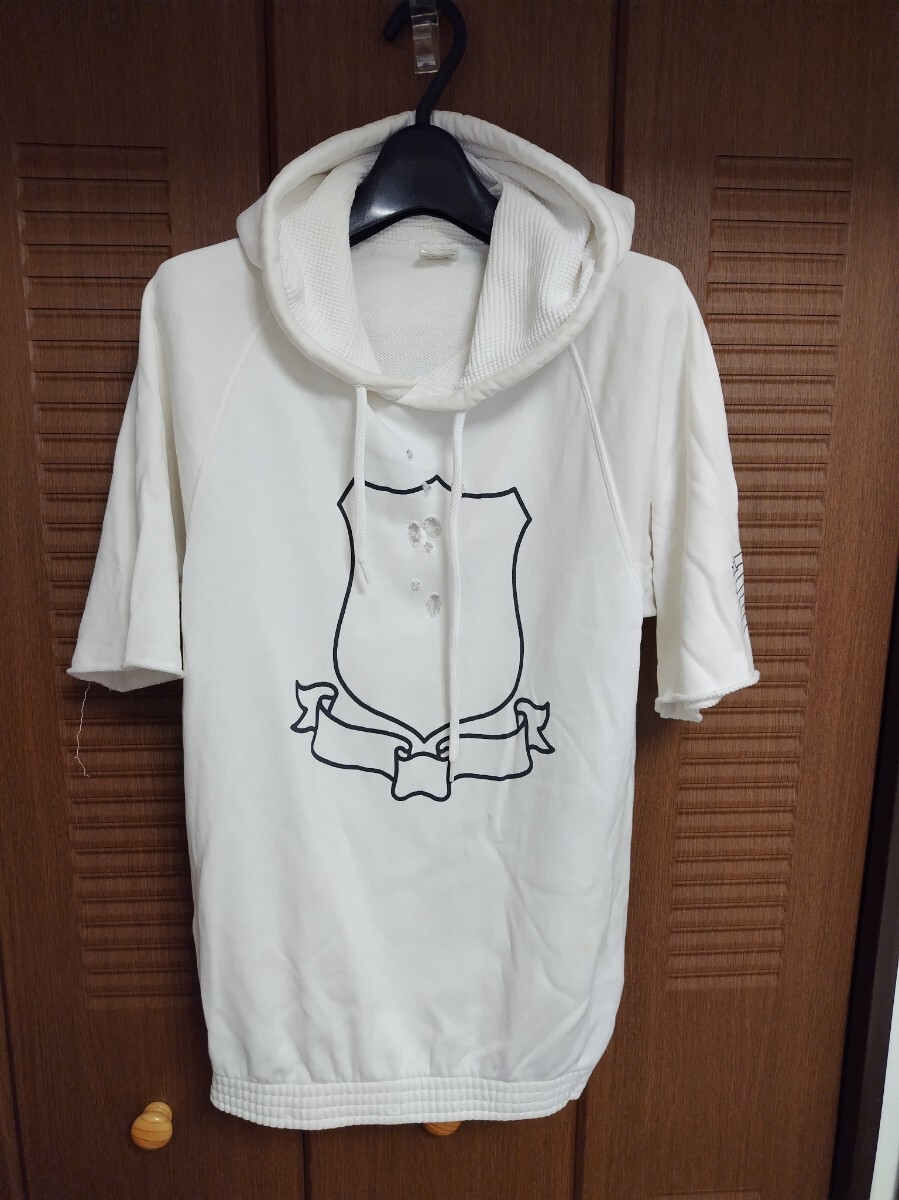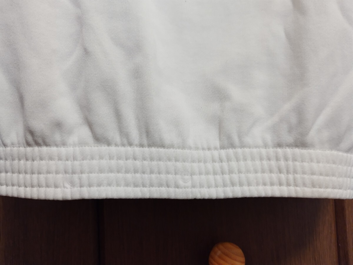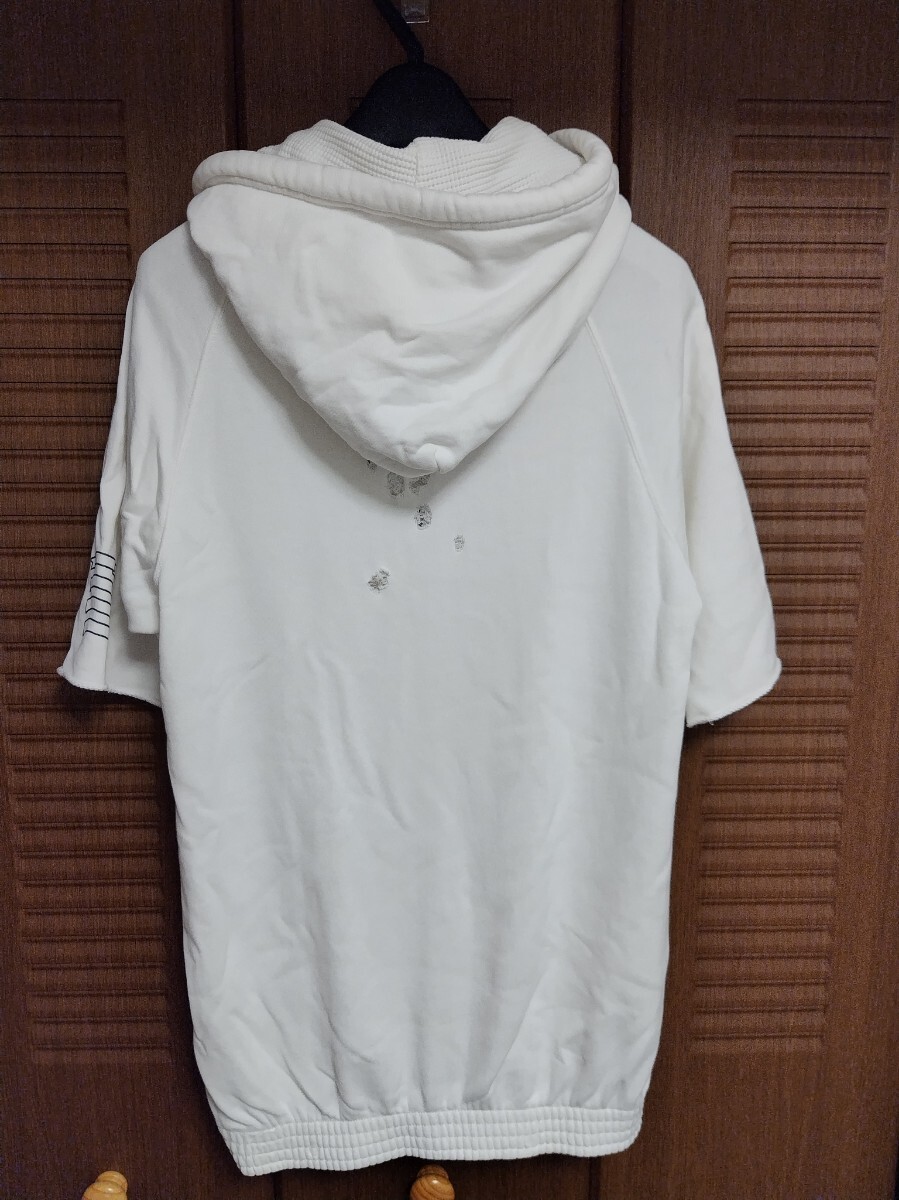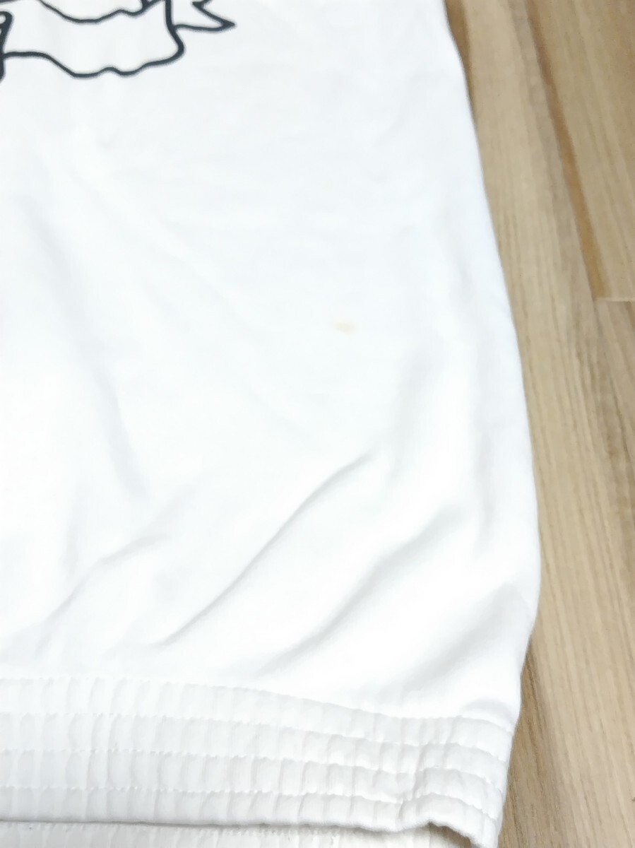 状態はホワイトということもあり首元や前身頃に薄シミが見られます。