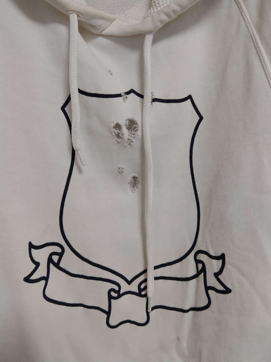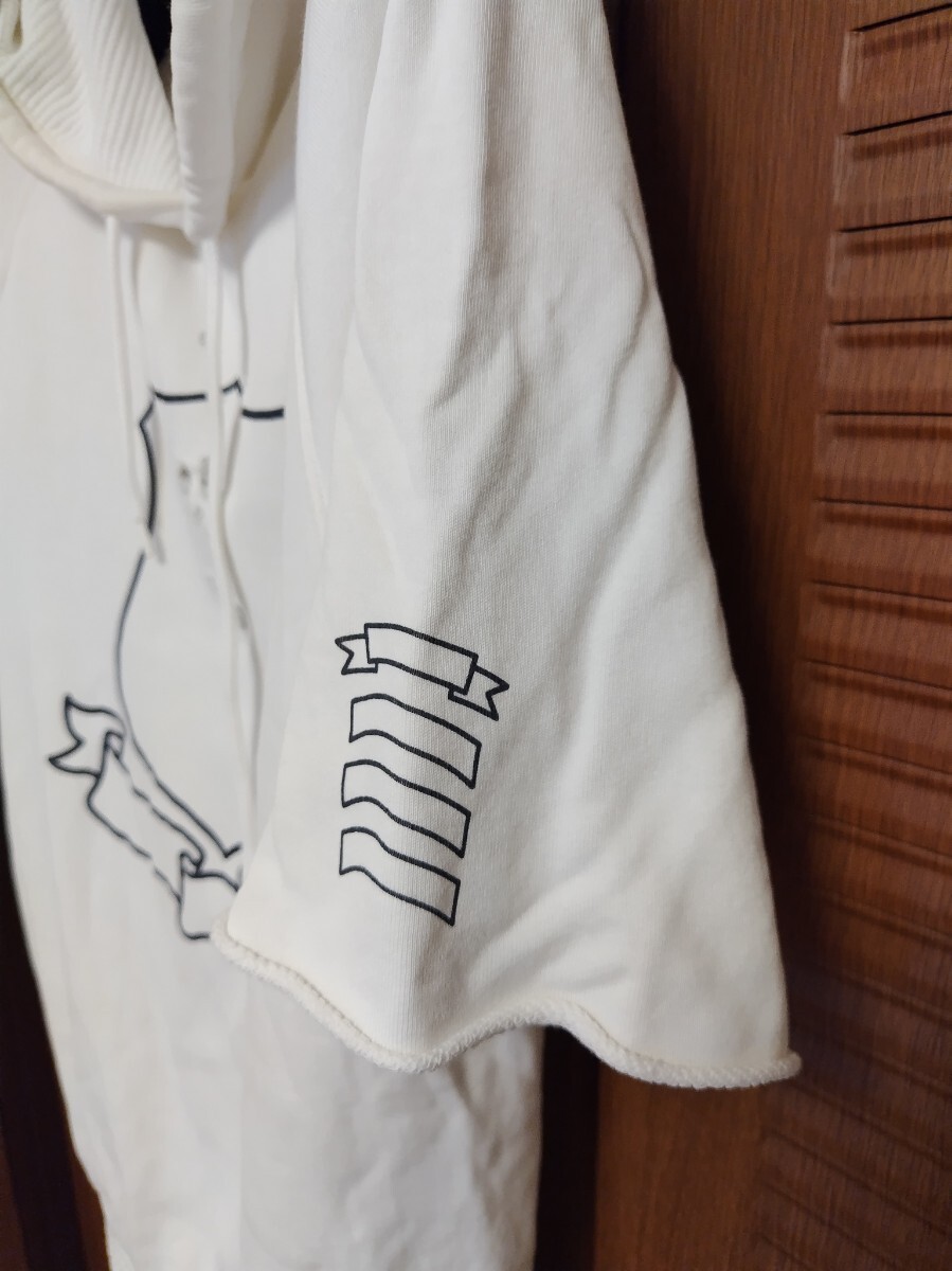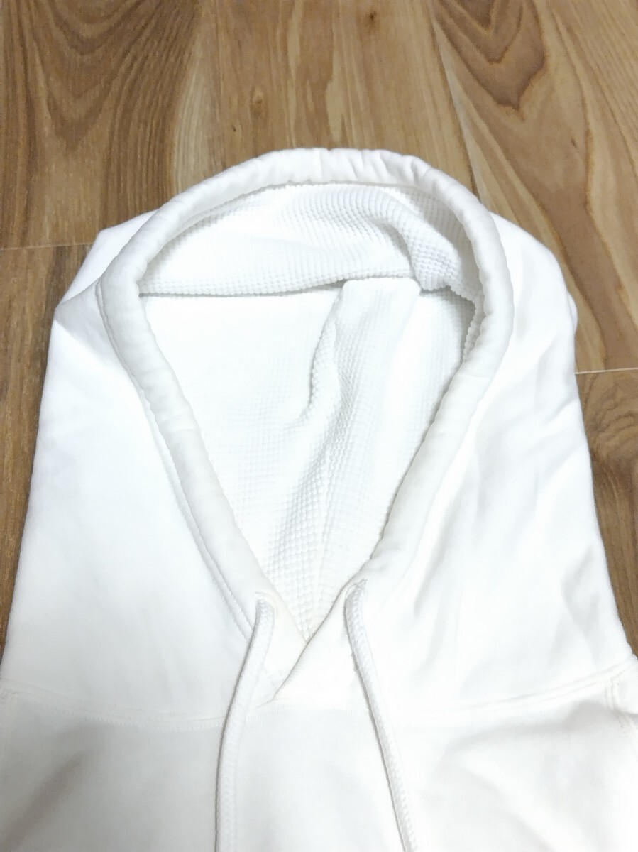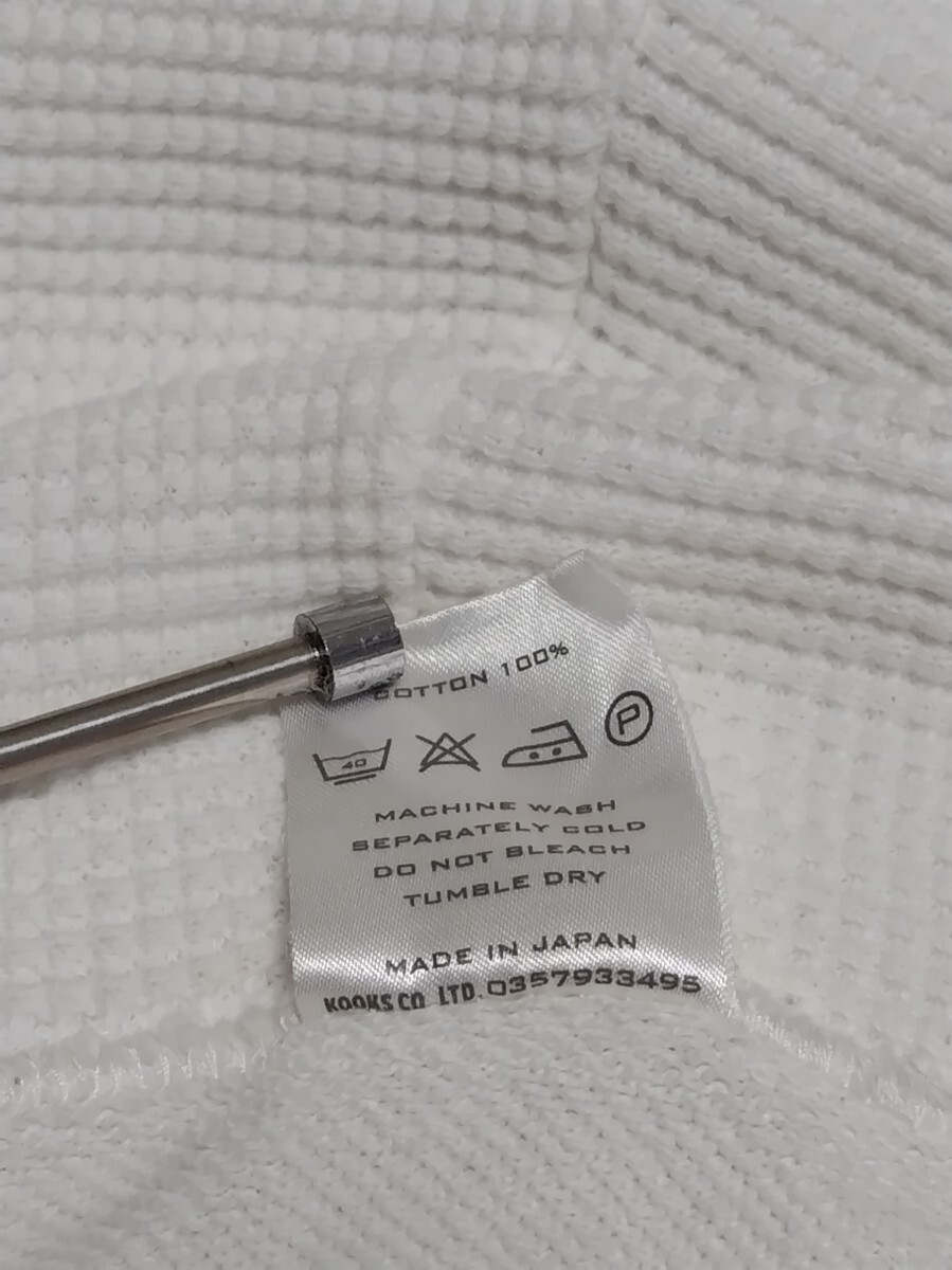状態はホワイトということもあり首元や前身頃に薄シミが見られます。