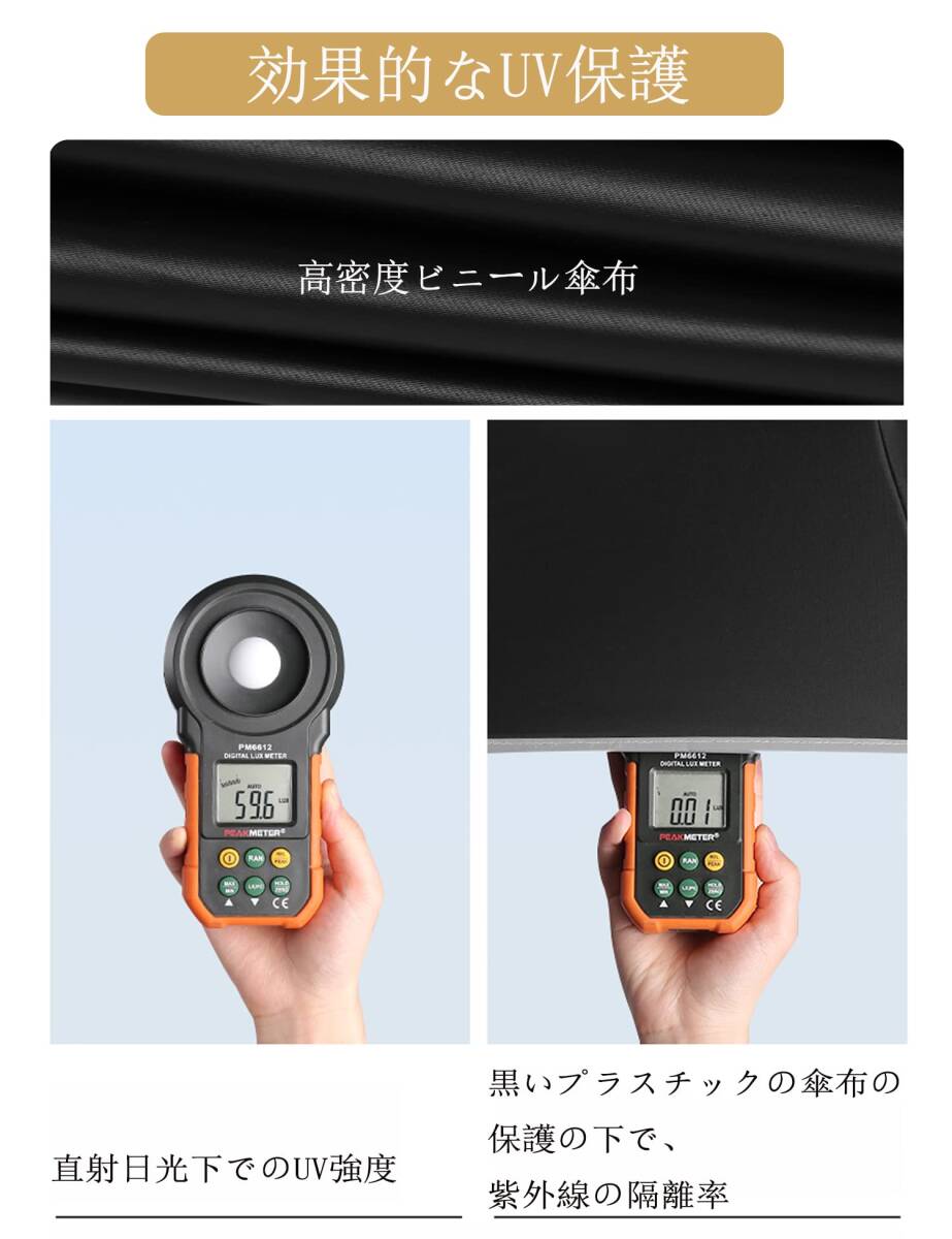 • 【優れた防風と防水】:強い風にも耐えられる防風傘は12本強化グラスファイバーリブ補強、頂幕は高密度210T防水素材を採用し、防水性が良いです。付着した雨水は生地に染み込まずしっかり弾くので、軽く振るだけで水滴を払い落とせます。同時に,遮光遮熱コーティングが施され、光を通さずUVカットしてくれて紫外線遮蔽率99%以上、日焼けから守ってくれます。