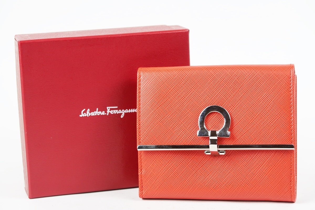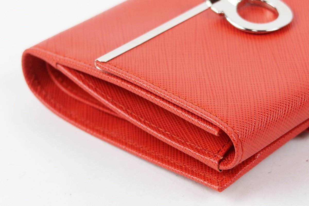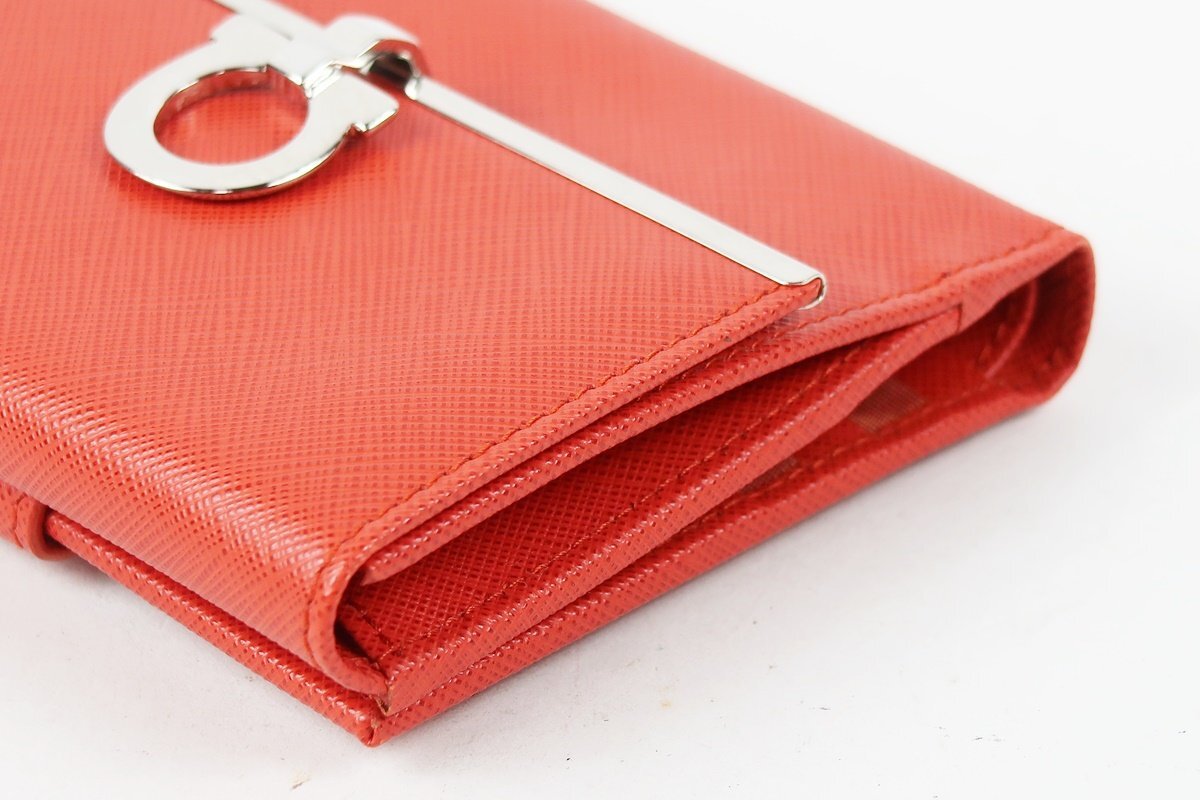 【新品同様・未使用】Ferragamo フェラガモ ガンチーニ 二つ折り長財布 オレンジ系×シルバー金具【TG25】 |