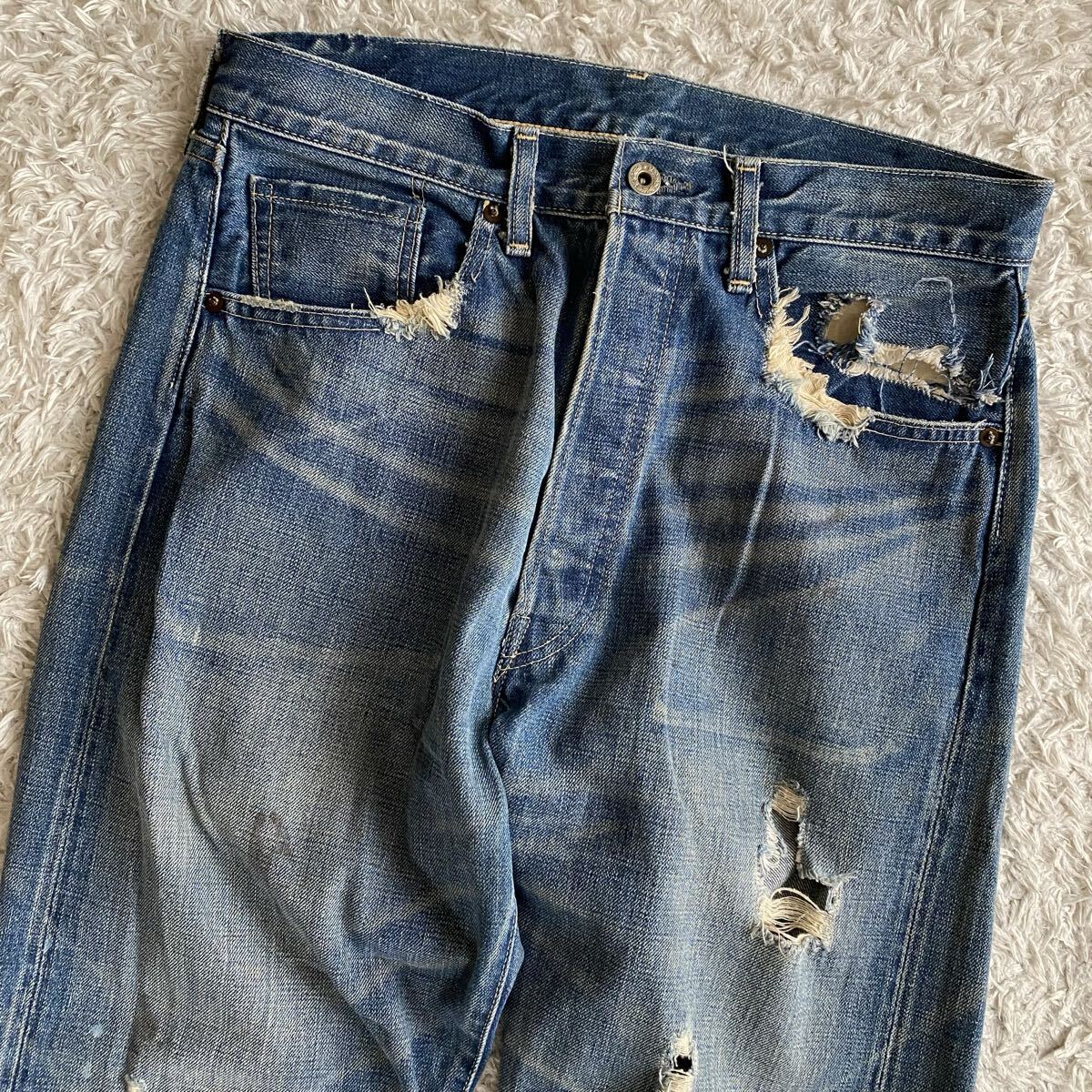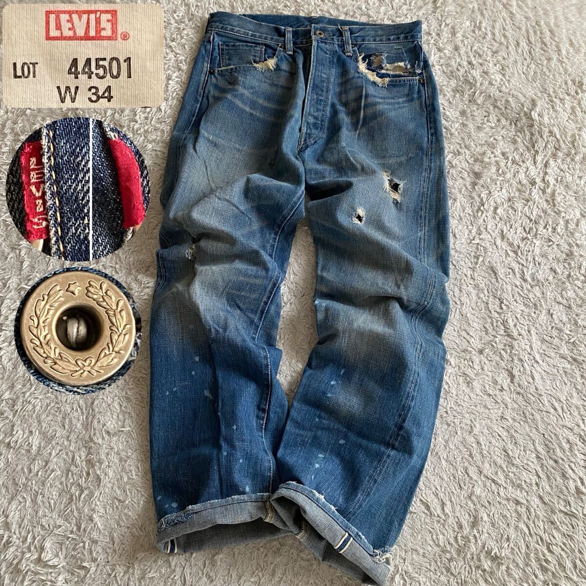 大戦モデル 40s復刻 S501XX 44501 片面bigE WWII 44年モデル 月桂樹 ドーナツボタン 赤耳セルビッジ セルビッチ ダメージ加工 ヴィンテージ加工 ビンテージ USED加工 ユーズド グランジ デニム ジーンズ ジーパン Gパン パンツ ボトムス カイハラデニム