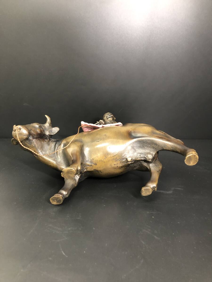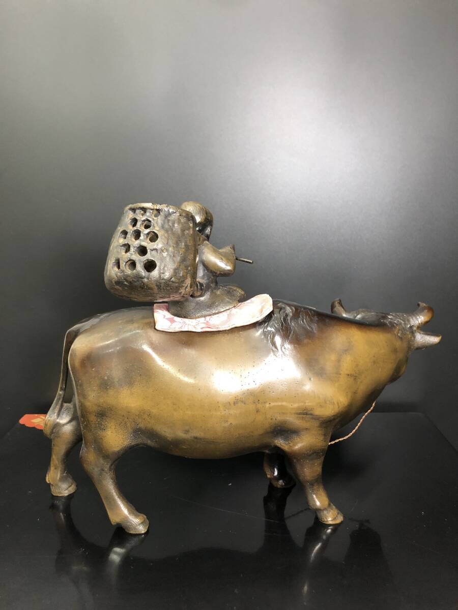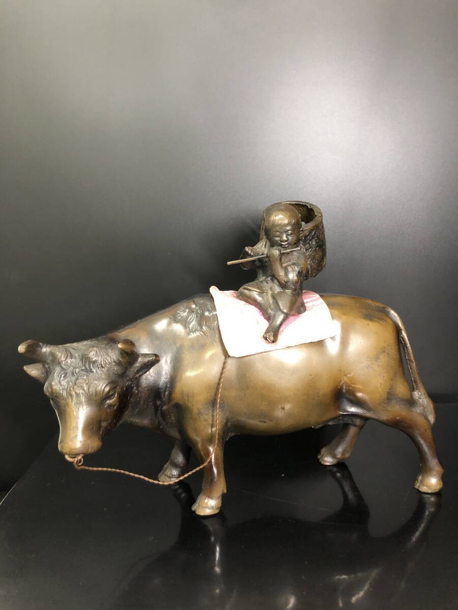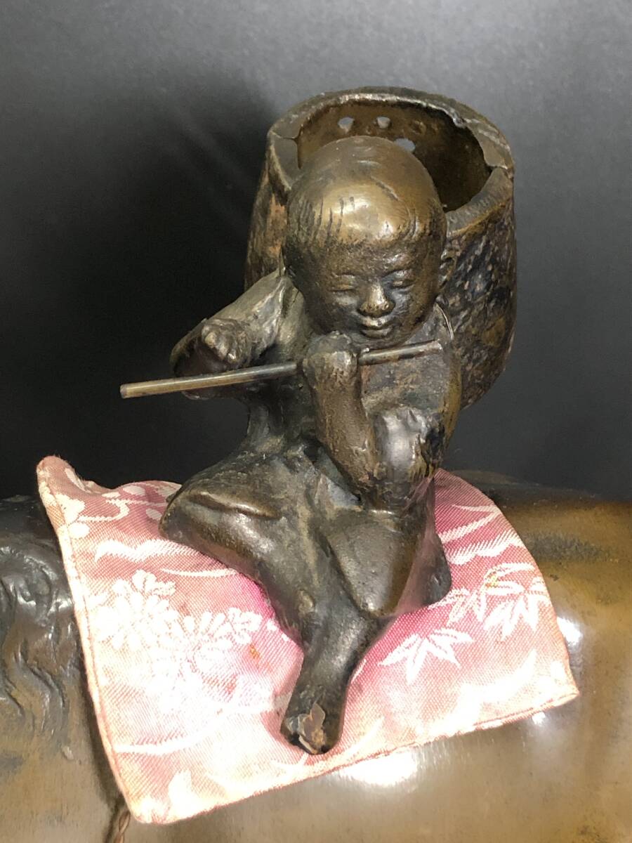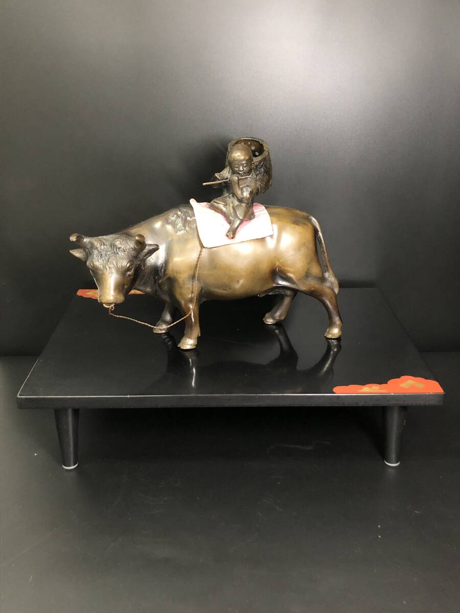 【置き台付】鉄製 笛吹童子 騎牛帰家 置物 丸三漆器製 秀衡塗 置台 金属工芸 漆器 オブジェ