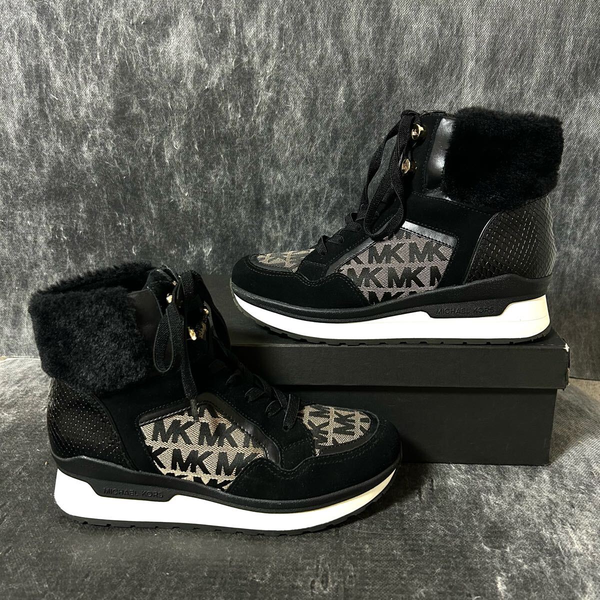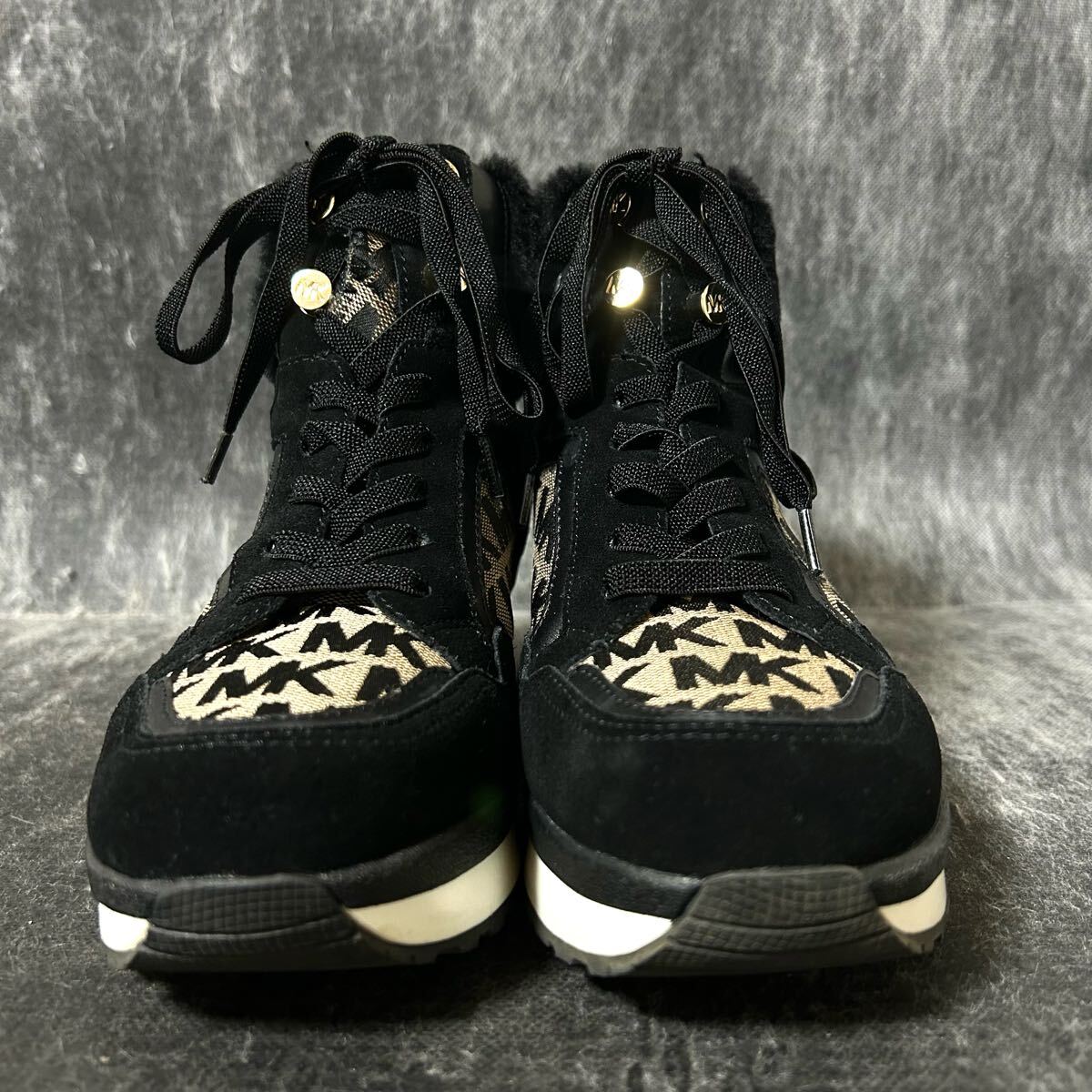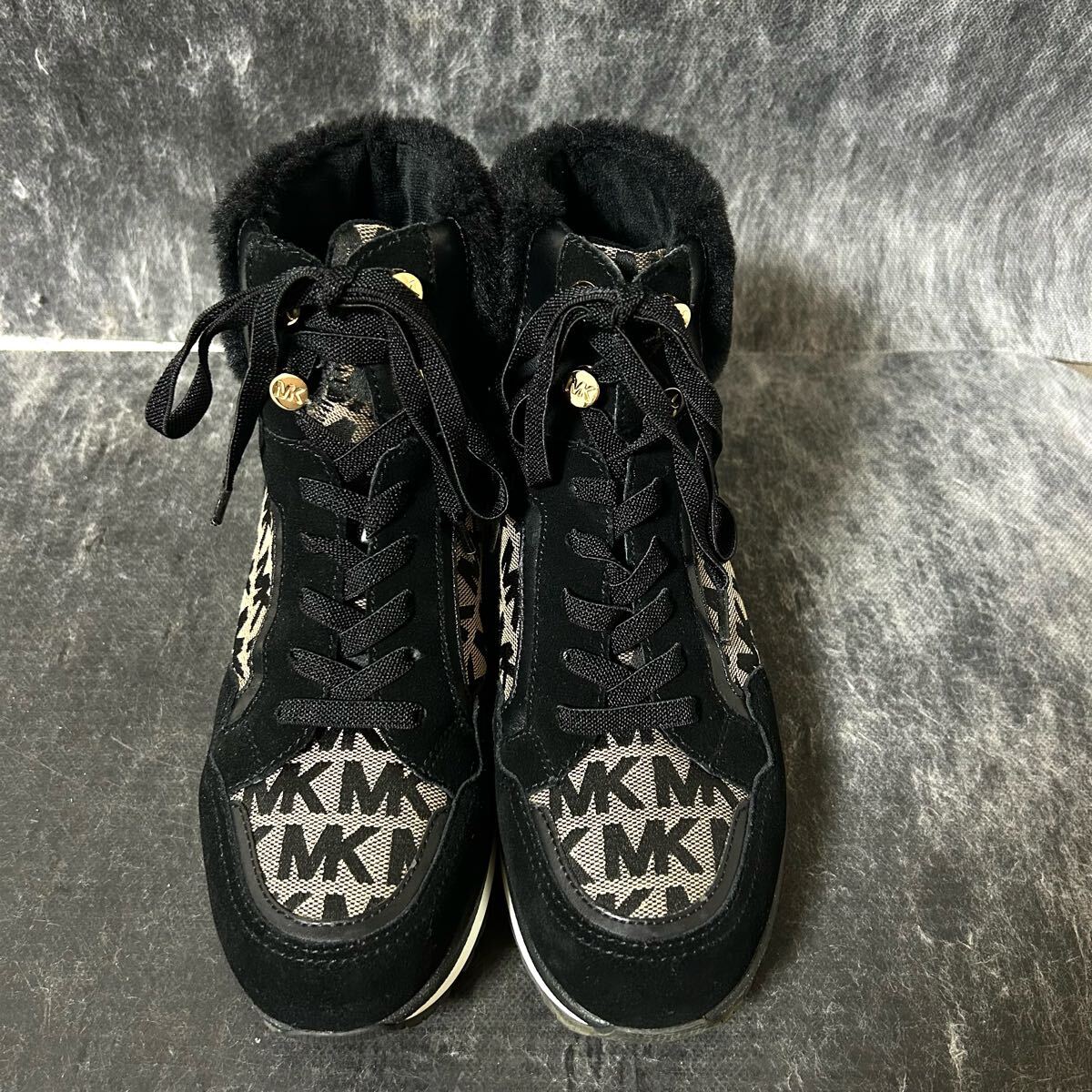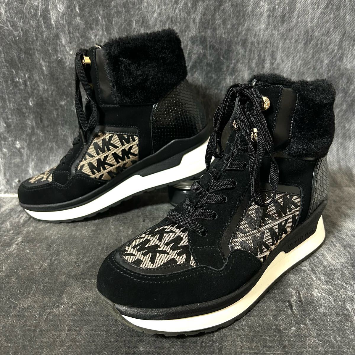 【美品】MICHAEL KORS マイケルコース スニーカー キャンバス×スエード 総柄 ファー 7 24cm相当 ブラック *EO