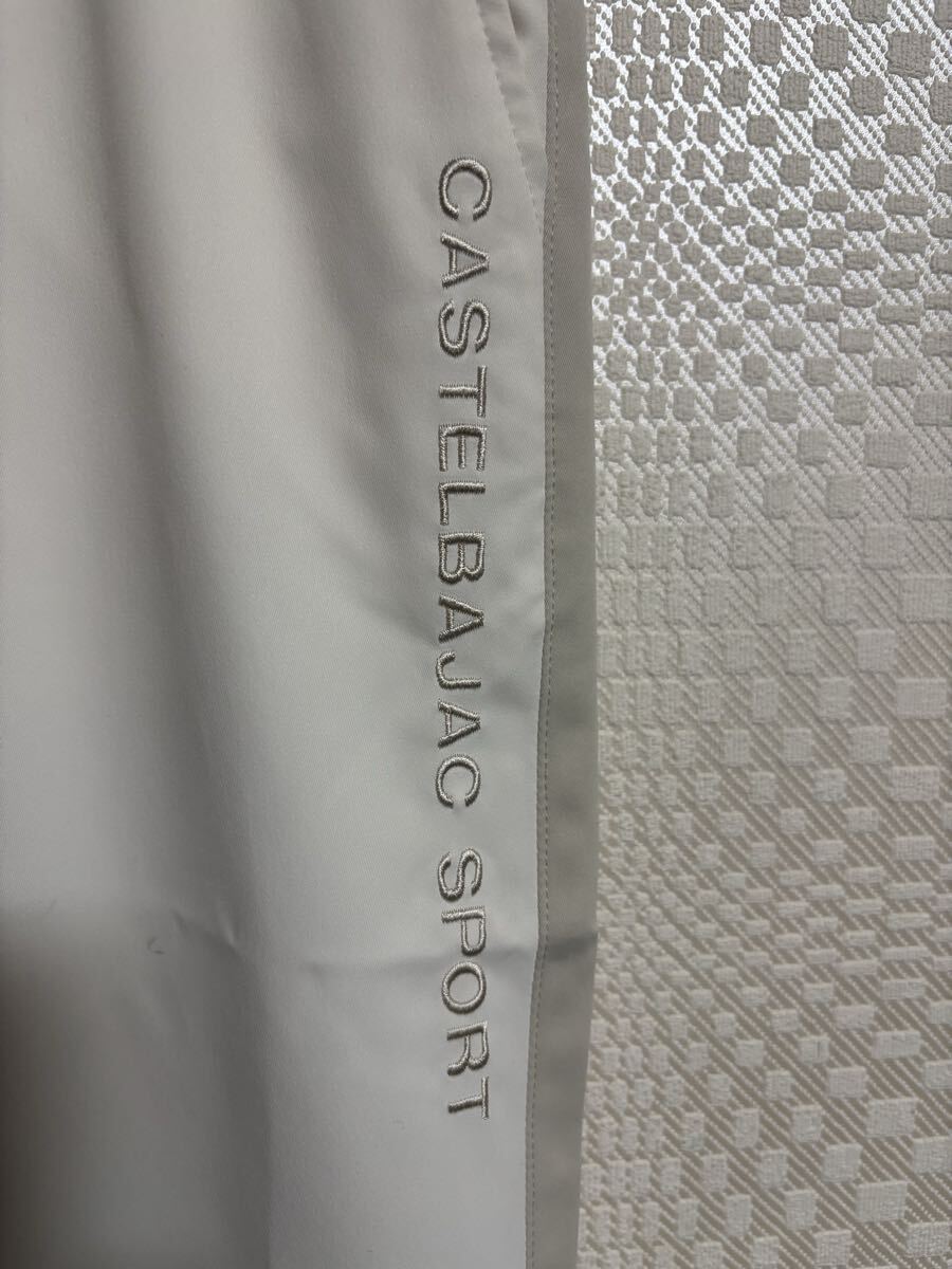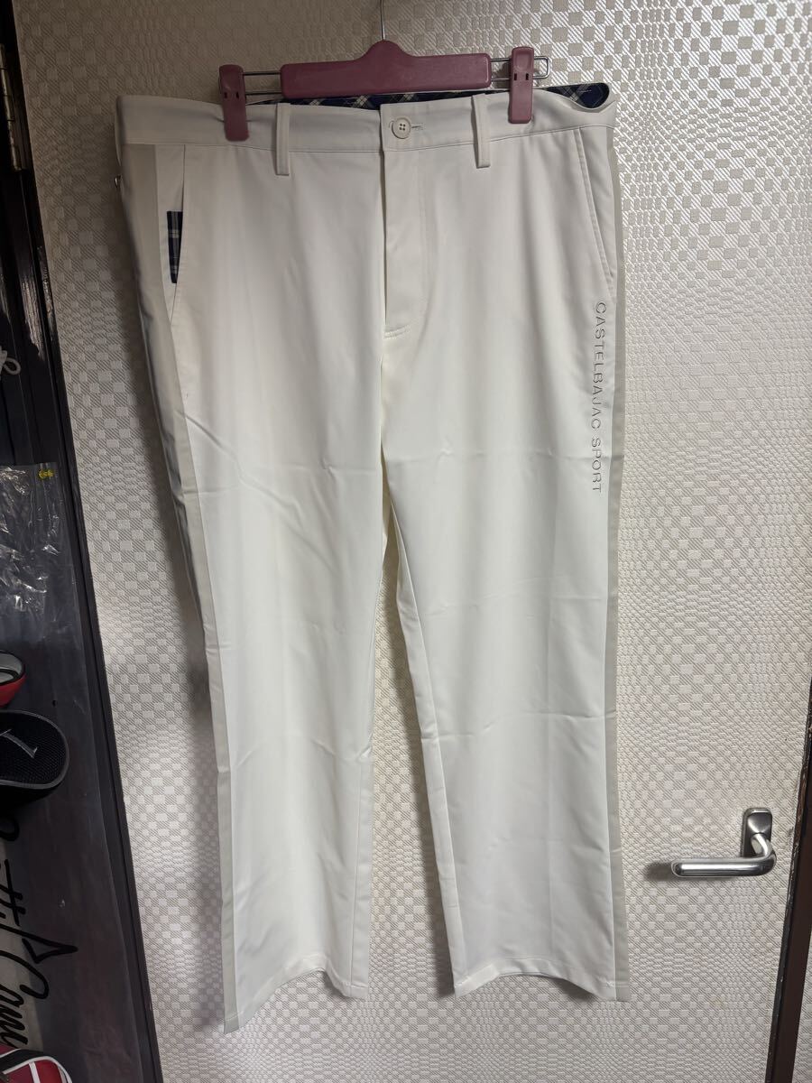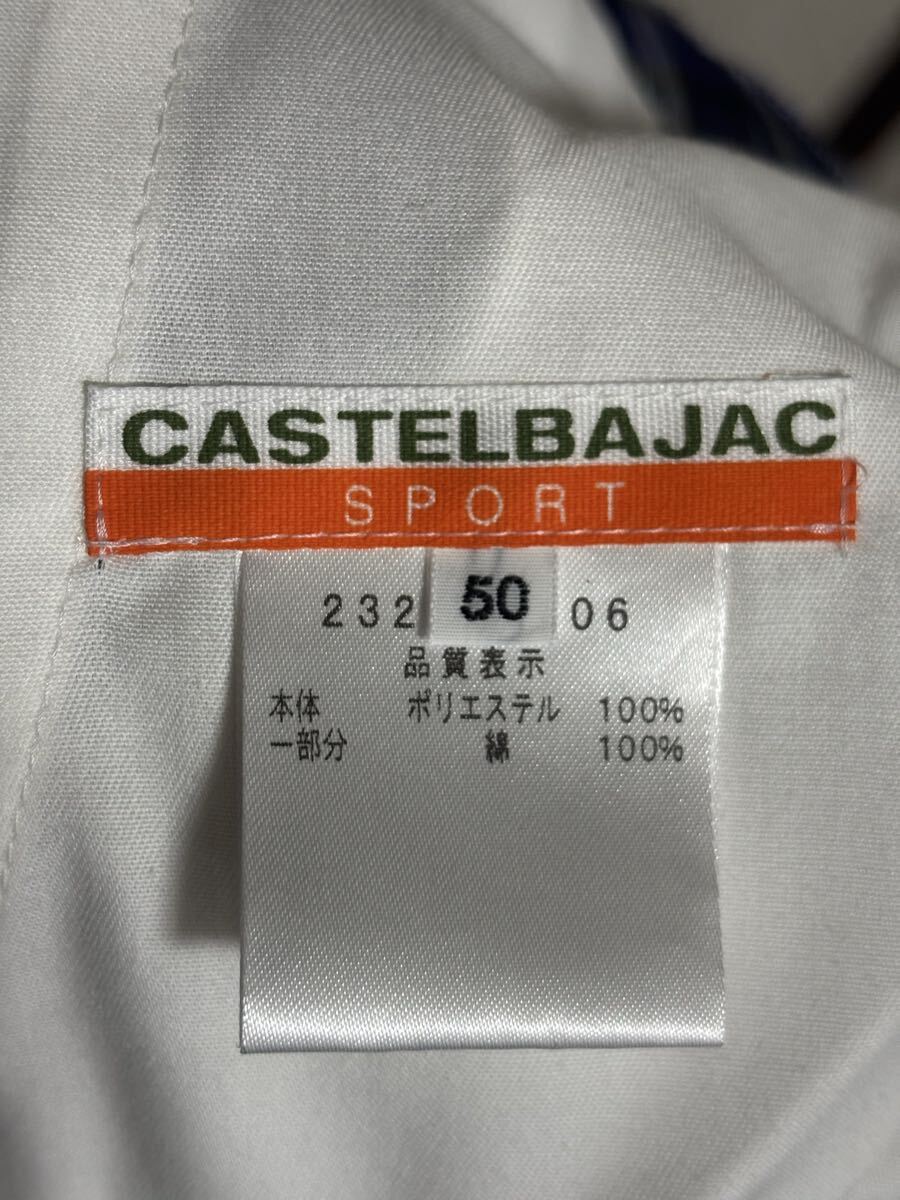 カステルバジャック のポリエステル製ドライパンツです。サイズ50表記で平置きウエスト46股下75裾幅23.5全長100センチ位です。