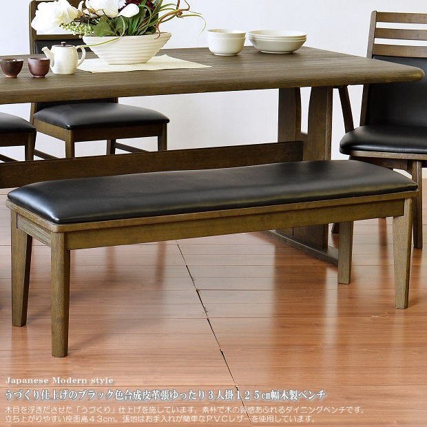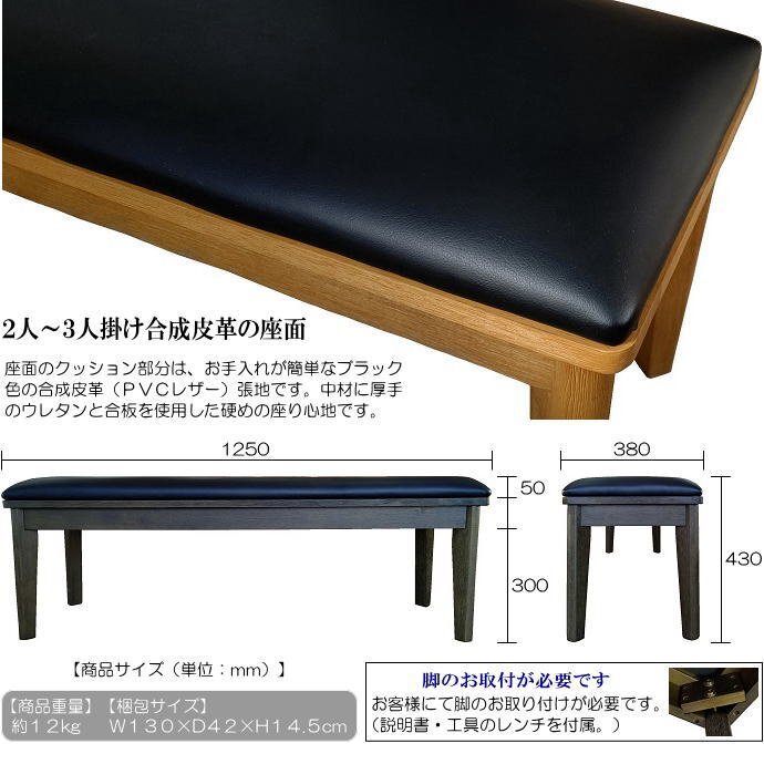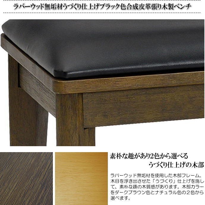 | 【商品特徴】 | ◇幅125cmダイニングベンチの単品販売です。 ・木部には木目を浮きだたせた「うづくり」仕上げを施したラバーウッド無垢材を使用して、素朴な雰囲気で木の質感があります。 ・立ち上がりやすい座面高43cmです。 ・張地は汚れてもサッと拭けてお手入れが簡単な合成皮革(PVCレザー)を使用しています。 ・座面は硬めで程良い弾力のある座り心地です。 ・2人~3人掛けられる、ゆったりサイズの幅125cmです。 ・ダイニングテーブルとのご利用だけでなく、玄関でのご利用や待ち合いのベンチとしてもご利用できます。 ・お客様で脚のお取り付けが必要です。(説明書を同梱しております。) |