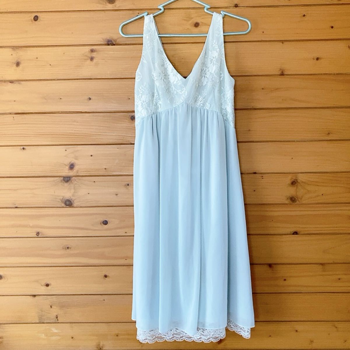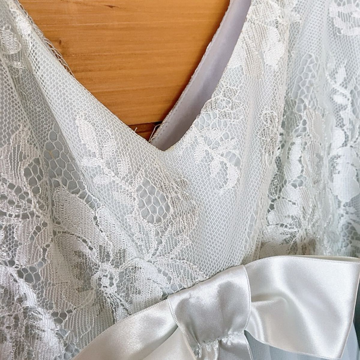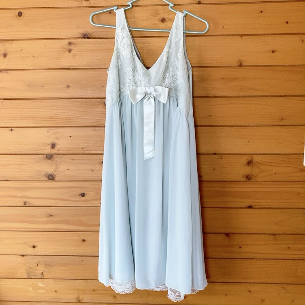 レースとリボンが特徴の水色のVネックパーティードレスです。
