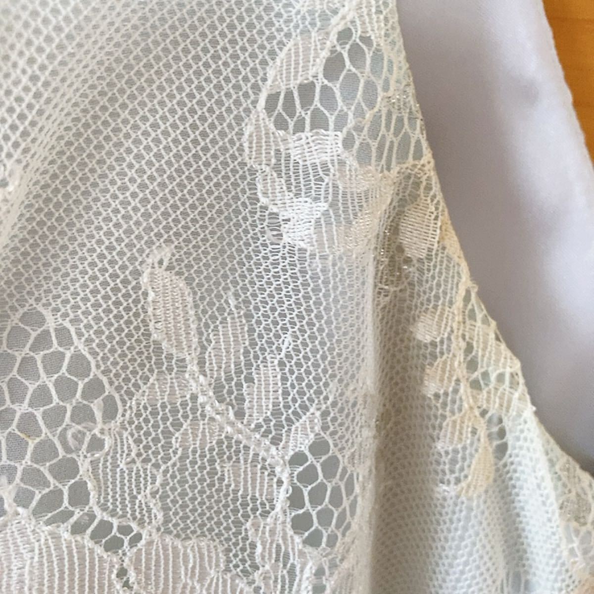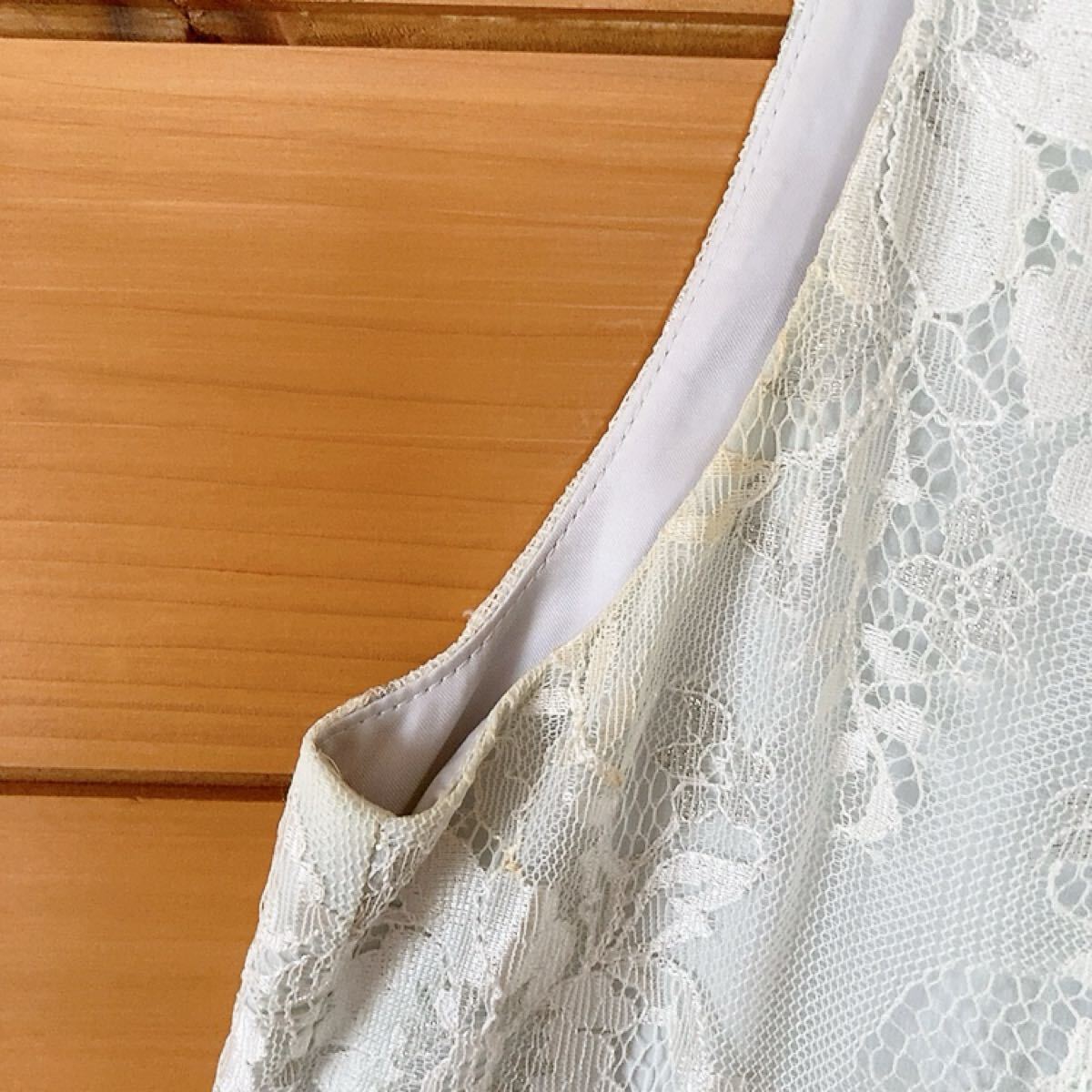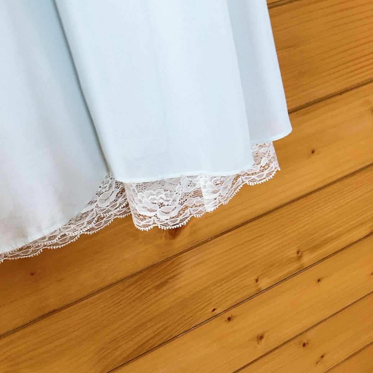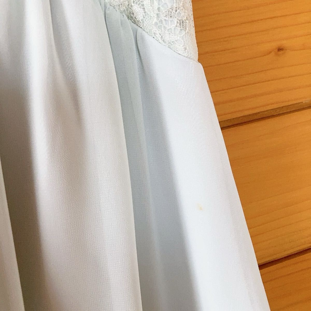 レースとリボンが特徴の水色のVネックパーティードレスです。
