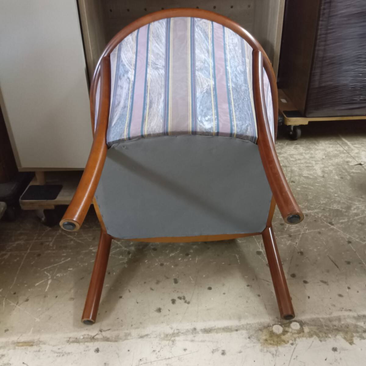 流れるような曲線を描く木製フレームが美しく、落ち着いた色合いのストライプ柄ファブリックとの組み合わせは、ノスタルジックでありながら洗練された印象を与えます。古き良き日本の喫茶店や洋食屋のような空間にも馴染み、モダンな北欧インテリアのアクセントとしても活躍するでしょう。