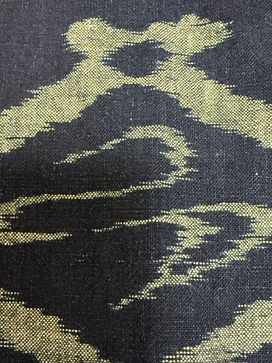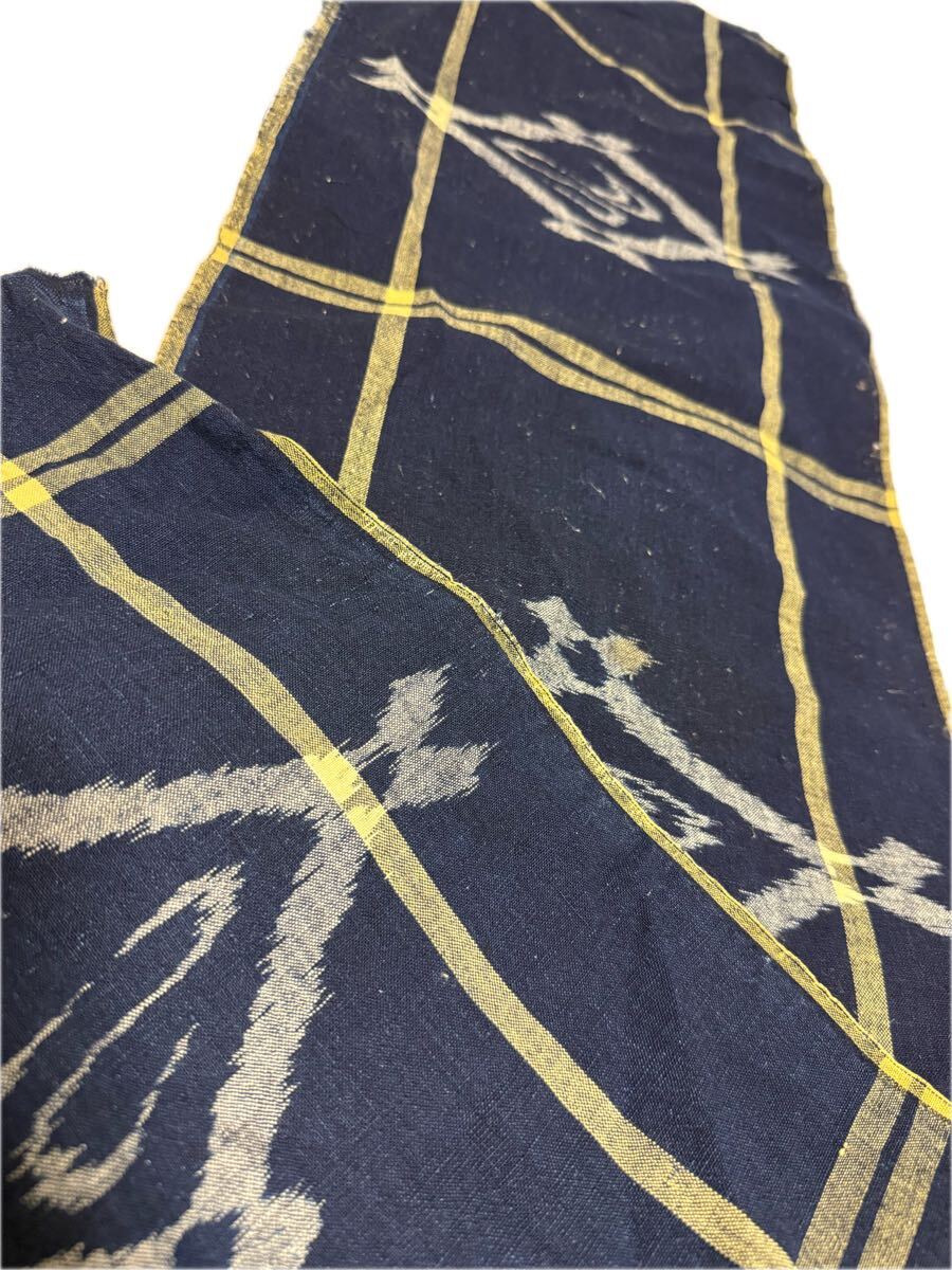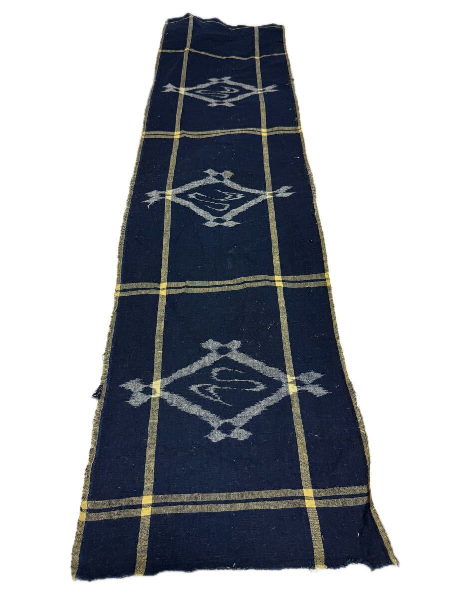 49☆江戸明治 当時物 藍染作家さん 参考資料 古藍 藍染 木綿布団皮 絵絣3色織物端切れ紬暖簾古布襤褸 狭幅32.5cm×長さ125cm