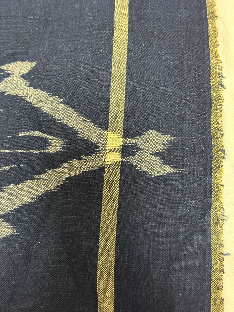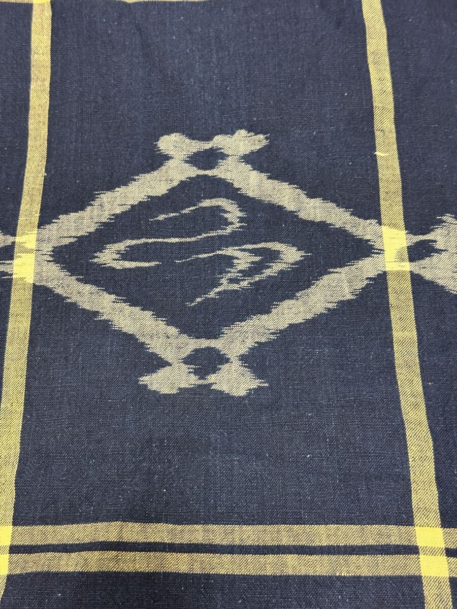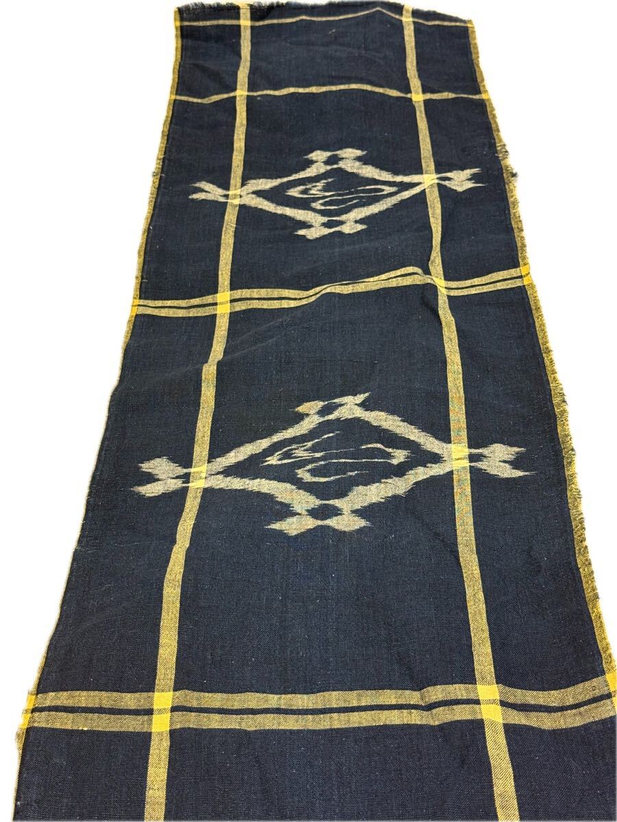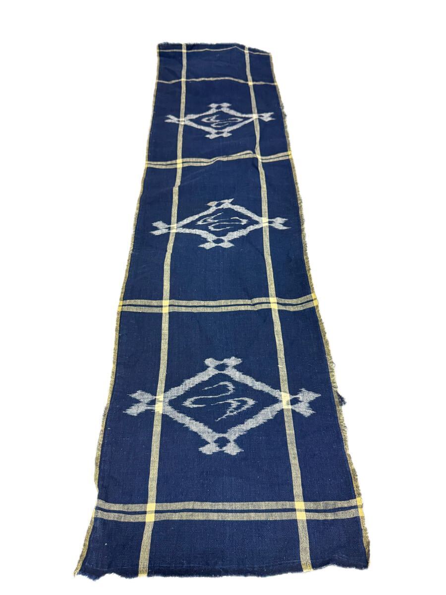 49☆江戸明治 当時物 藍染作家さん 参考資料 古藍 藍染 木綿布団皮 絵絣3色織物端切れ紬暖簾古布襤褸 狭幅32.5cm×長さ125cm
