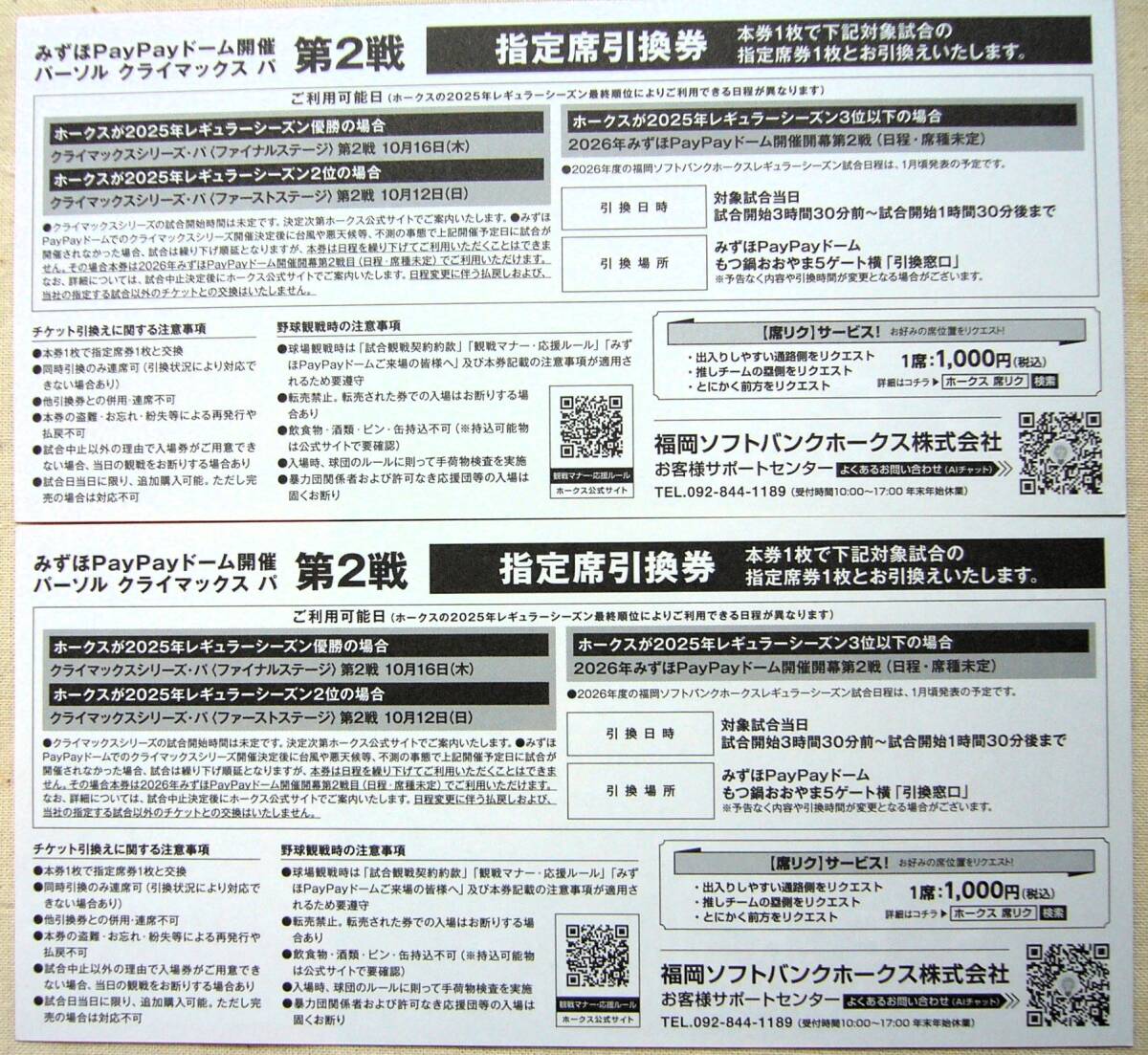 10月16日(木) 指定席引換(2枚セット) クライマックスシリーズ ファイナル 第2戦 みずほPayPayドーム福岡 ソフトバンクホークス
