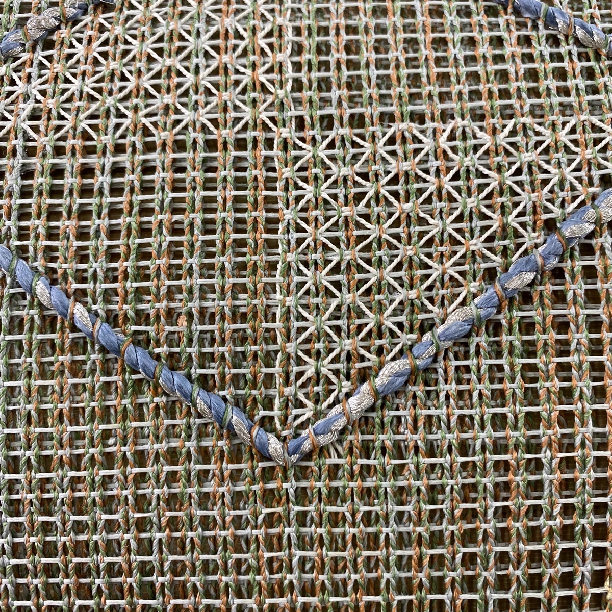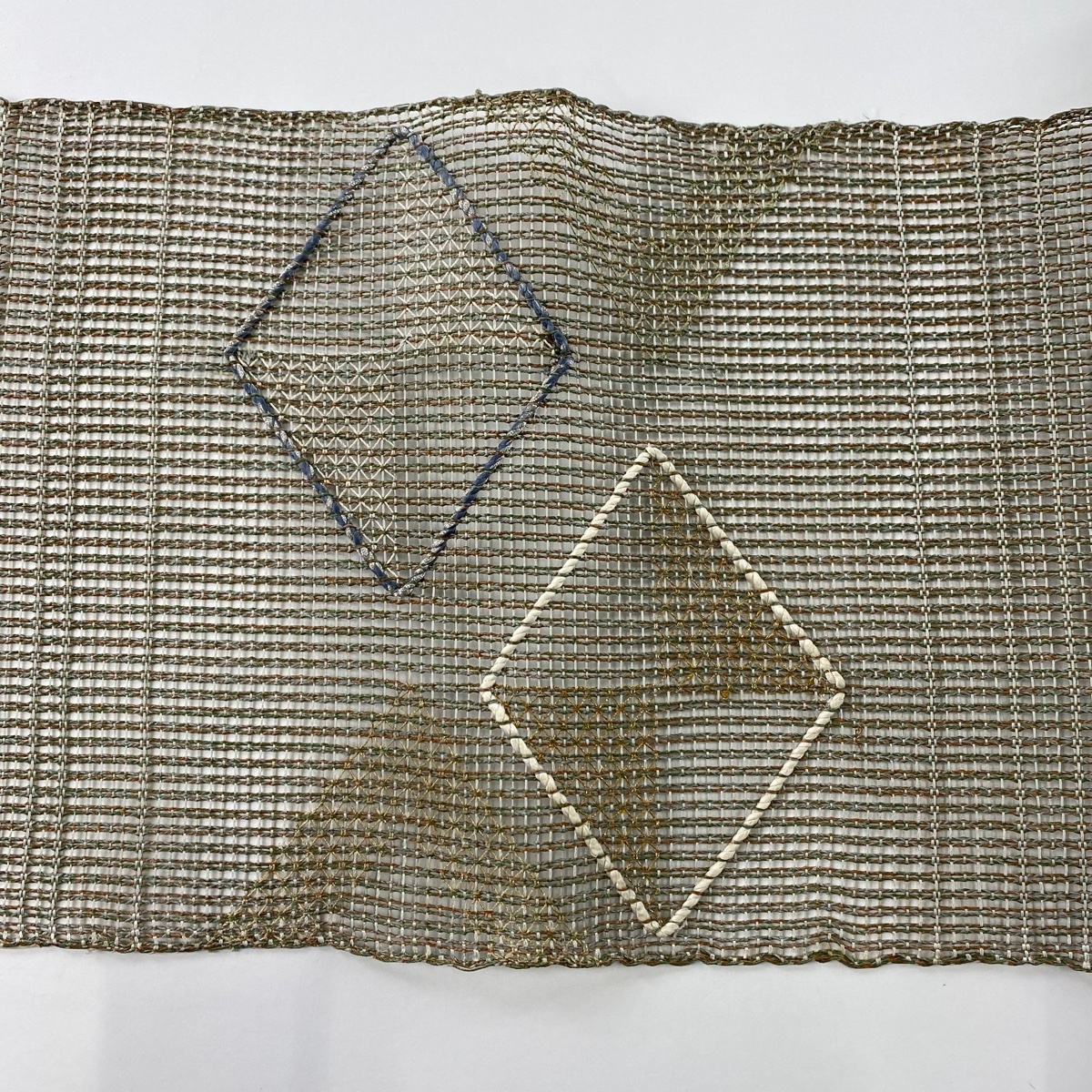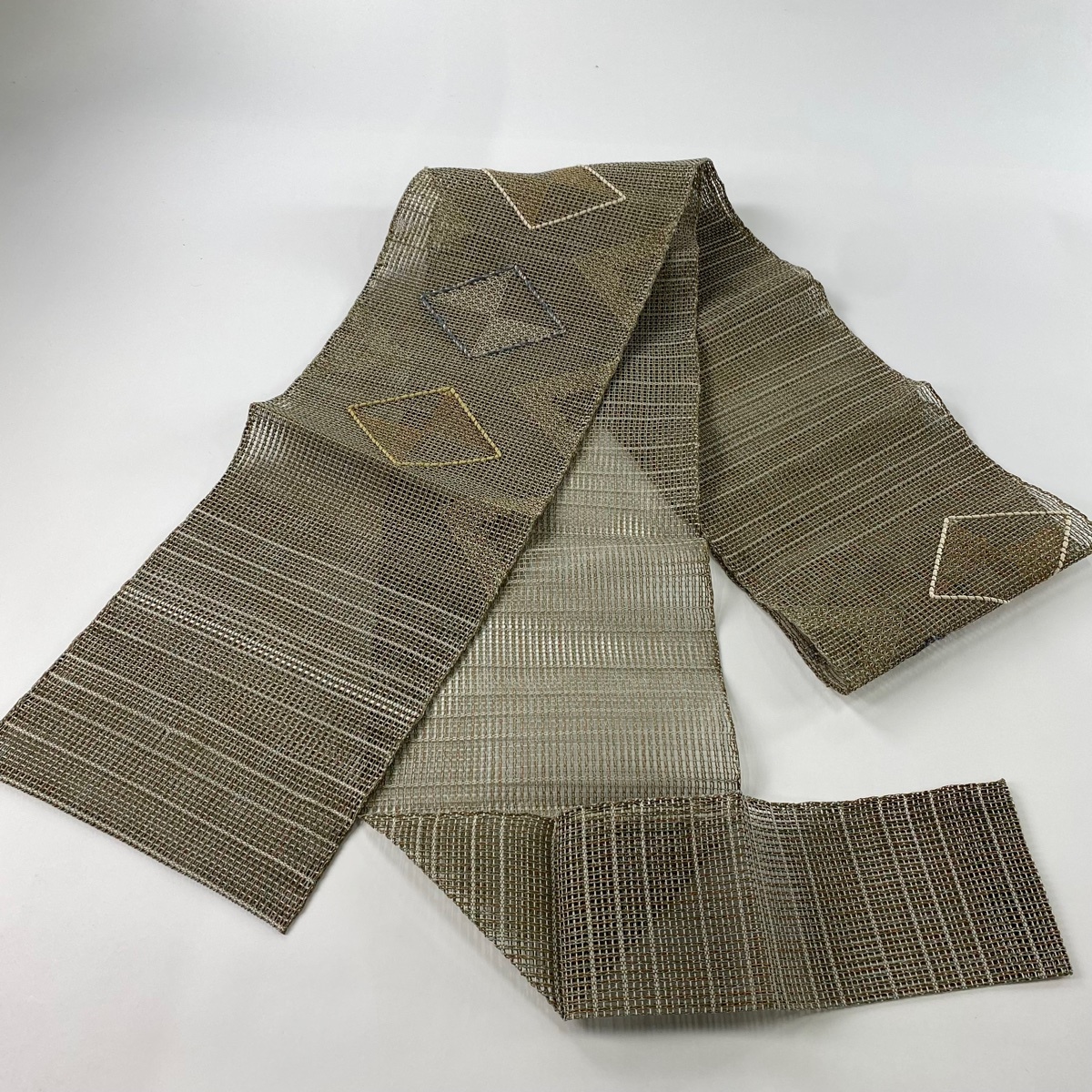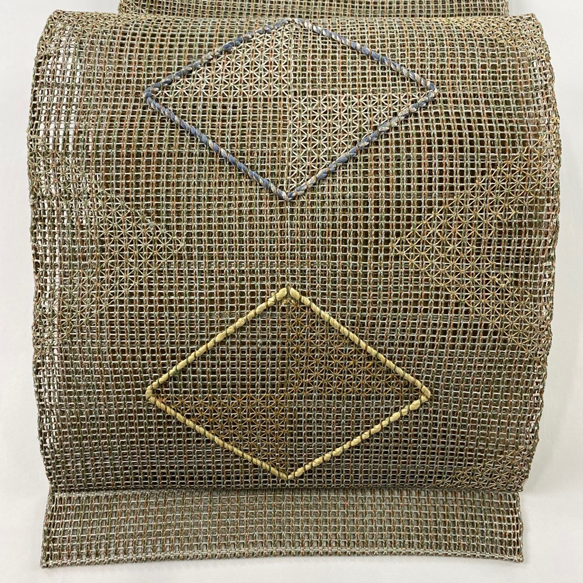 | 名古屋帯 秀品 八寸名古屋帯 松葉仕立て 夏帯 菱 幾何学模様 金銀糸 灰緑 正絹 【中古】 |
