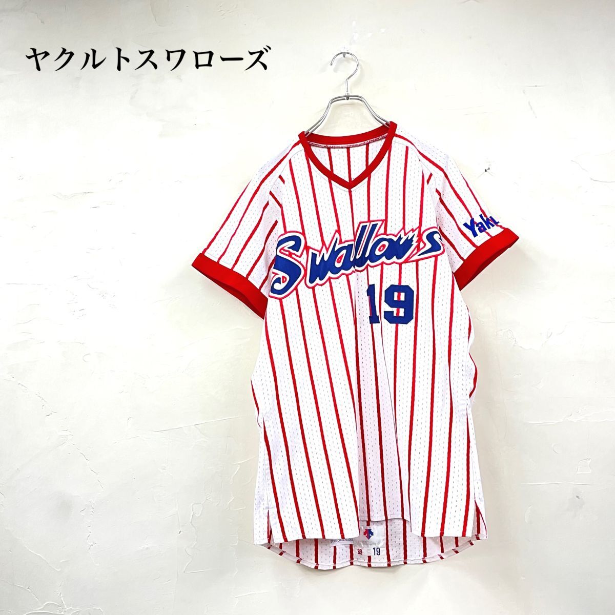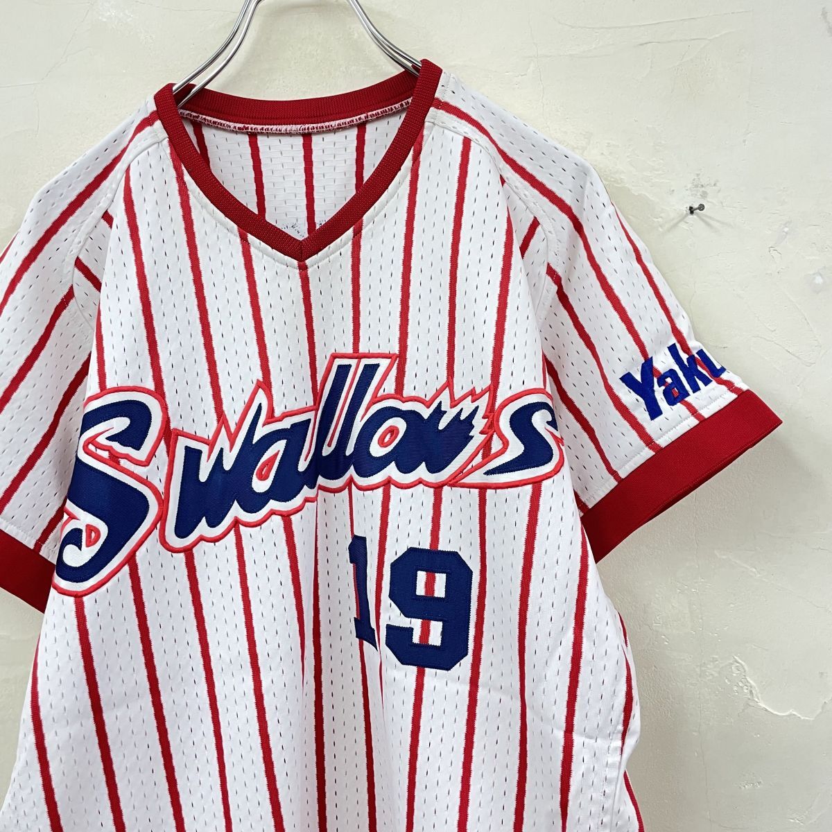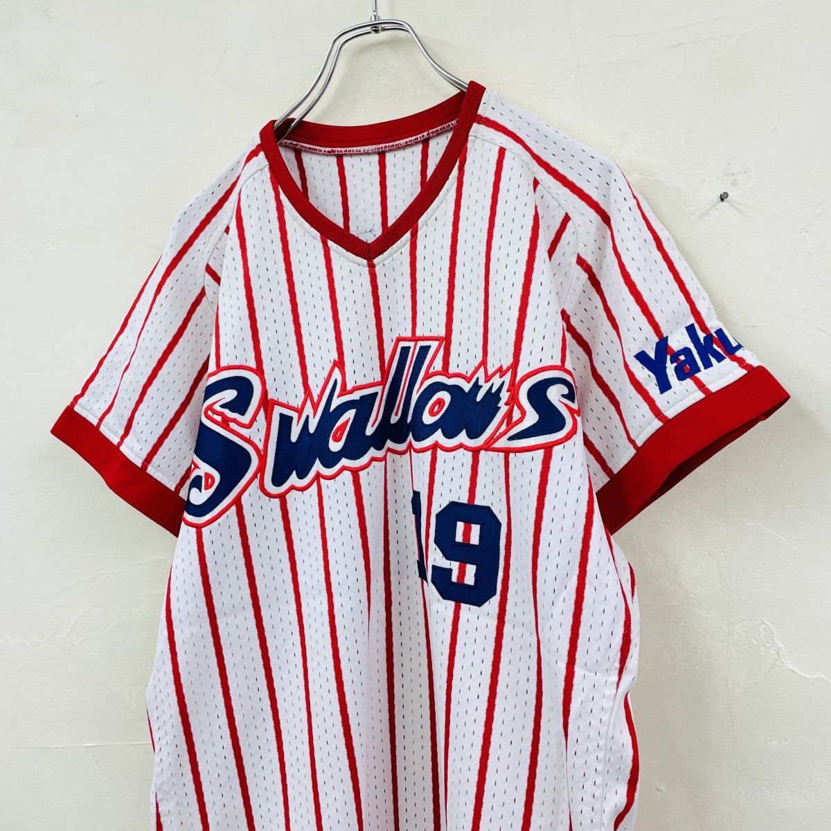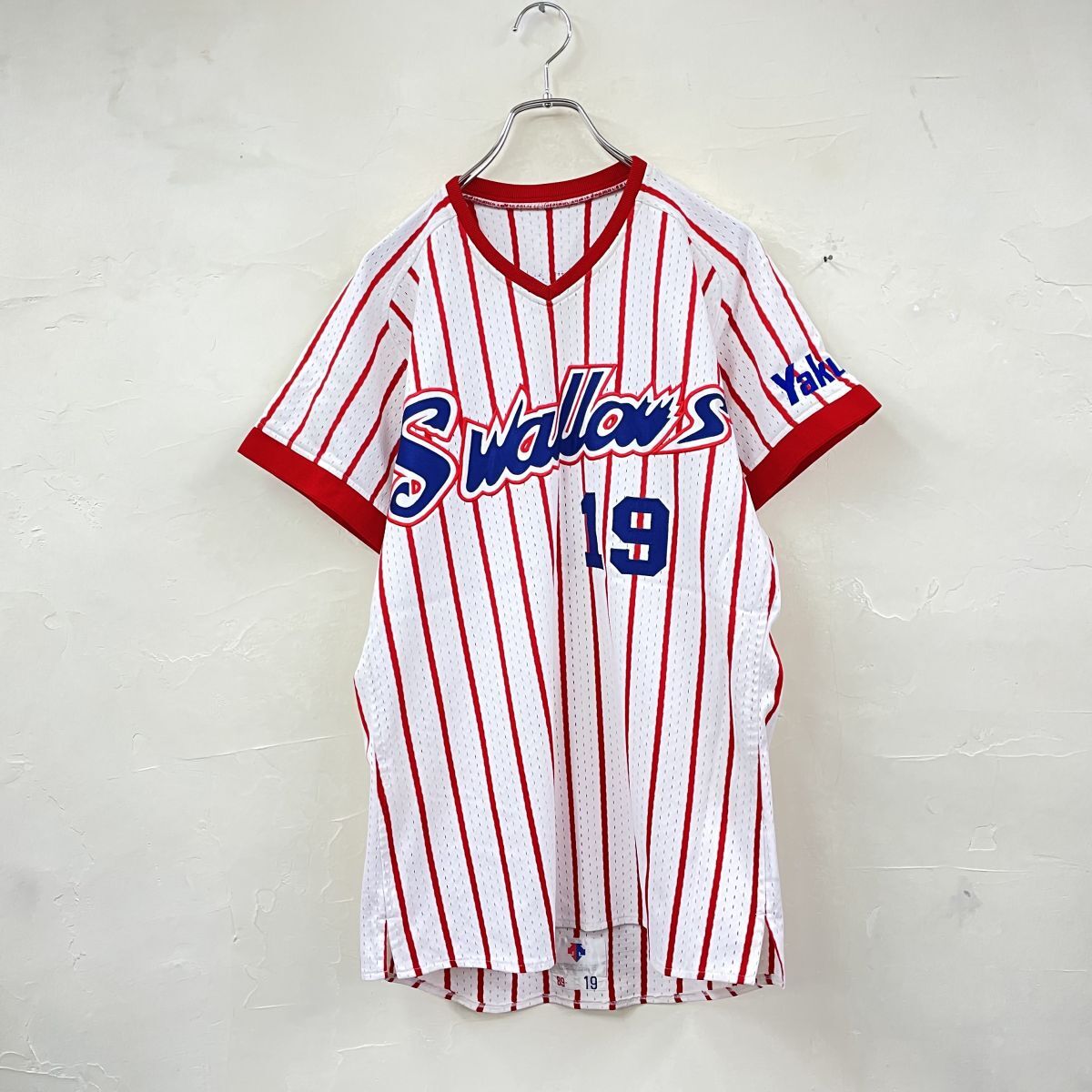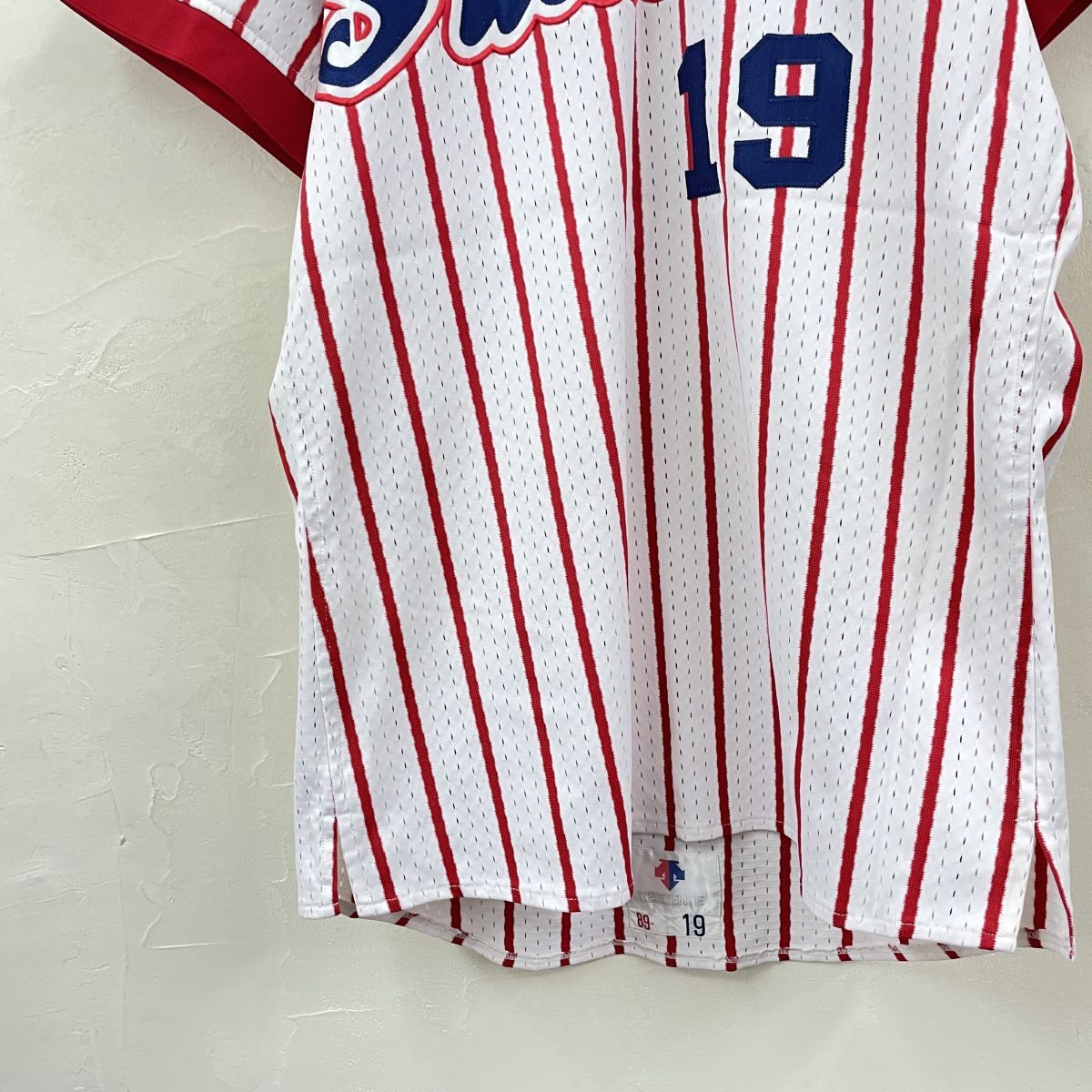 2K2839-N◆89年◆ ヤクルトスワローズ 岡 幸俊 ユニフォーム 公式 ゲームシャツ 野球 背番号19 ホーム◆ ホワイト レッド ストライプ