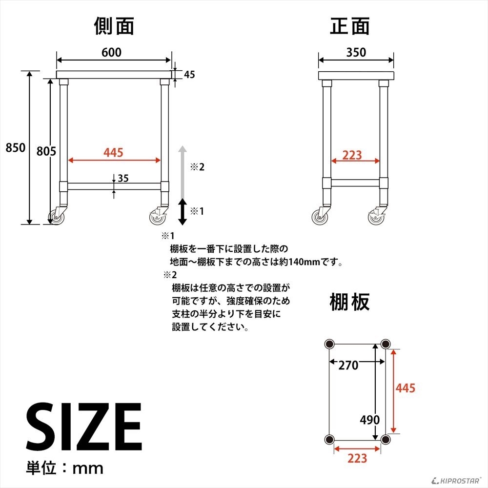 | 材質 | 天板:ステンレスSUS430 脚:ステンレスSUS201 梁:スチール 車輪:PU 軸受:スチール亜鉛メッキ |