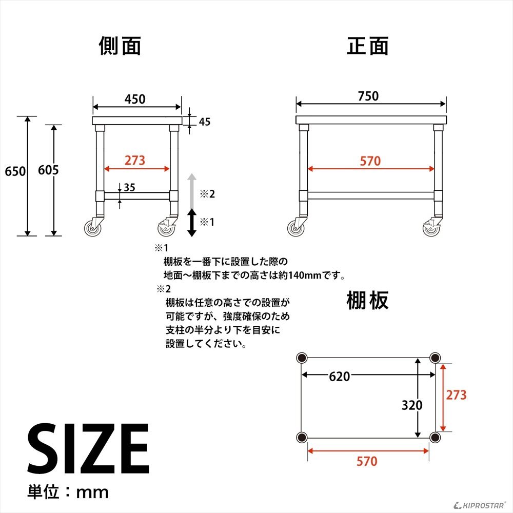 材質 | 天板:ステンレスSUS430 脚:ステンレスSUS201 梁:スチール 車輪:PU 軸受:スチール亜鉛メッキ |