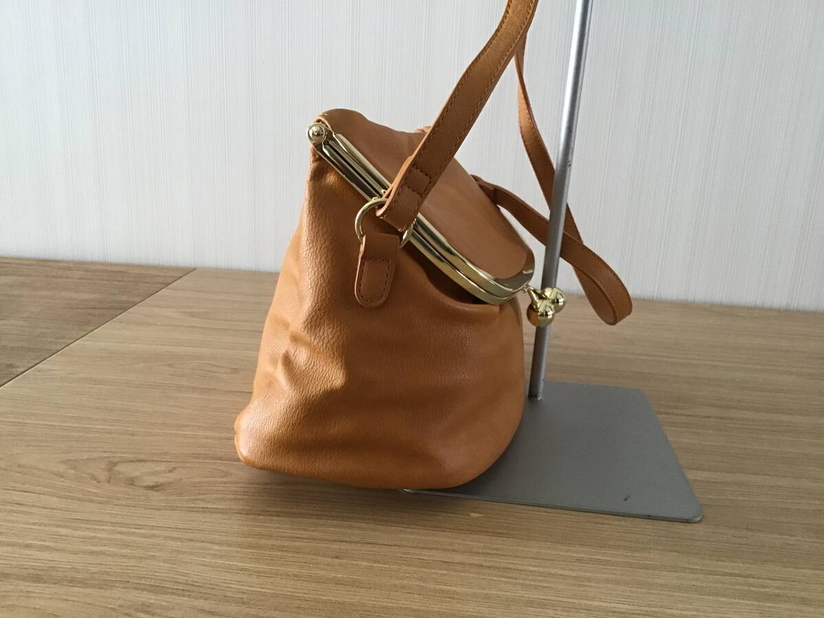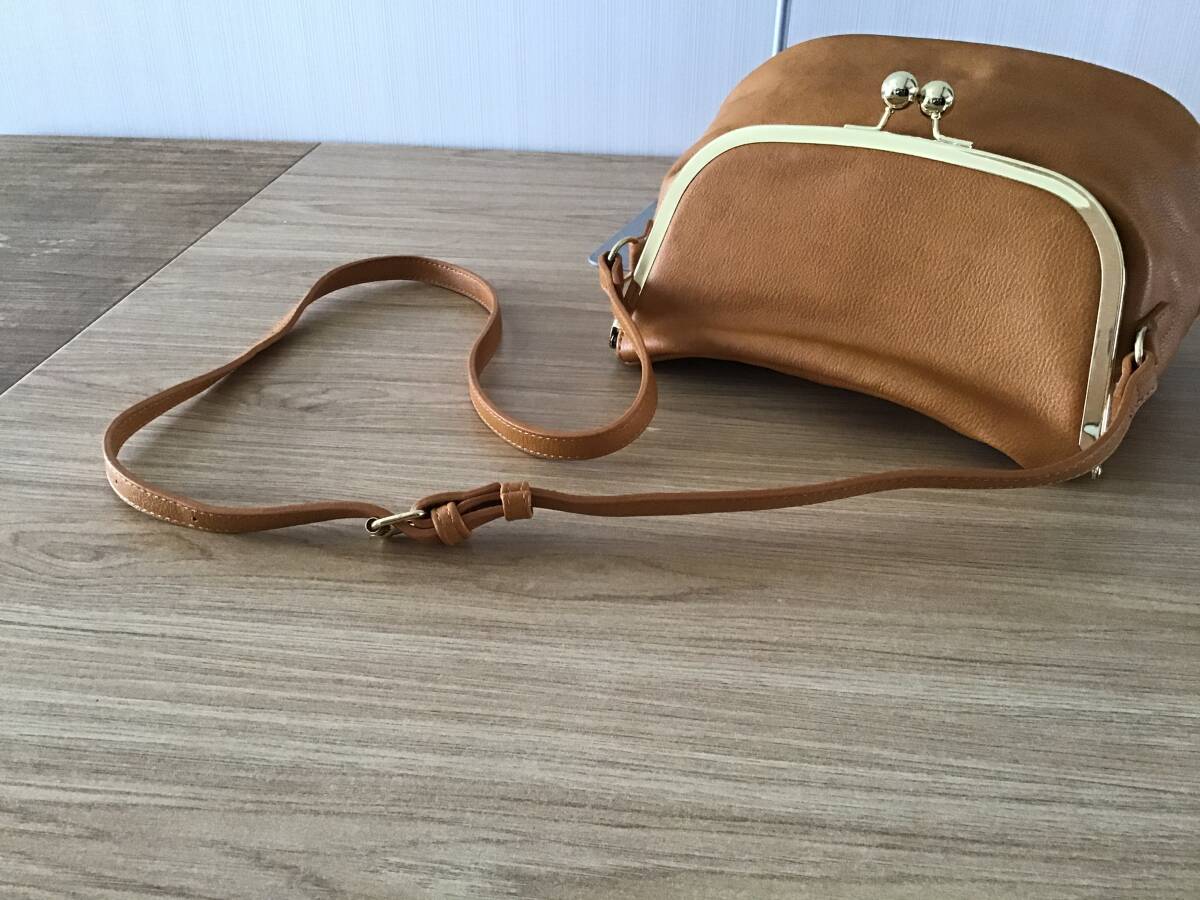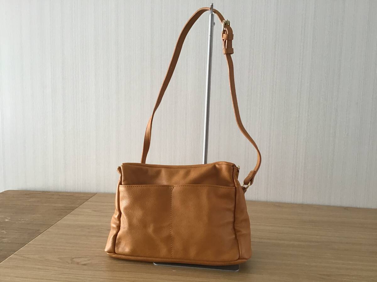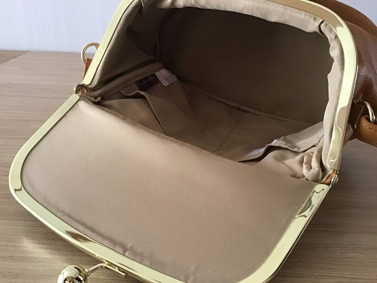 サイズ:縦16.5cm、横底で26cm、まち底で14cm、ストラップは調節穴9個で、長さ調節可能、開口部はがま口、中にオープンポケット2、外側背面にオープンポケット2