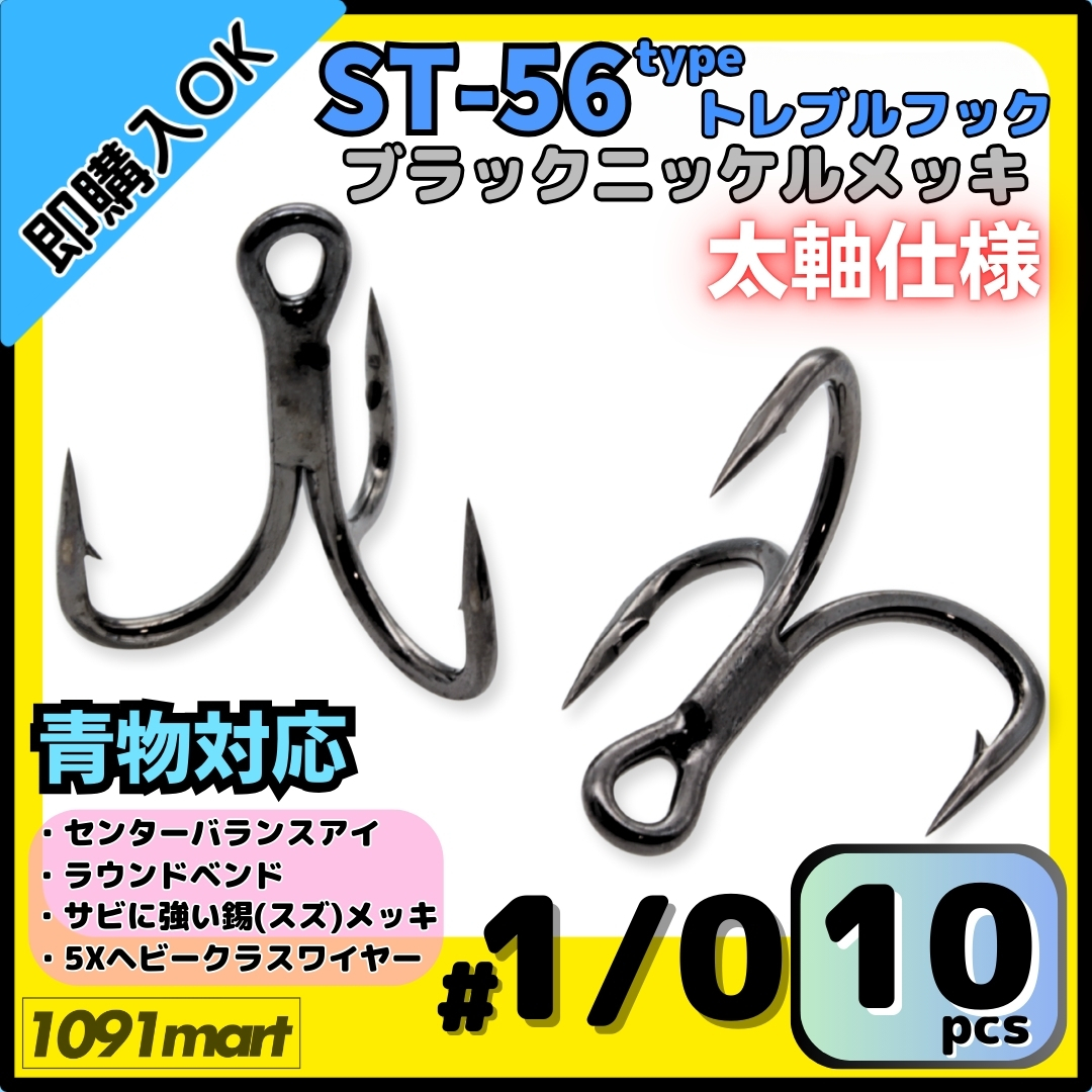 【送料無料】ST-56タイプ 防錆トレブルフック #1/0 ブラック 10本セット 太軸 5Xワイヤー使用 大物 青物対応 ヘビークラストリプルフック