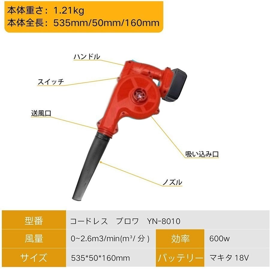 セット内容:ブロワー、ノズル、ダストバッグ、マキタ互換バッテリー 1個