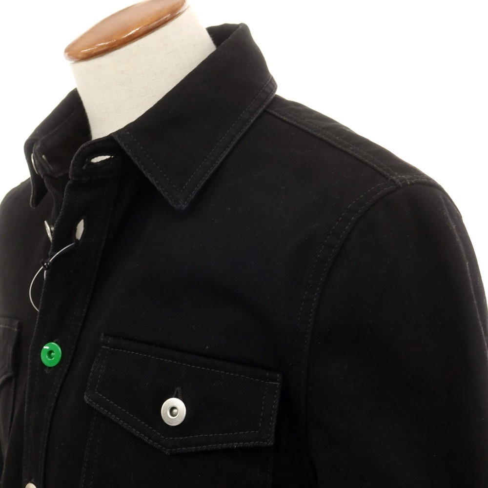張りのある厚手のツイルコットンを用いた、ボッテガヴェネタのカジュアルなシャツです。胸元のボタンがひとつだけグリーンカラーになった洒落たデザインになりまして、ブラック単色の端正なデザインがより引き立ちます。デニムのような重厚な生地感になりまして、ワイド目のシルエットで仕立てることで、今日的な雰囲気に仕上がっています。