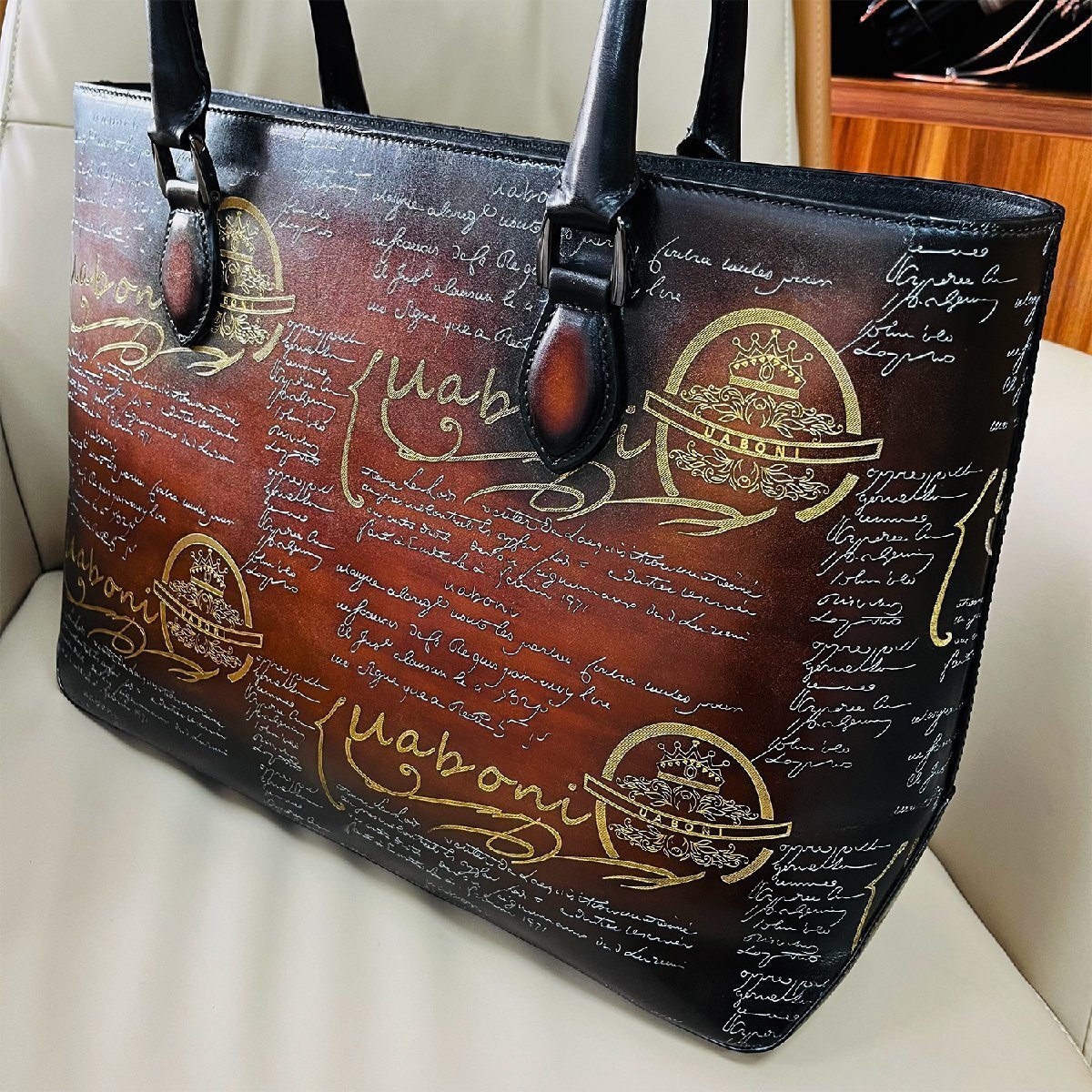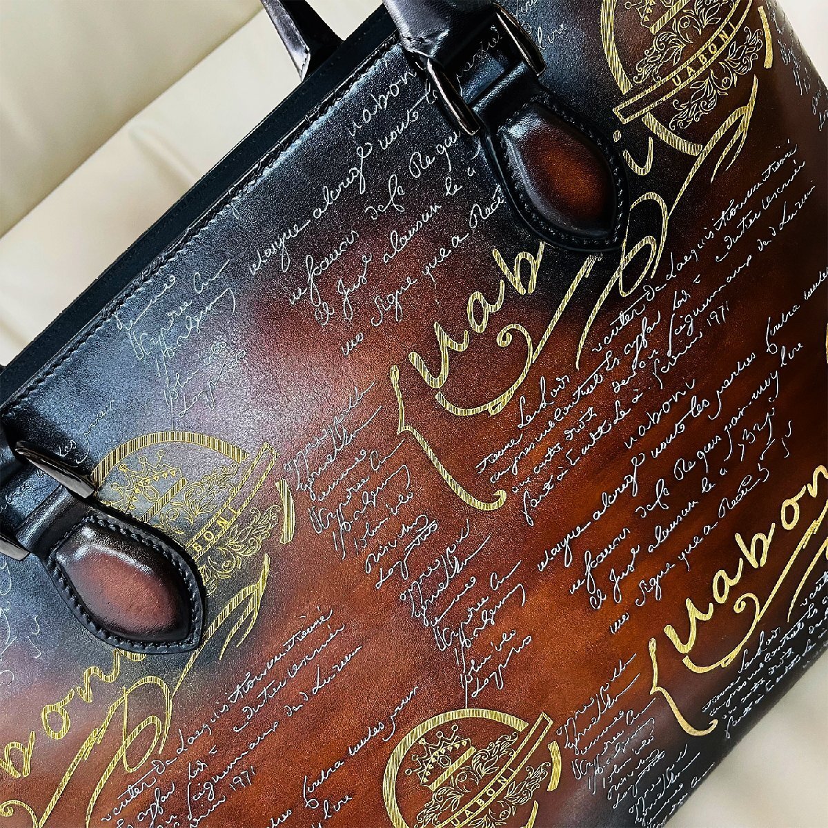 手触り感触が良くアンティーク風なトートバッグと仕上がりました。角の部分は丸みを帯びた設計になっており、全体的にカリグラフィーとゴールデン/シルバーパティーヌがデザインされております。色艶、柔かさに優れていて高級感溢れる逸品となります。