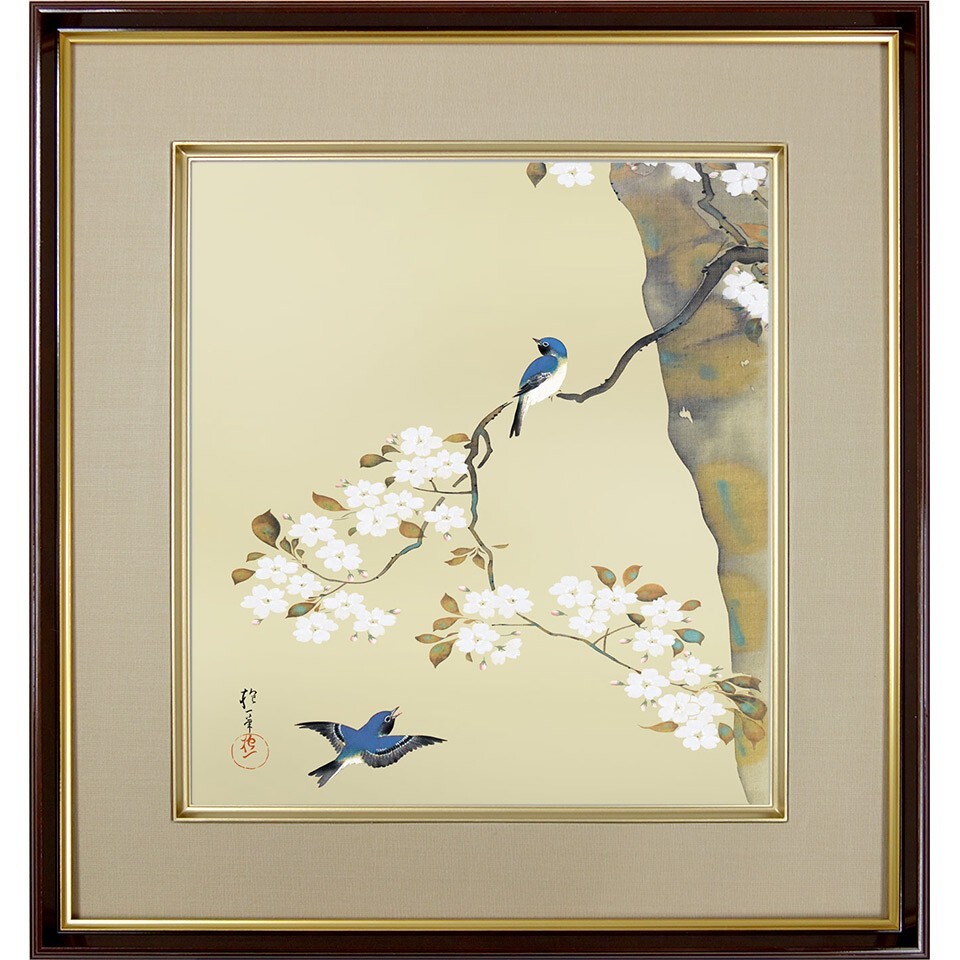 酒井抱一「桜に小禽図」複製画 額入り 色紙額 特殊工芸画 オオルリ 野鳥 春 風景画 琳派 日本画 名作 K10-079