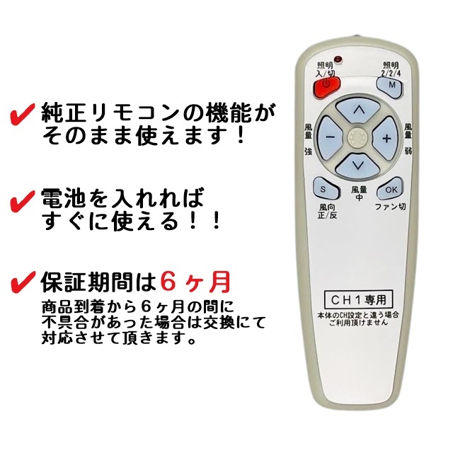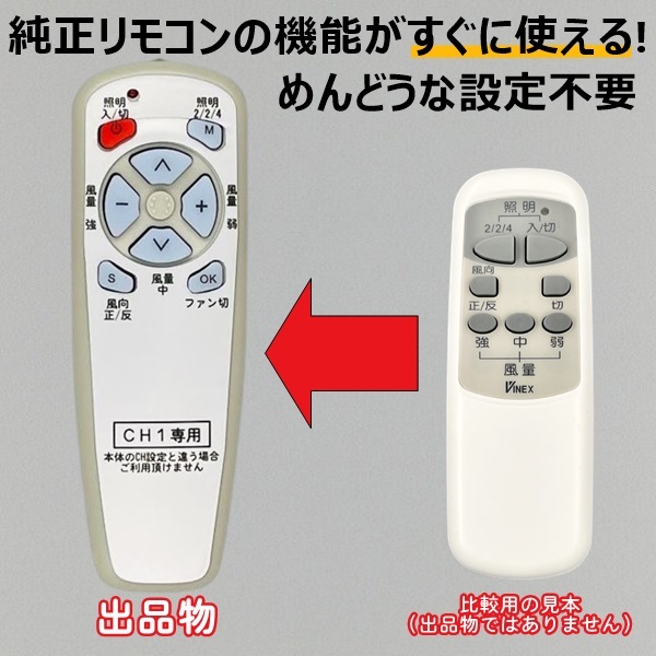 【商品名】 VINEX シーリングファン (CH1) 代替リモコン 【対応機種】 純正リモコンに「CH1」のシールが貼られている商品専用です。 「CH1」以外では動作しません。 TI-CF44WH-RC-CH1(チャンネル1) 比較画像の右側の純正リモコンが付属する機種に使用出来ます。 上記機種以外については、質問欄よりメーカーと型番をご連絡頂ければ、対応品のご案内をしております。 【商品について】 左側の代替リモコンが出品物になります。右側のリモコンは見本画像です。 タイトル機種のリモコン信号を入力した、設定不要で使える純正品と同等の代替リモコンです。 乾電池は付属しません。別途ご用意下さい。(単4乾電池×2本) 【商品サイズ】 縦11.7cm×横3.9cm×高さ1.9cm 【発送について】送料無料 迅速発送を心掛けております。土日祝日はお時間を頂く場合ございます。 ポスト投函配達となり、日時指定は出来ません。 | ||