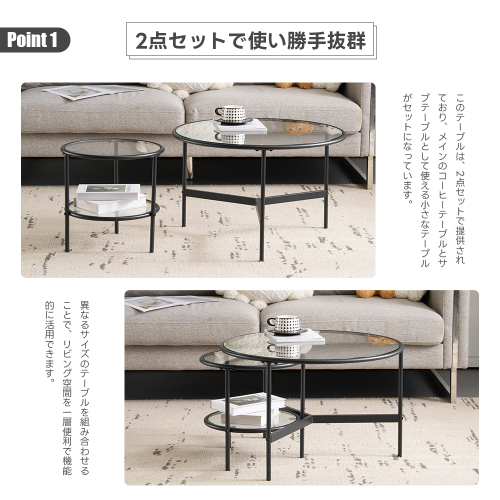 • point01 【2点セットで使い勝手抜群】このテーブルは、2点セットで提供されており、メインのコーヒーテーブルとサブテーブルとして使える小さなテーブルがセットになっています。異なるサイズのテーブルを組み合わせることで、リビング空間を一層便利で機能的に活用できます。