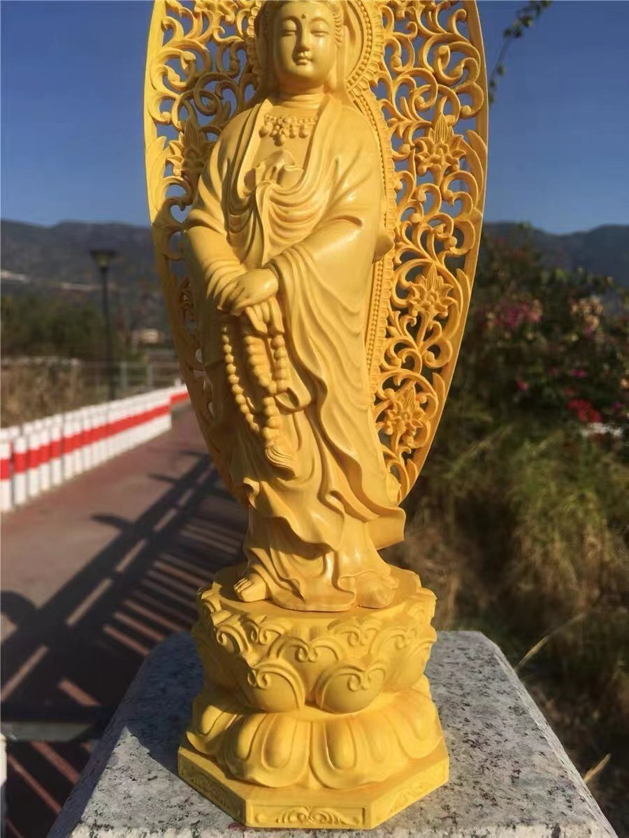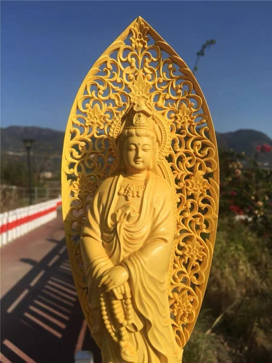 上品/綺麗 仏教工芸品 木彫仏教 檜材 精密彫刻 仏師で仕上げ品 観音菩薩立像 高27cm