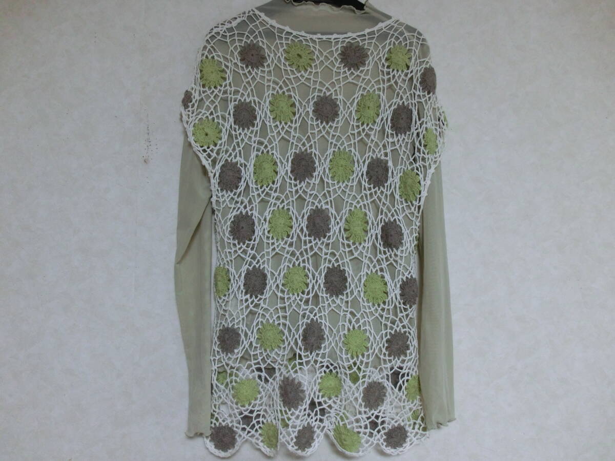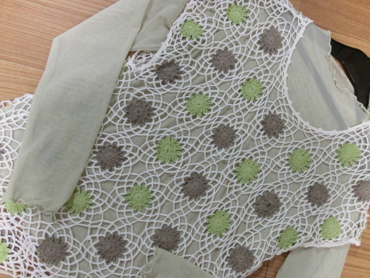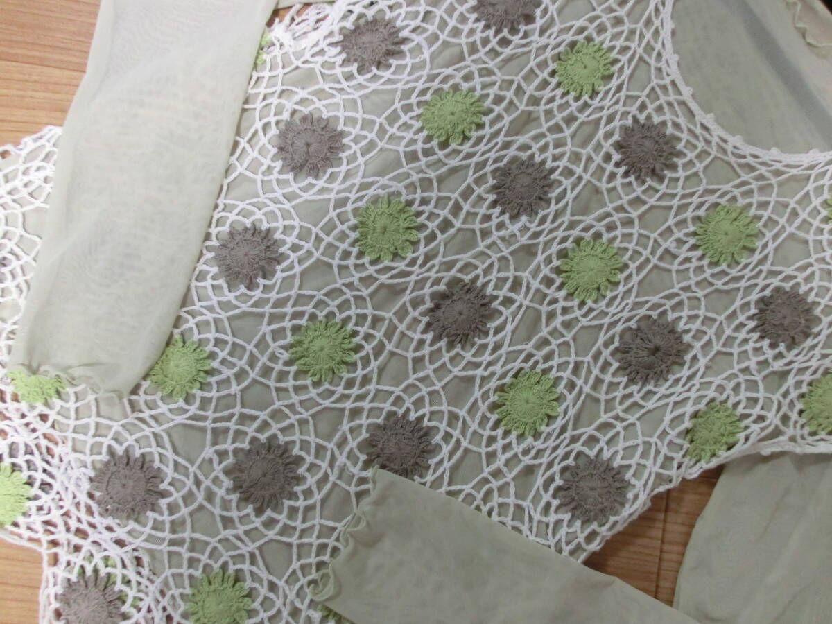 薄す黄緑の花と薄すブラウンの花のモチーフを繋いでロングベストを