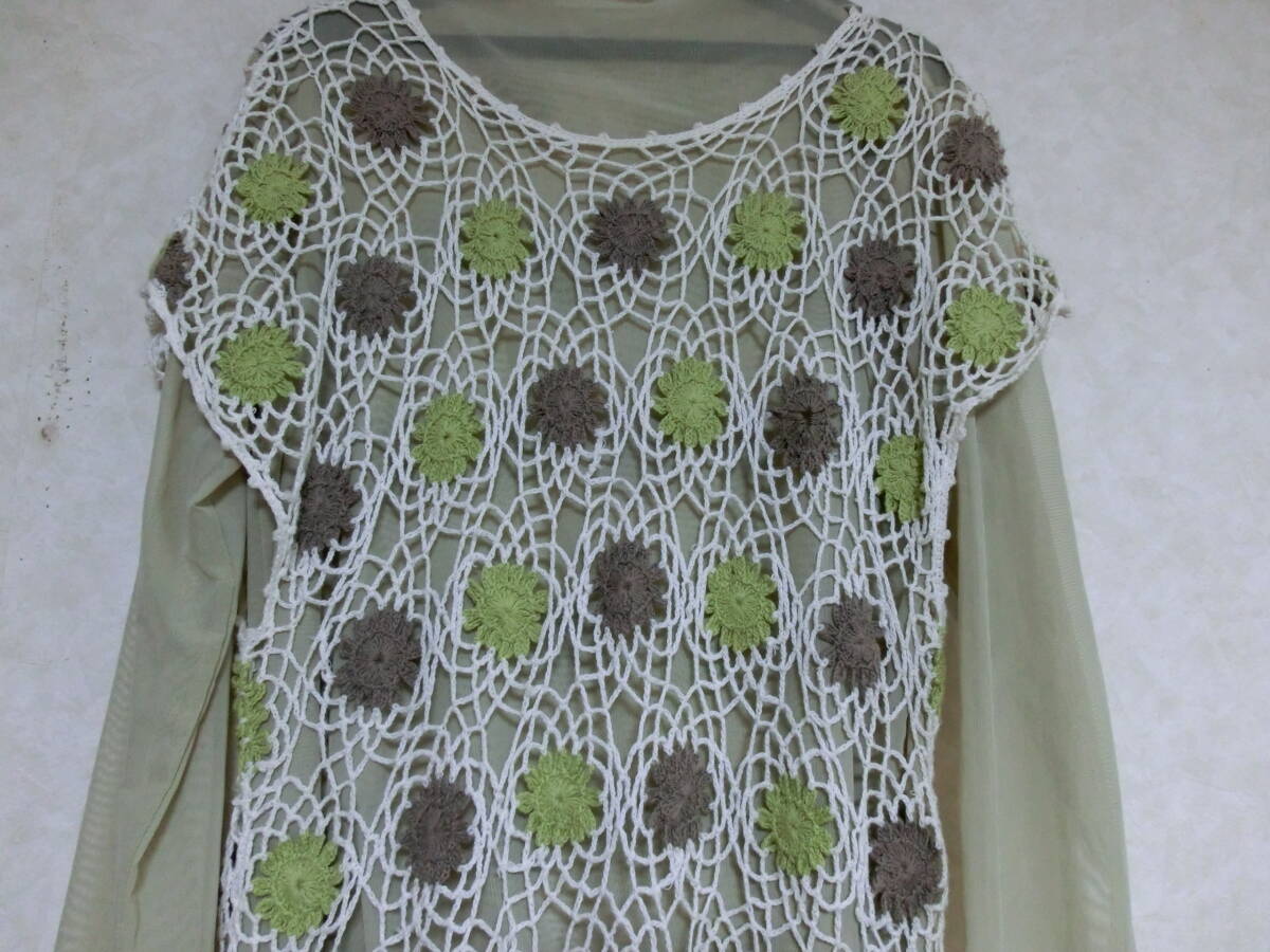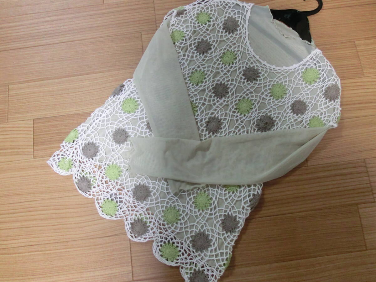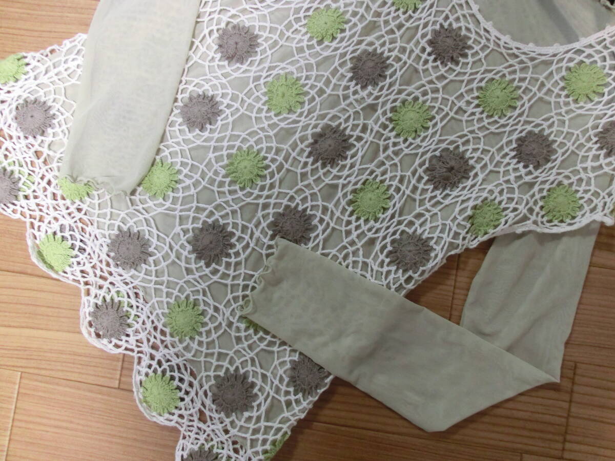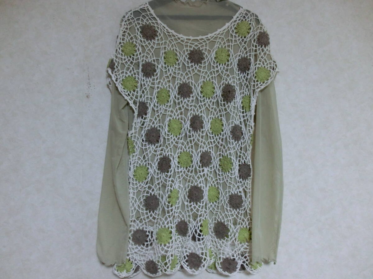 薄す黄緑の花と薄すブラウンの花のモチーフを繋いでロングベストを