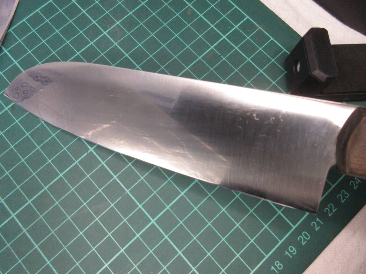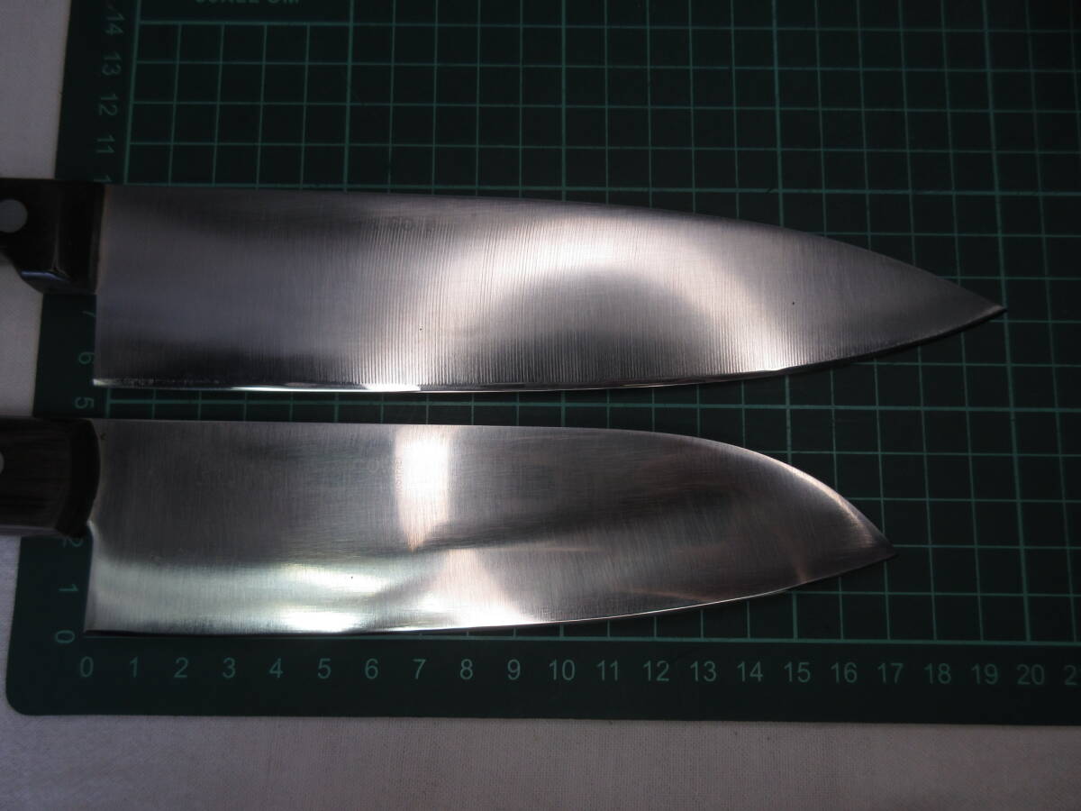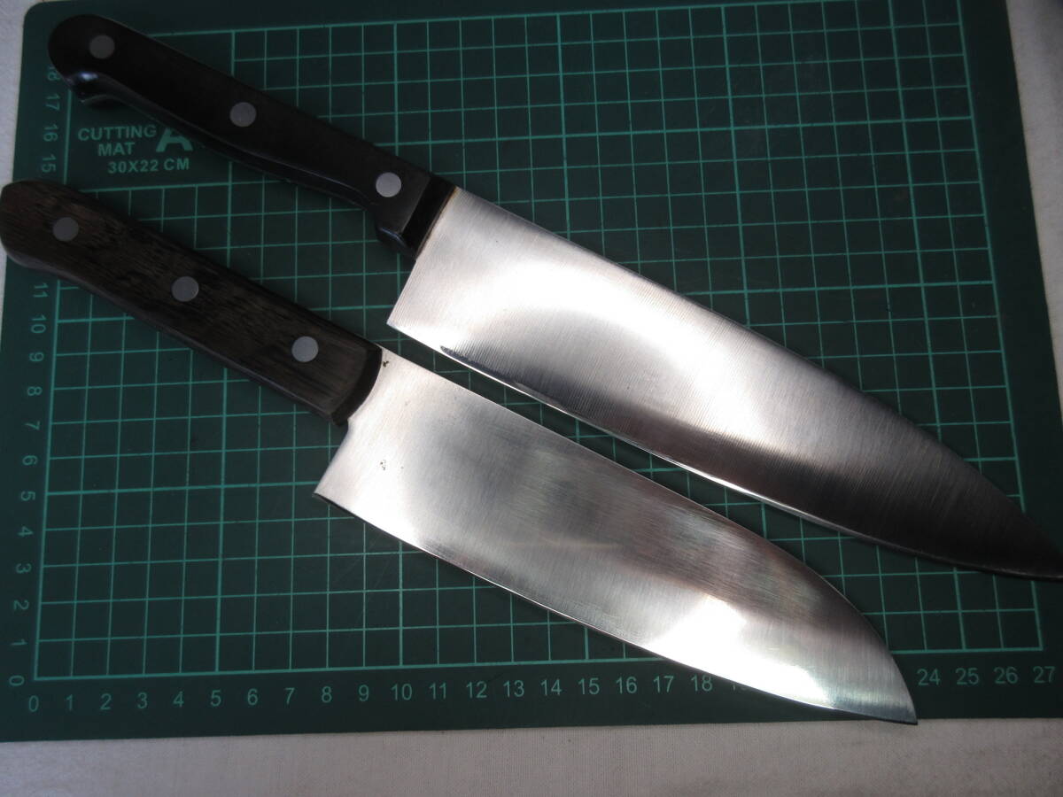 | 「受取連絡」が出来ない方の入札はお断りします。 こちらから評価を入れることはありません。 ■■■■■■■■■■■■■■■■■■■■■■■■■■■■■■■■■ 三徳包丁17cm 牛刀20cm 最後の写真は磨き前です。銘は消えました。 歪みや反り、落としきれない錆があります。全体的に使用感があります。 包丁のみの出品です、付属品はありません。 ■■■■■■■■■■■■■■■■■■■■■■■■■■■■■■■■■ 発送はレターパックです。(補償はありませんのでご注意ください。) 送料を抑えたい方はライト(430円)を選択してください。(ただし厚さ制限のため簡易包装です、新聞紙で包む程度ですので輸送時の衝撃で包丁の歪みや破損のリスクがありますのでご理解ください。) プラス(600円)は衝撃対策で厚めの梱包をします。(複数同梱の場合は包装が簡易になります。) 刃渡り21cmまではレターパックで発送できると思いますが長い刃は着払いゆうパックになります。 小振りな包丁なら3本くらいまでライトで同梱できます。プラスなら5本までは入ると思いますが21cm以上の包丁が絡むと本数が限られます。 以下は定型文です。 洋包丁は両刃、和包丁は片刃を前提に出品しています。 (タイトルと個別情報に刃付けの記載が無ければ上記のとおりです) 他の出品物と同梱できます。(システム上、着払いとのまとめ依頼ができません。落札後に同梱希望のメッセージを 頂ければ対応します。) 送料と材質についての質問には返答しません。 包丁につきましては全てジャンクとし、ノークレームノーリターンでお願いします。 出品からお品物が届くまでに時間が掛かった場合、鋼などの材質ですと変色や錆などの変質がある場合がございますのでご了承ください。 錆の酷い包丁は再生研磨していますが、あくまで素人仕事です。電動工具を用いての仕上げです。 削る、磨くは出来ますが歪みの修正は出来ません。中古品ですので歪みがある前提で入札してください。 磨きにより錆に強くなるメリットがありますが切った食材が張り付くデメリットがあります。 切れ味が悪いや、思ったより汚いなどのクレームはご遠慮ください。 触れば怪我をするほどの最低限の刃付けはしてあります、開封時にご注意ください。 肉眼での検品ですので微細な傷や欠けを見落としている可能性もありますので写真を参照してください。 現状維持のために防錆に椿油を塗布していることがありますので写真に不自然な艶が写っている時があります、ご了承ください。 (鋼の洋包丁の場合は中子にも塗布するために柄にも油が散布しています。ご使用前に洗浄してください。) 中子やリベットの錆を落とす為に柄ごと研磨する場合がありますので、柄に研磨痕が残っている時があります。 柄の仕上げに軽く蝋引きしています。 片刃の場合、研ぎですが砥石傷が付くのを嫌ってベタ研ぎはせず、峰をわずかに浮かして仕上げています。(綺麗な裏押しの和包丁はベタ研ぎです) 10対0ではなく9対1位の感覚です、完璧な片刃をお求めの方は入札をご遠慮ください。 (和包丁は片刃前提です、洋包丁が片刃の場合にはタイトルと個別情報に片刃と記載してあります) 有効利用、再生利用できる方の入札をおまちしています。 写真で判断いただき、商品説明を理解出来る方のみ入札をお願いします。 クリーニングなどはせず、写真のままお送りします。 専門知識が乏しい為、質問に答えられない時があります。 ブランド品の真偽については不明とさせて頂きます。 素人による中古出品です、すり替え防止の為にもノークレームノーリターンでお願いします。 入金を確認しました時点でお取り置き終了と判断し発送準備にはいります。 同梱発送、お取り置きを希望の方は入金前に連絡頂くと助かります。 落札後、48時間以内の初回連絡、五日以内の入金が確認出来ません場合は落札者様都合のキャンセルとさせて頂きます。 その場合落札者様に非常に悪い評価とブラックリストへの登録を同時に行いますのでご了承ください。 (以後こちらのオークションに入札が出来なくなります) #お取引に不安を感じる評価の方は削除させて頂く事があります。 #総合評価が高くても直近に悪い評価がある方も削除致します。 #いたずら入札を防ぐ為、1万円以上の入札額時の場合は新規の方の入札をお断りします。 #(どうしても入札したい時は質問欄より入札意思をお伝えください。) *評価を入れて頂くと反射的にお返しする形を取っています、不要の方は評価を入れないで下さい。 *こちらから評価をお付けすることはありません、不要の方は「受取連絡」で終了して下さい。 自己紹介欄もあわせてお読みください。 | ||