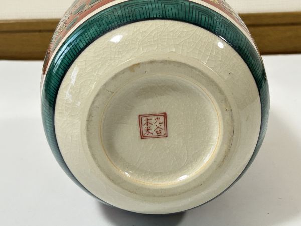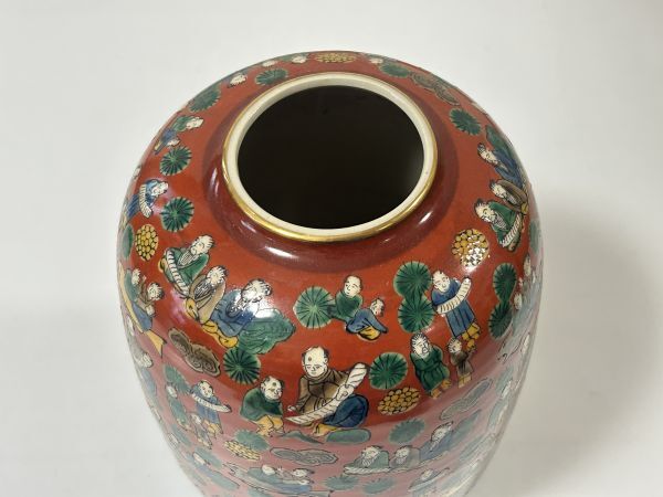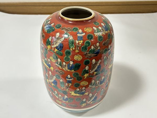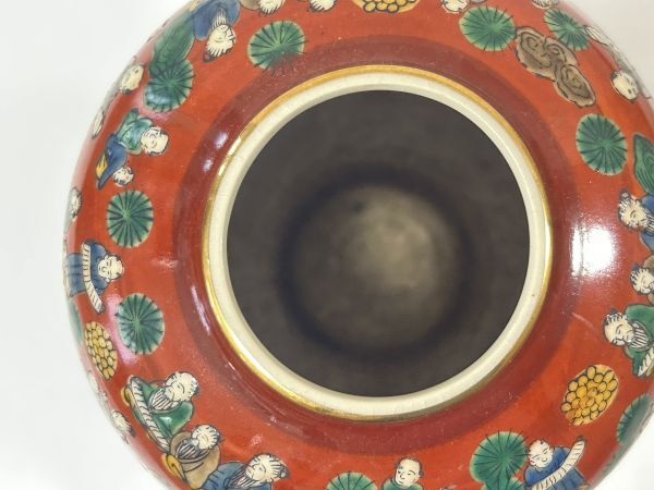 9-3 九谷木米 花瓶 花器 赤 色絵人物図 丸谷焼 壺 現状品