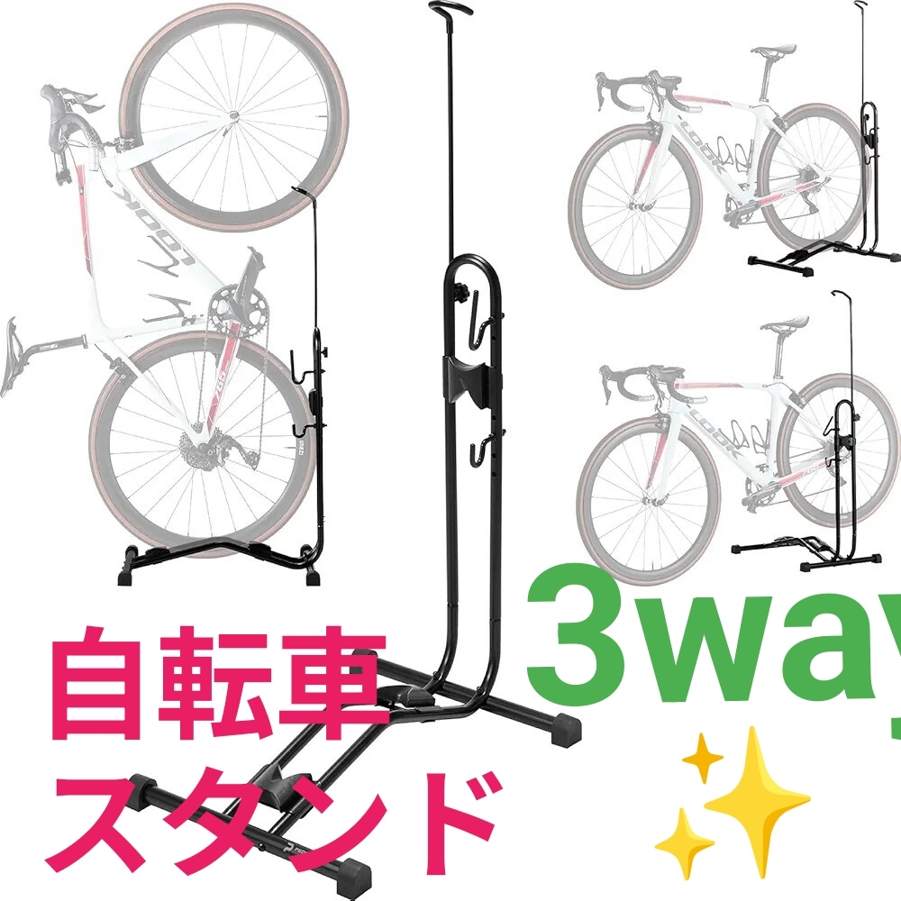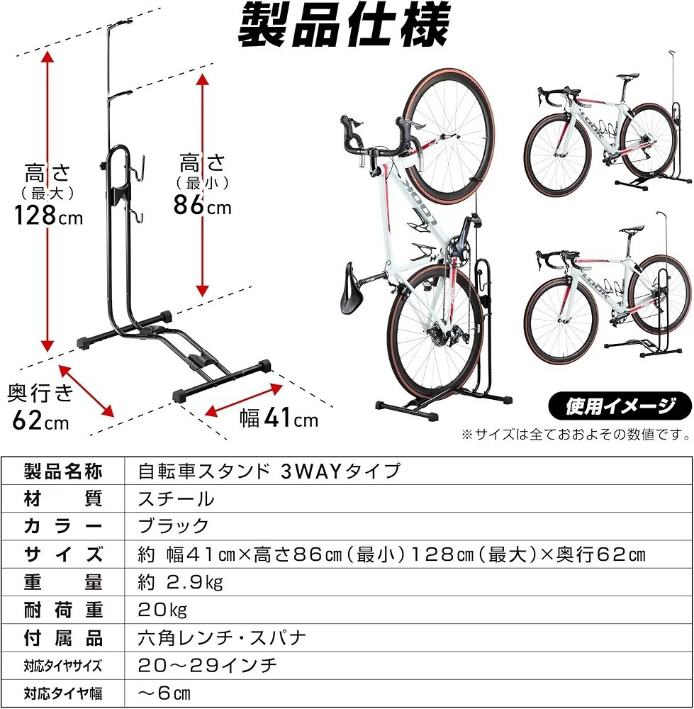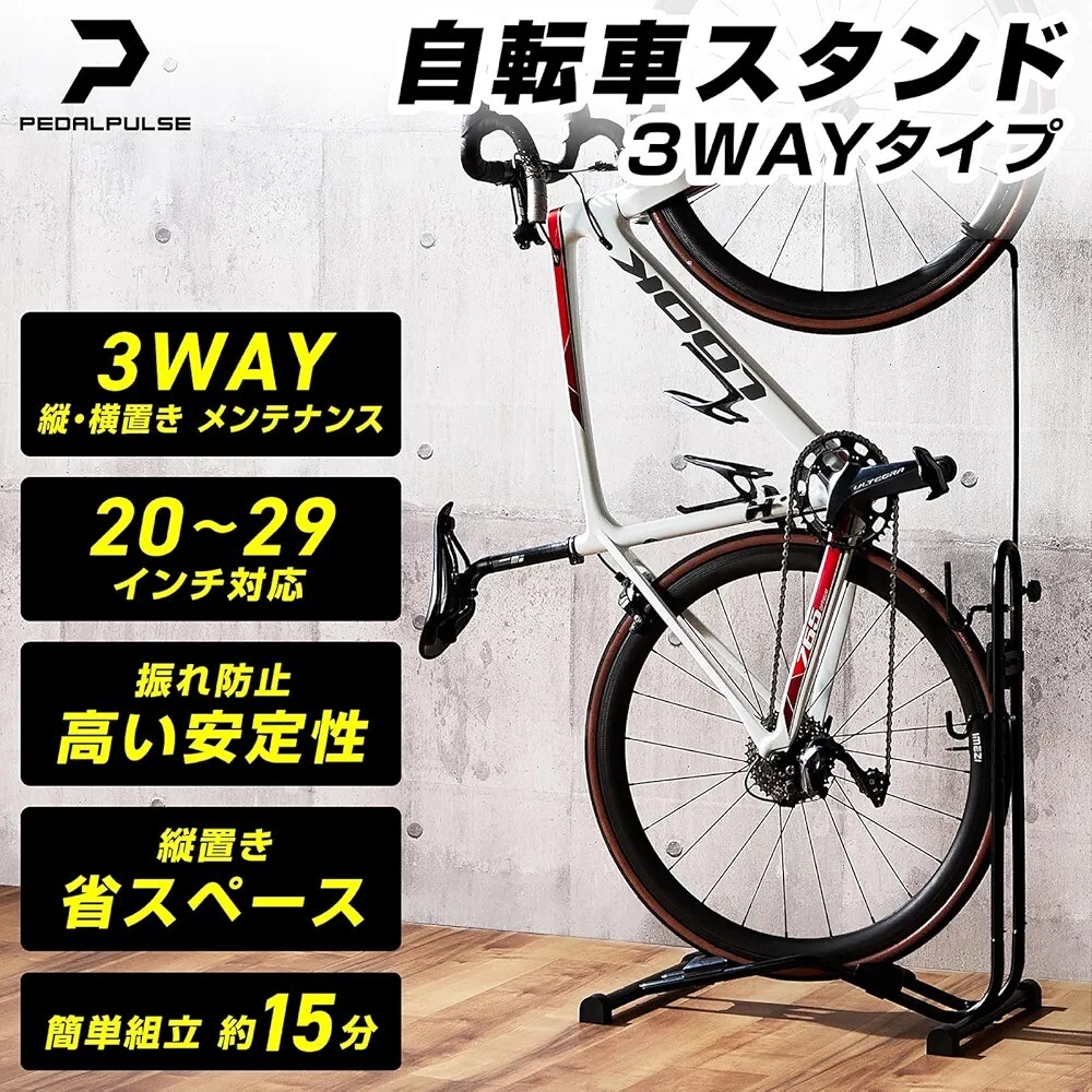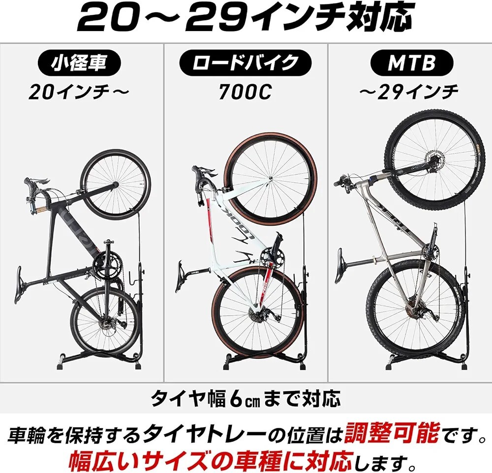 【3WAY仕様のマルチスタンド】①縦置きで省スペース、②掛け置きでチェーンやホイールの清掃・整備、③横置きでの一時保管。1台で3通りの使い方が可能です 【幅広いサイズの車種に対応】タイヤトレーの位置は調整可能。20~29インチの自転車に対応し、小径車、ロードバイク、MTBなど様々な車種に使用できます