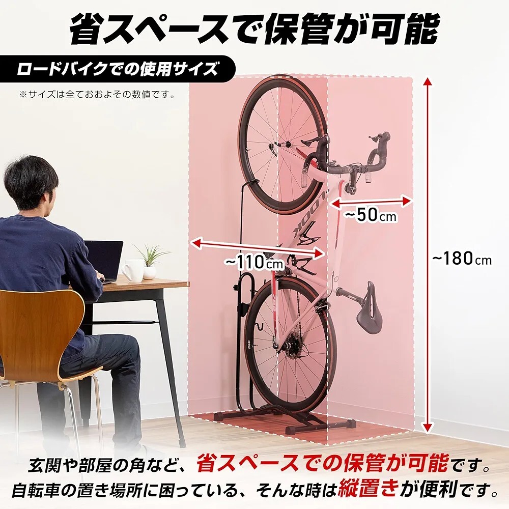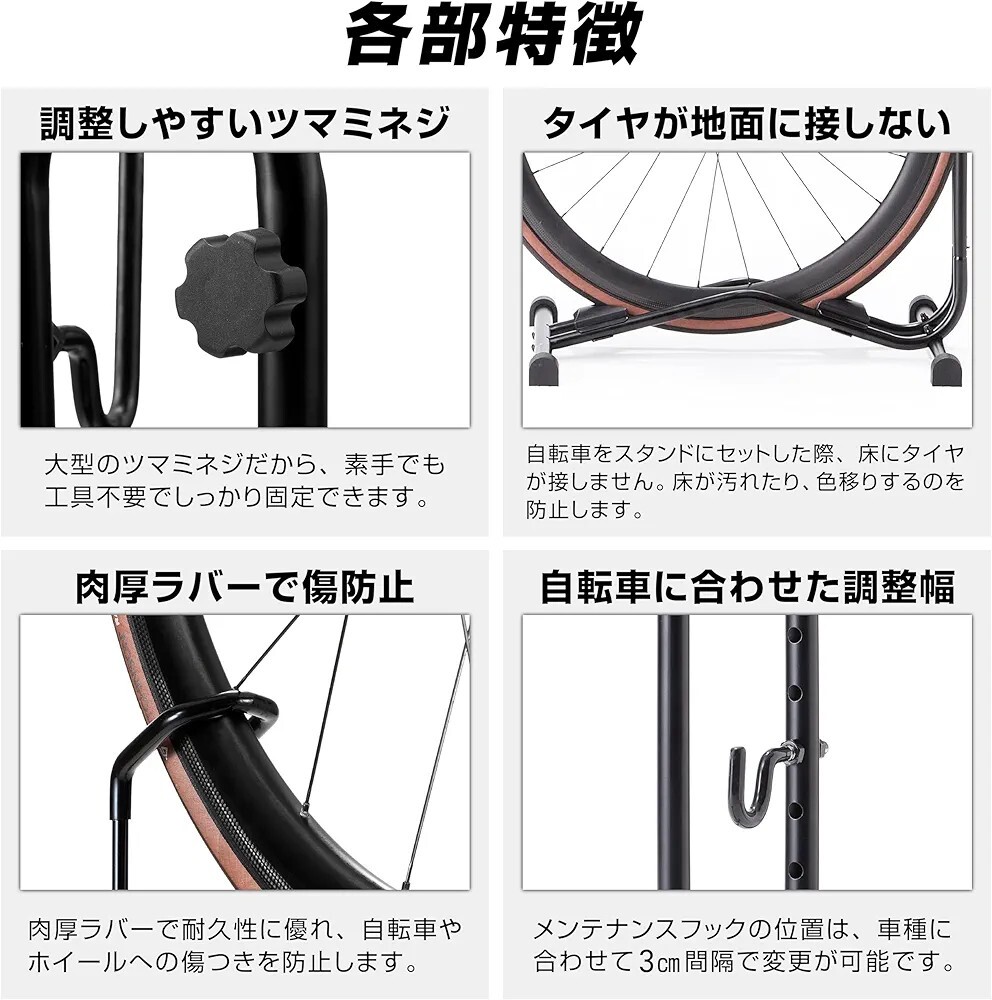 【振れ防止で高い安定性】3か所のタイヤトレーが後輪をしっかりホールドします。左右への振れを防ぎ、安定した固定を実現します ※耐荷重20kg以上まで 【省スペース保管に最適】玄関や部屋の隅など限られたスペースでも自転車を縦置きでき、収納効率がアップします