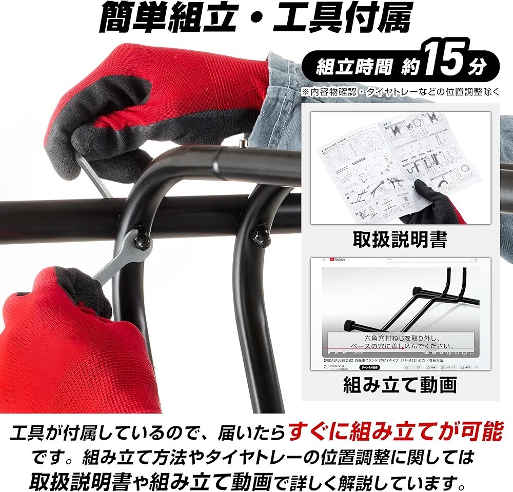 【工具付きで簡単組立】付属の工具で、約15分ですぐに組み立てが完了します。組み立てや位置調整の方法は、取扱説明書や組み立て動画で詳しく解説しています 【各部特徴】大型ツマミネジで素手でも簡単に固定可能/タイヤが地面に触れず、床の汚れや色移りを防止/肉厚ラバーでフレーム・ホイールを傷から守る/メンテナンスフックは3cm間隔で位置調整でき、車種に合わせて使いやすい