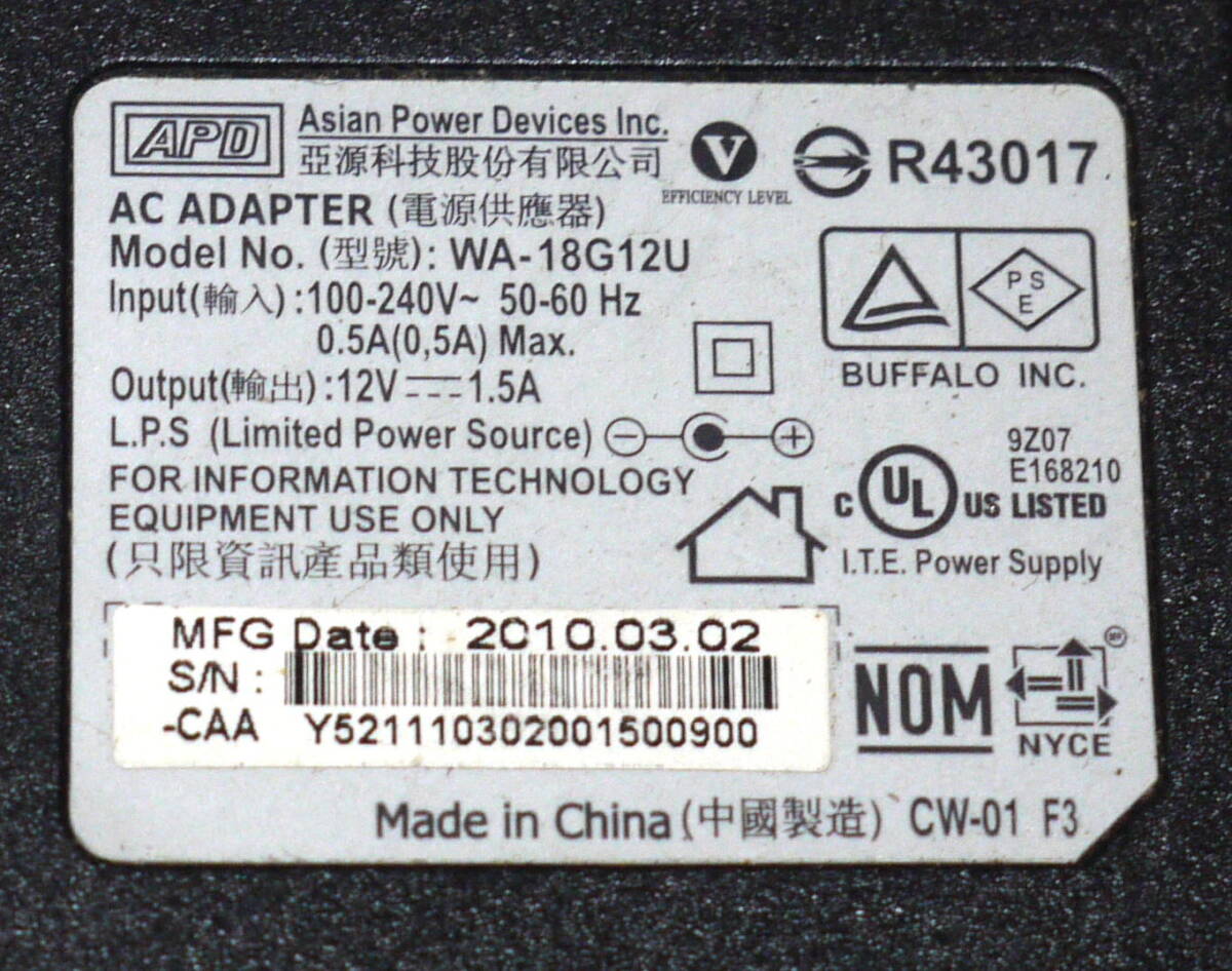 APD BUFFALO ACアダプター WA-18G12U  DC12V 1.5A  動作確認済 ②