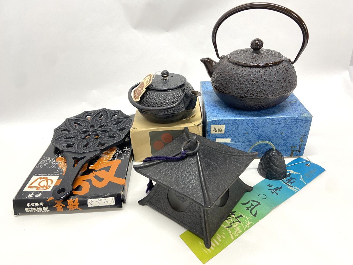 | 【R412】未使用 南部鉄器 岩鋳 盛岡 鉄器 急須 風鈴 釜敷 4点セット 金属工芸品 b | ||