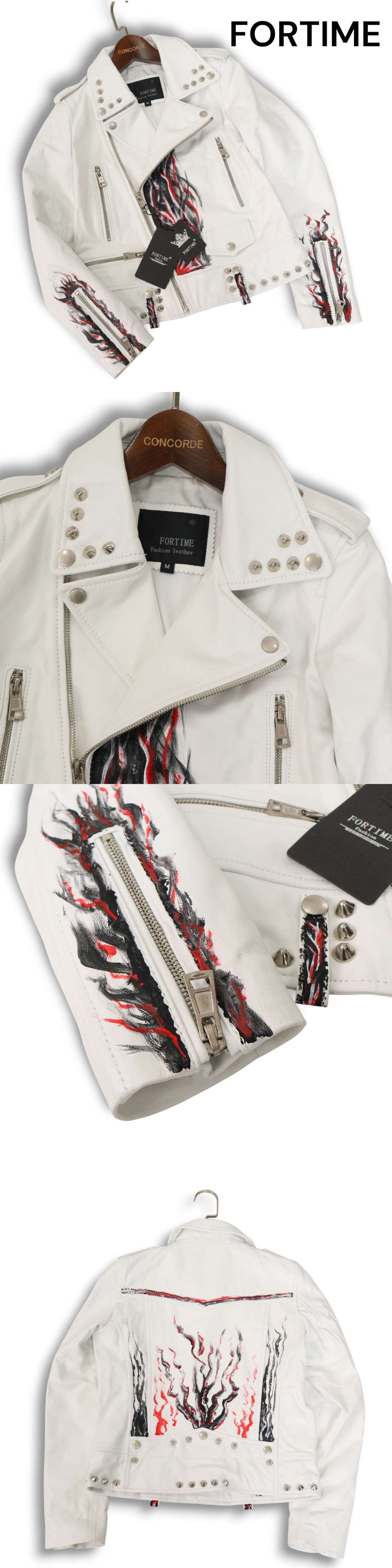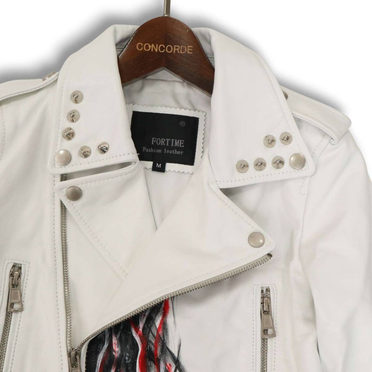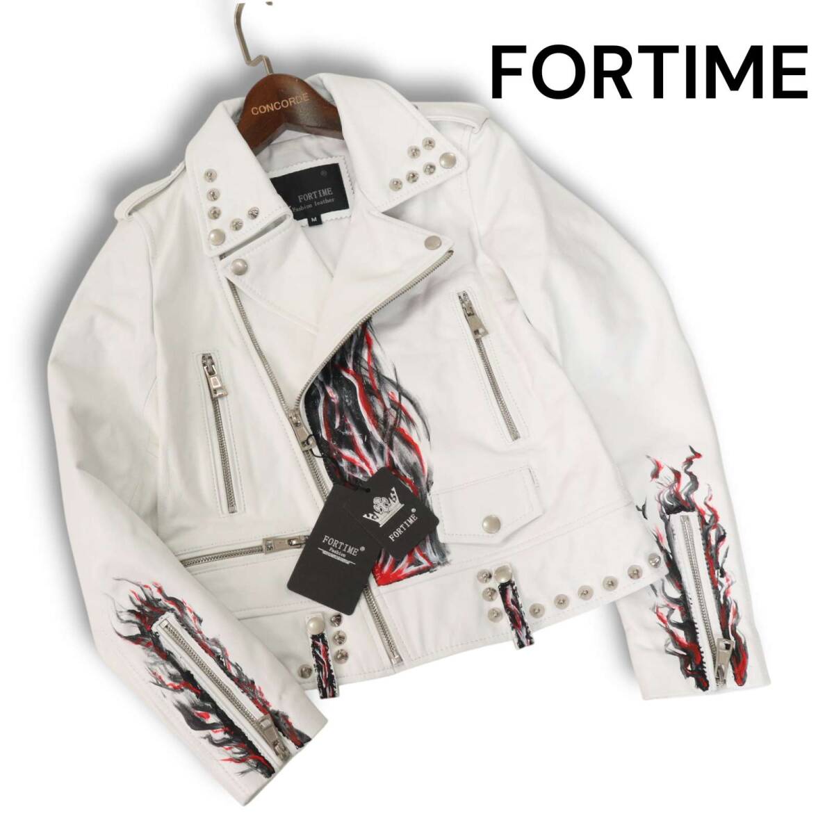 新品 未使用★ FORTIME フォータイム ペイント加工 本革 リアル レザー ダブル ライダース ジャケット Sz.M レディース 白
