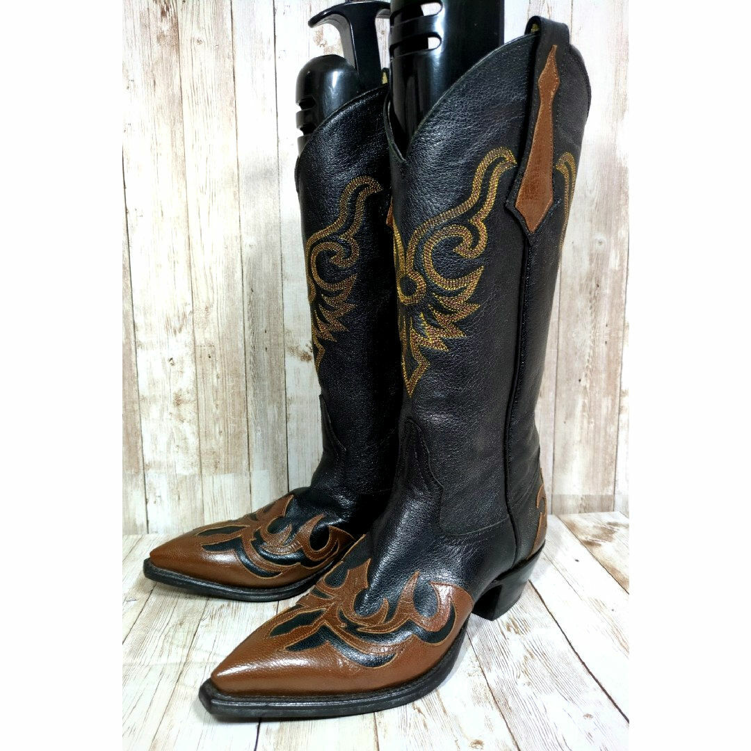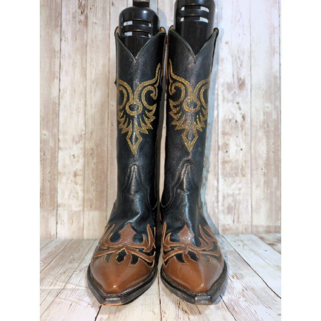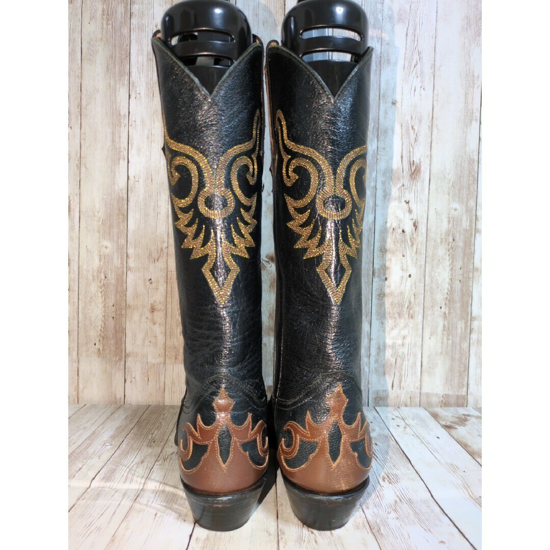 【Larry Mahan】ラリーマハン☆ウエスタンブーツ☆レザー☆6Bサイズ☆金ステッチ☆黒×茶×金☆レディース靴☆23cm相当