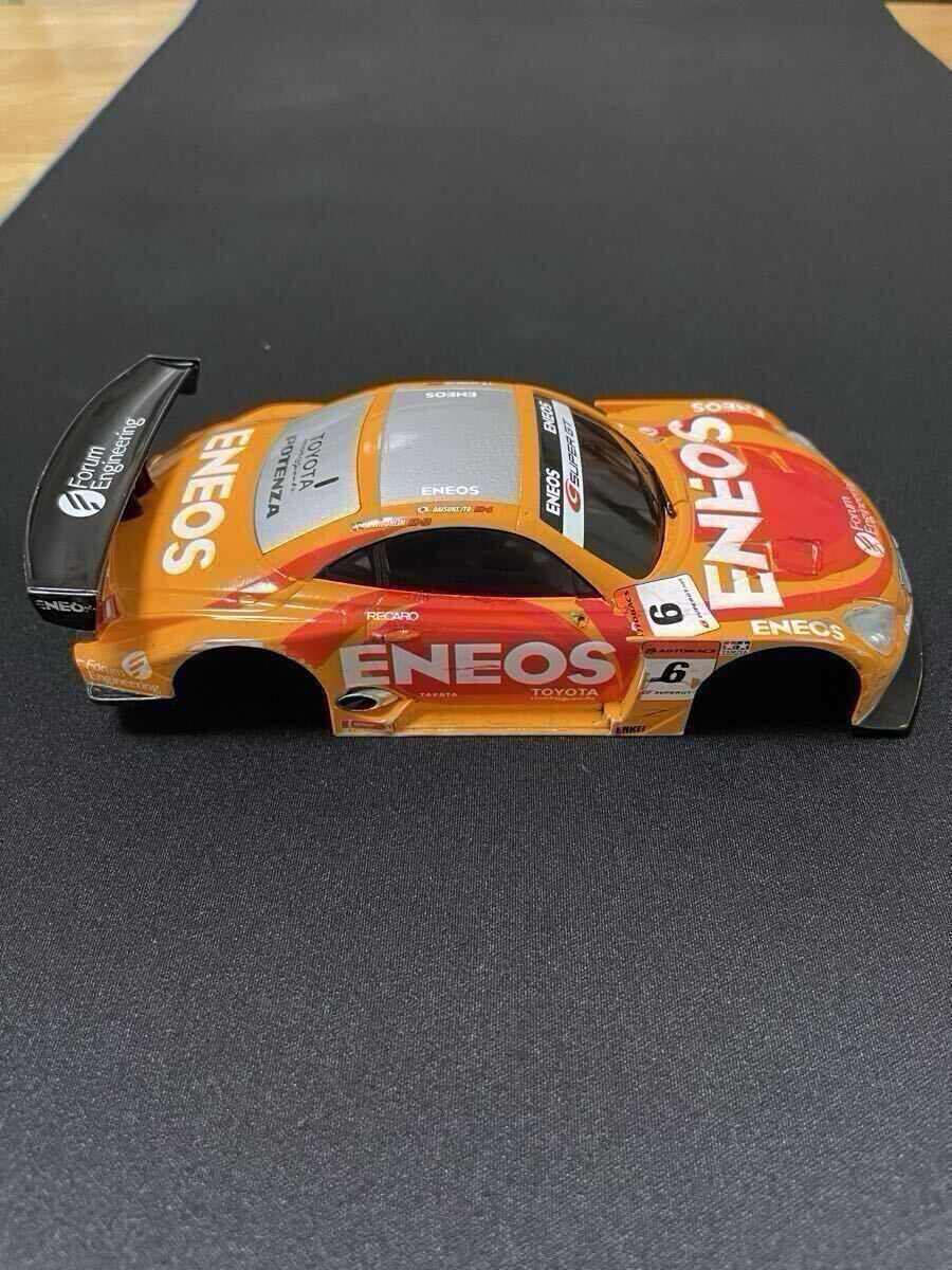 - ボディー:LEXUS SC430 ENEOSカラー(ホワイトボディーを塗装して作ったものです。カナードは無しで作ってあります(カナード取付穴はパテで埋めてあります)。ボディーの割れは見られません。ウィンドウパーツ上部は削って削除しています。バンパーとの干渉を防ぐためにリップスポイラー下部を削っています。)