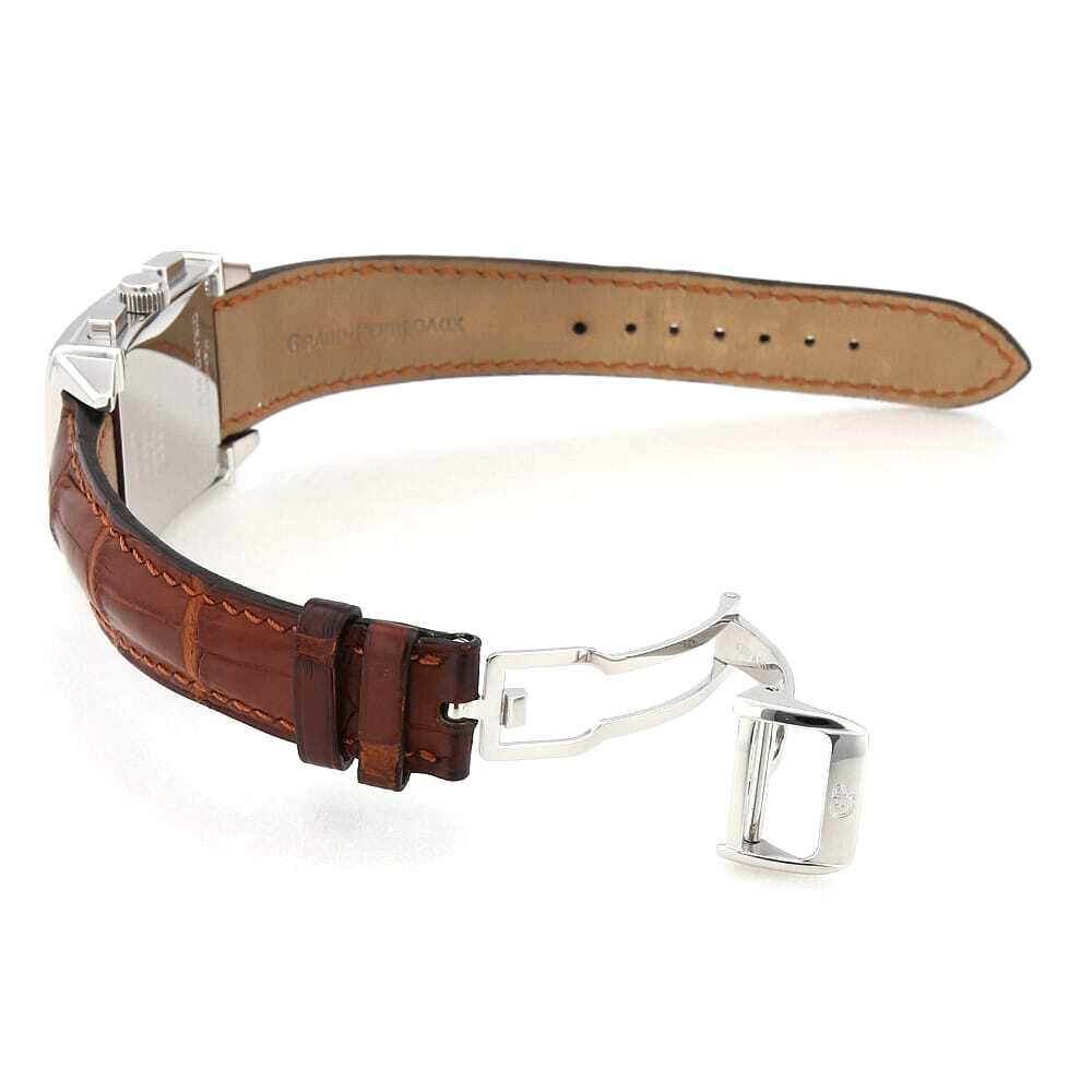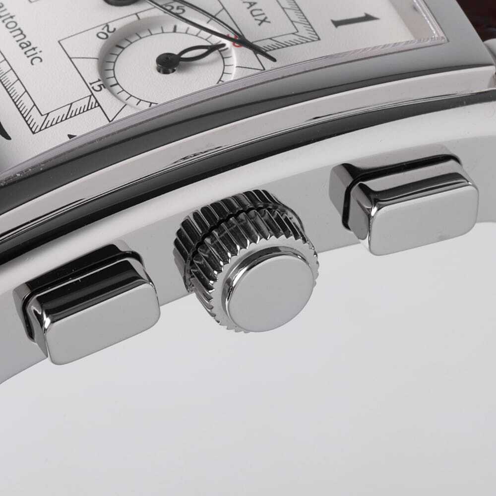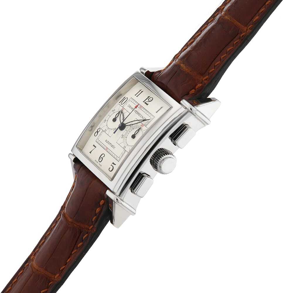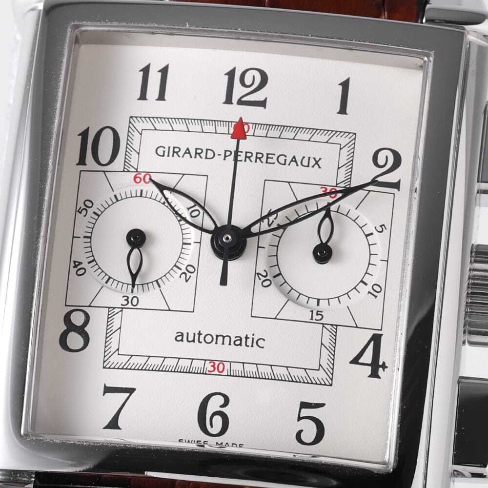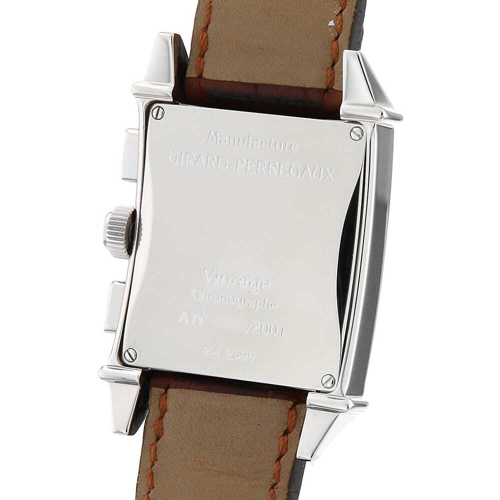 モデル情報 | 1945年、「ジラール・ペルゴ」はアールデコからインスパイアされたレクタンギュラーケースのモデルを創作しました。“ヴィンテージ1945”は1995年にその復刻版としてデザインされたコレクションとなり、3時から9時、12時から6時のラインが弧を描く球面的なケースデザインが芸術的です。こちらは“ヴィンテージ1945”のクロノグラフ機能を備えたモデルです。 |