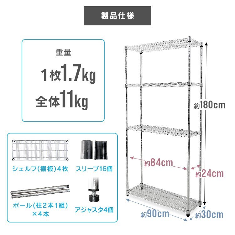 どんなお部屋にも合わせやすいスチールラックです。 ぐらつき防止アジャスター付き! クギやネジを使わずに簡単に組み立て出来ます! 棚の高さを自由に変えることができます。 一人暮らしのお部屋やリビング、キッチン、物置など場所を問わず活躍できます。 アパレルショップの店頭用やオフィスにも使用されています。 【仕様】 サイズ(約):幅90×奥行30×高さ180cm 重量(約):11kg 耐荷重(約):(全体)300kg / (棚板1枚あたり)75kg 材質:スチール(クロームメッキ)、ABS樹脂 他 【商品内容】 シェルフ(棚板) ×4 ポール(ジョイント式) ×4 棚板固定部品 ×16(+予備付属) 標準アジャスター(固定足) ×4 |