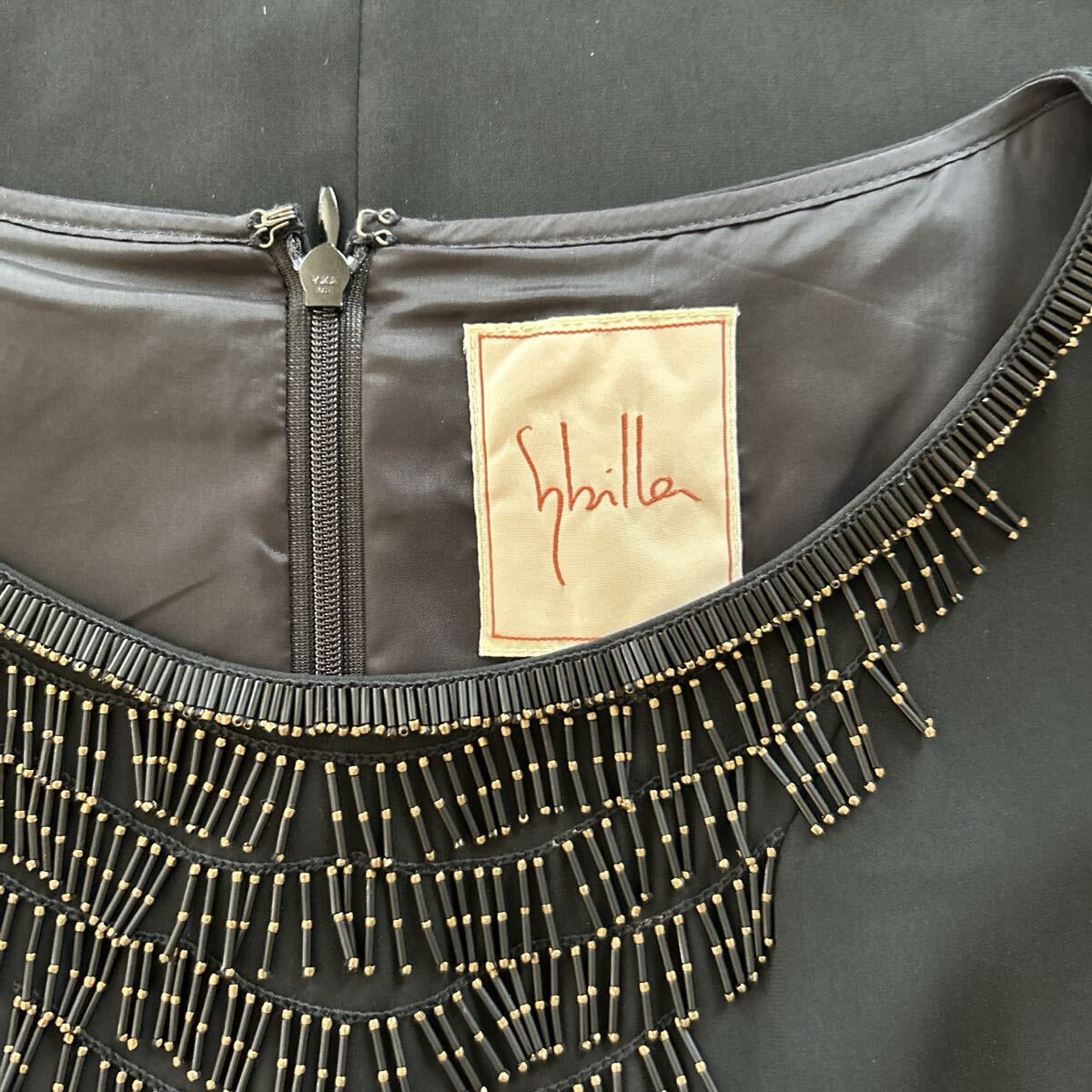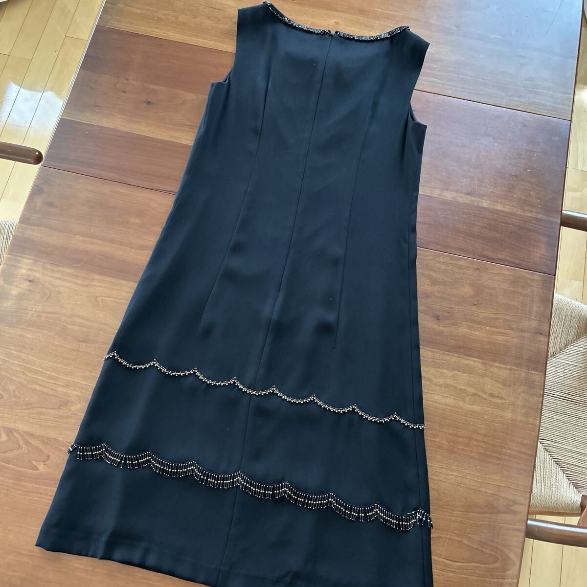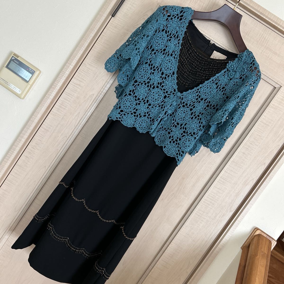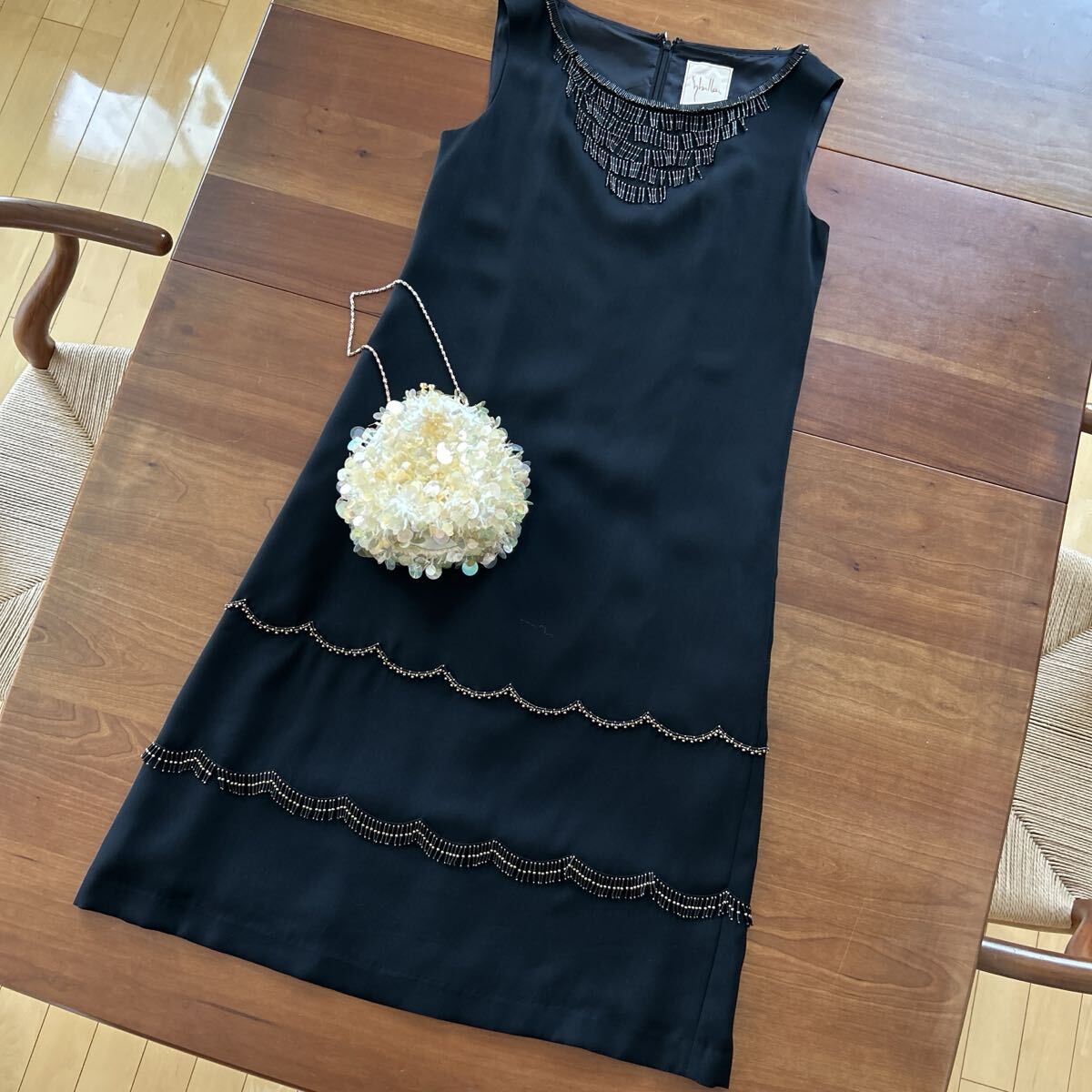 ワンピースは胸元、裾にブラックとゴールドのビーズがついていて1枚でも華やかに着ていただけます。
