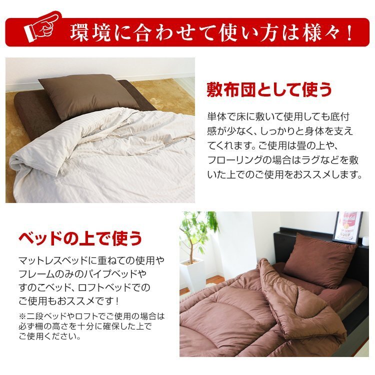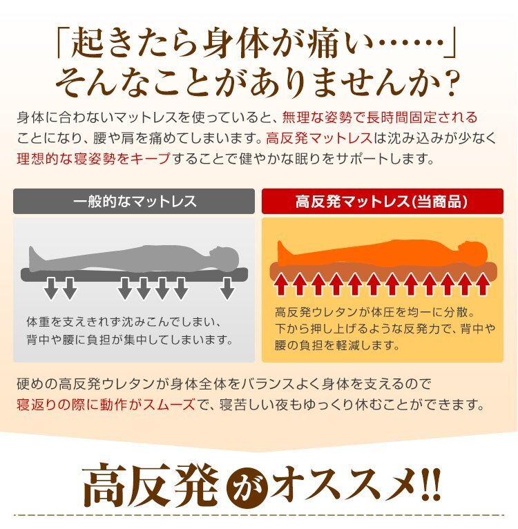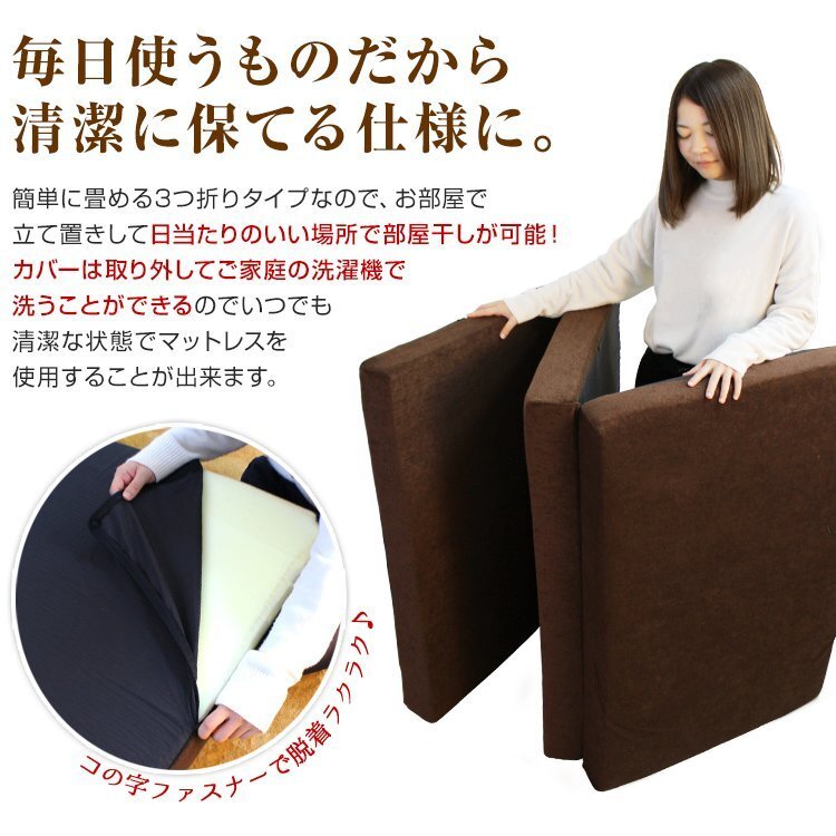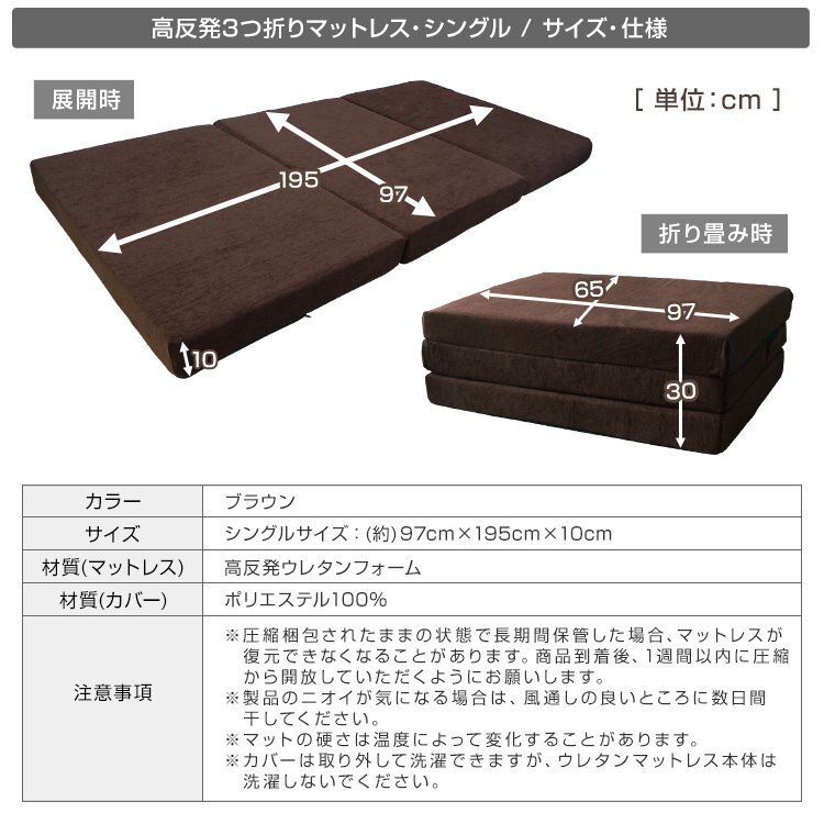 | 厚みたっぷり10cm! 適度な硬さで身体をしっかり支える、三つ折りタイプの高反発マットレスです。 柔らかいマットレスとは違い、身体の沈み込みを軽減した腰に優しい寝心地です。 高反発マットレスのウレタンフォームは弾性が高く、適度な硬さで身体を支えるので、底つき感もなくへたりにくいマットレスです。 寝返りが多い方や仰向けに寝ることが多い方におススメです。 簡単にたためる三つ折りタイプなので、お部屋で立て置きして日当たりのいい場所で部屋干しが可能! 取り外しやすいL字ファスナー付き洗えるカバーが付属しています! 【商品仕様】 カラー:ブラウン サイズ(約):幅97cm×長さ195cm×厚み10cm(シングルサイズ) 折り畳み時(約):幅97cm×長さ65cm×厚み30cm 素材:高反発ウレタン 、パイル生地 他 硬さ:210ニュートン ※耐熱仕様ではございませんので、電気毛布との併用はおやめください。 (マットレス シングル セミダブル ダブル 高反発 低反発 高反発マットレス 低反発マットレス シングル 高反発マット 低反発マット マット ベットマット ベッド 敷き布団 洗える カバー 寝具 人気 おすすめ ) |