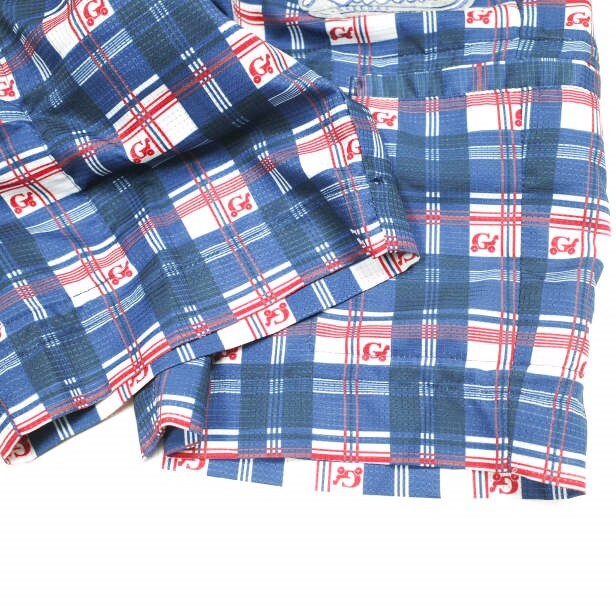 チェック柄はプリントで仕上げ、左足にフェルトワッペン、ヒップ上には尾錠付き。