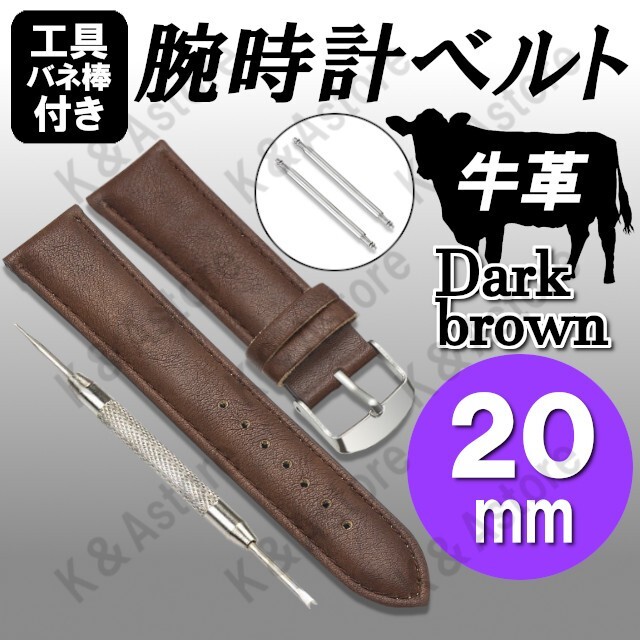 【匿名配送】腕時計 ベルト バンド 20mm 本革 牛革 レザー 無地 交換用 バネ棒 外し工具 バンド メンズ 男性 茶色 ダークブラウン